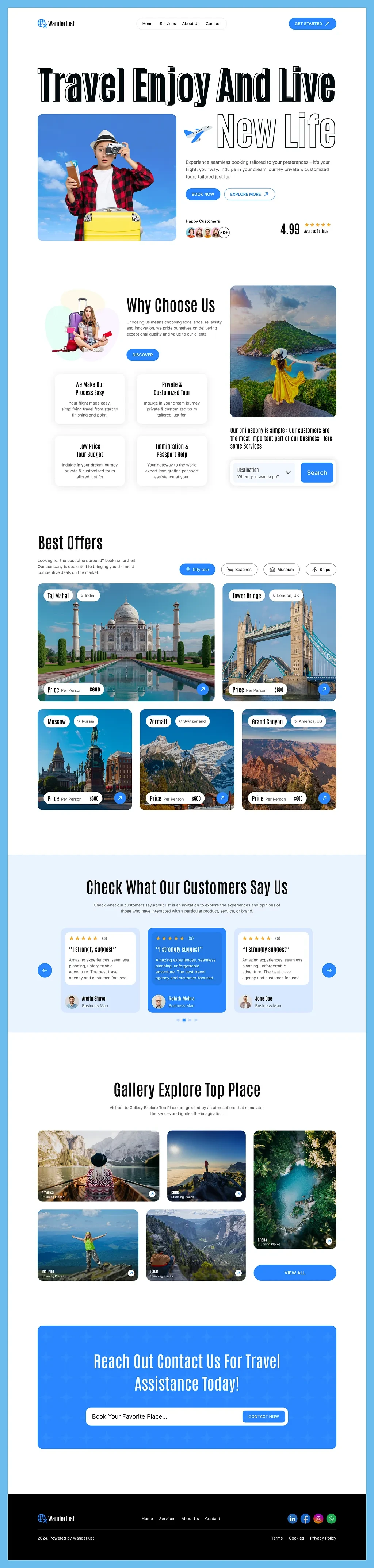 π Wanderlust β A modern travel landing page with stunning visuals, smooth navigation, and a seamless booking flow to inspire every journey.