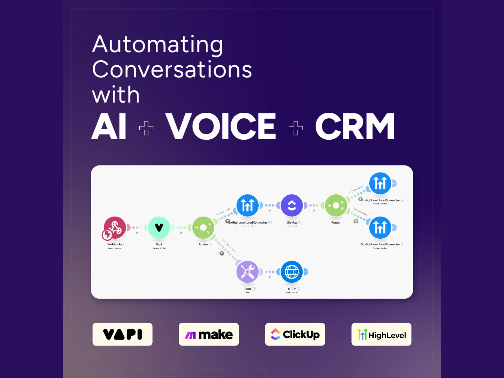 The conversation flows through Make (formerly Integromat) and updates your CRM