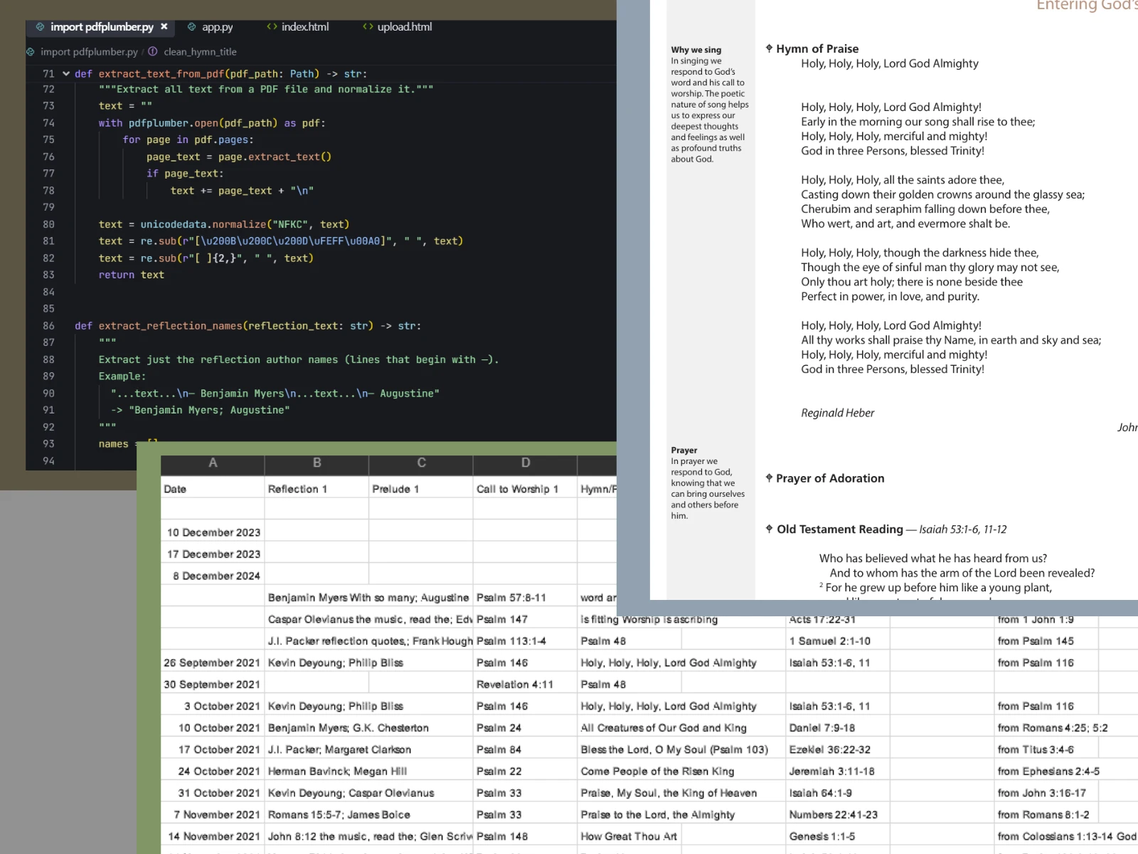 The process began with gathering several bulletin samples and identifying repeating sections. From there, I created regex patterns for each element (e.g., Call to Worship, Reflection, Hymn of Praise). I used iterative development: extract → test → refine, until the parser consistently returned usable data. Debug logging was included to track hymn matches and cleaning.