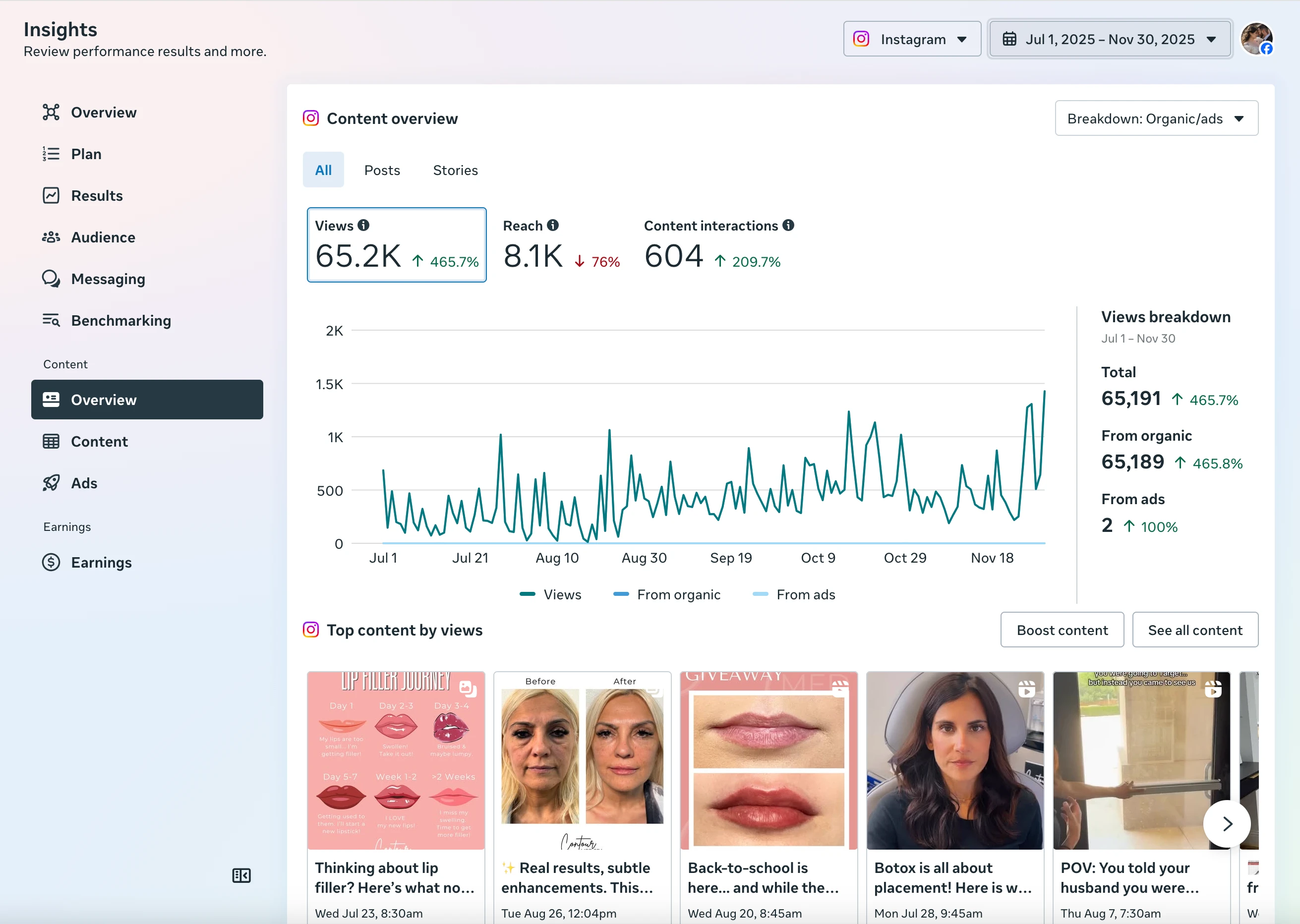 I managed Contour Medspa’s Instagram end-to-end with a fully organic, education-led strategy focused on consistency and relatability. By shifting the content toward founder-led Reels and messaging that spoke directly to busy moms, engagement and community interaction increased significantly. Over five months, the account saw a 465% increase in organic views and a 209% increase in content interactions, with campaign posts ranking among the top-performing content during the entire period.