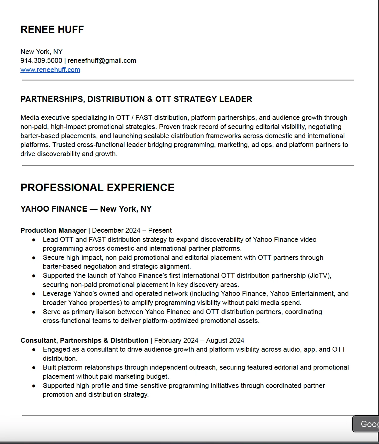 Snapshot of my OTT distribution and audience growth experience across Yahoo Finance, PeopleTV, HBO, and MGM/EPIX. Full resume available upon request.