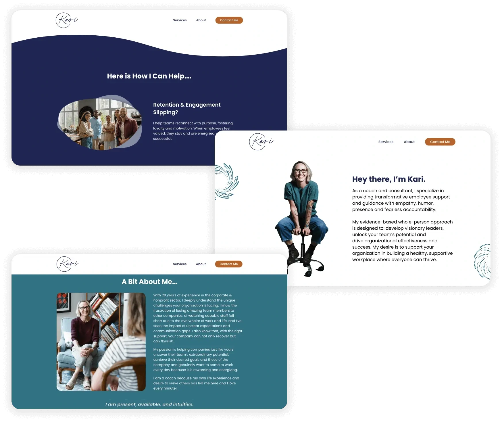 The website’s design was crafted to mirror Kari’s coaching philosophy—clean and professional. We used large, easy-to-read text to ensure that the site is accessible and user-friendly. The layout features wavy borders, water-inspired background imagery, and whirlpool icons to reflect Kari’s deep connection to water, an element she holds dear. This subtle yet consistent water theme adds a unique flair. While the blend of individual and group imagery effectively represents the two core services Kari offers.