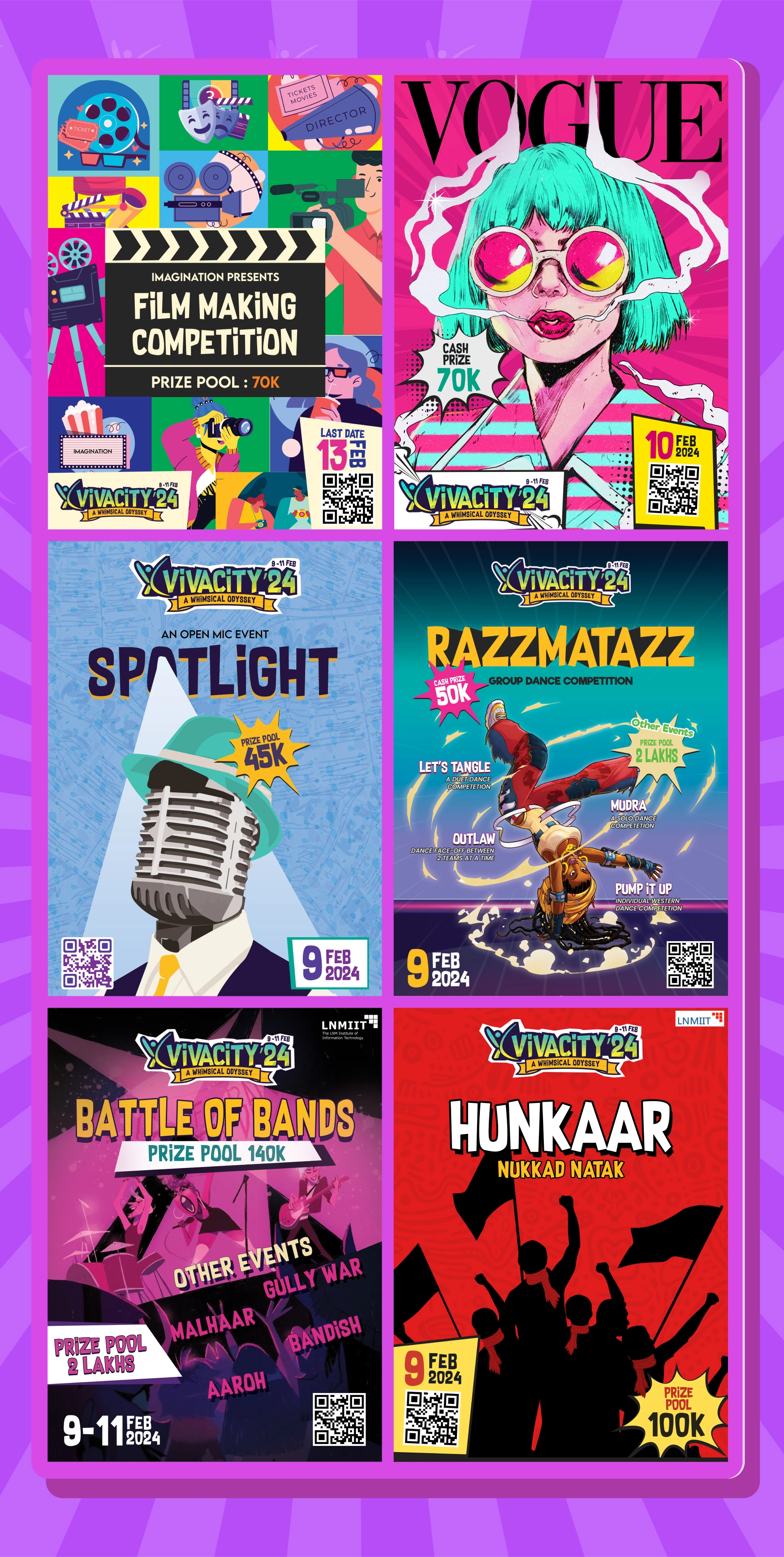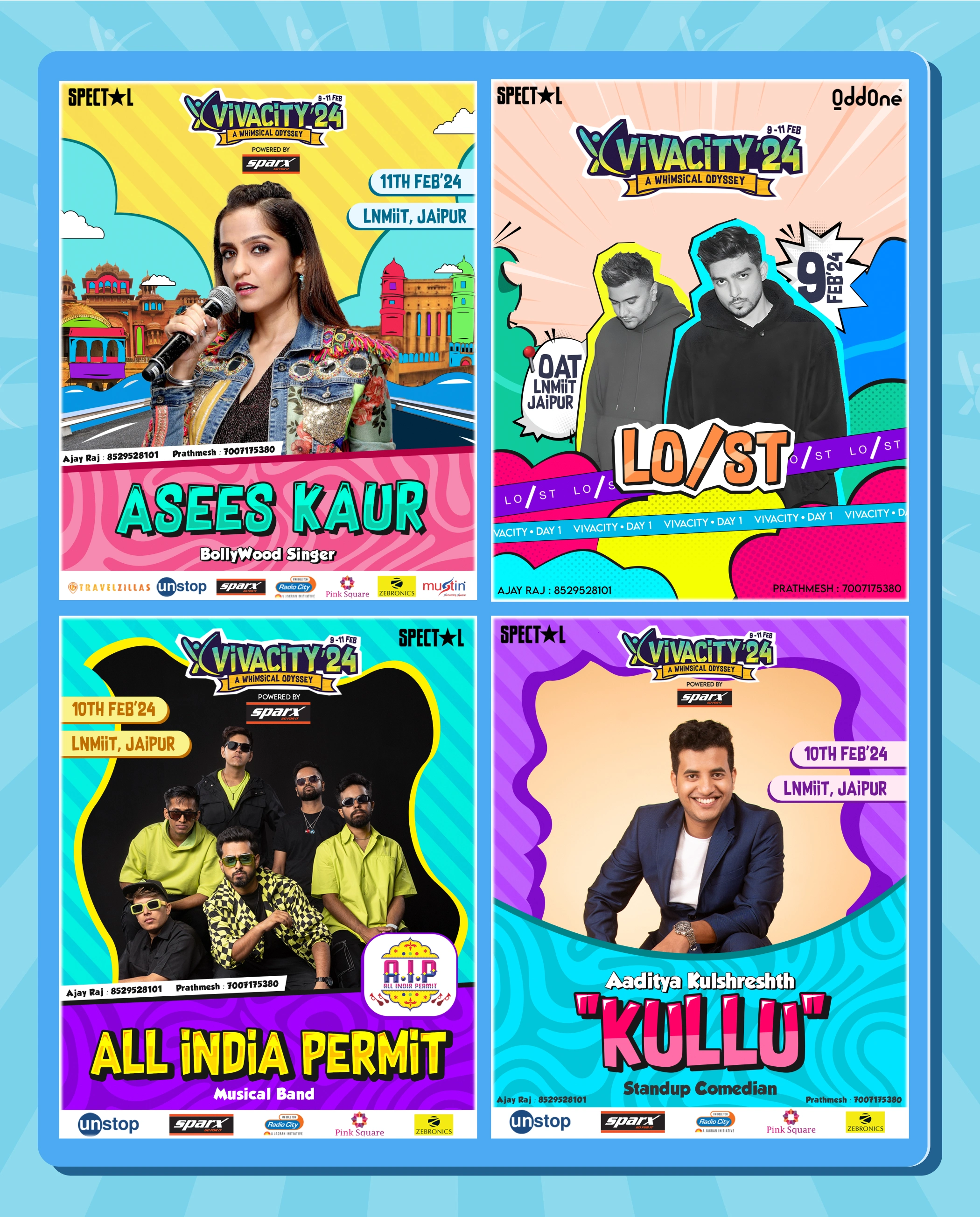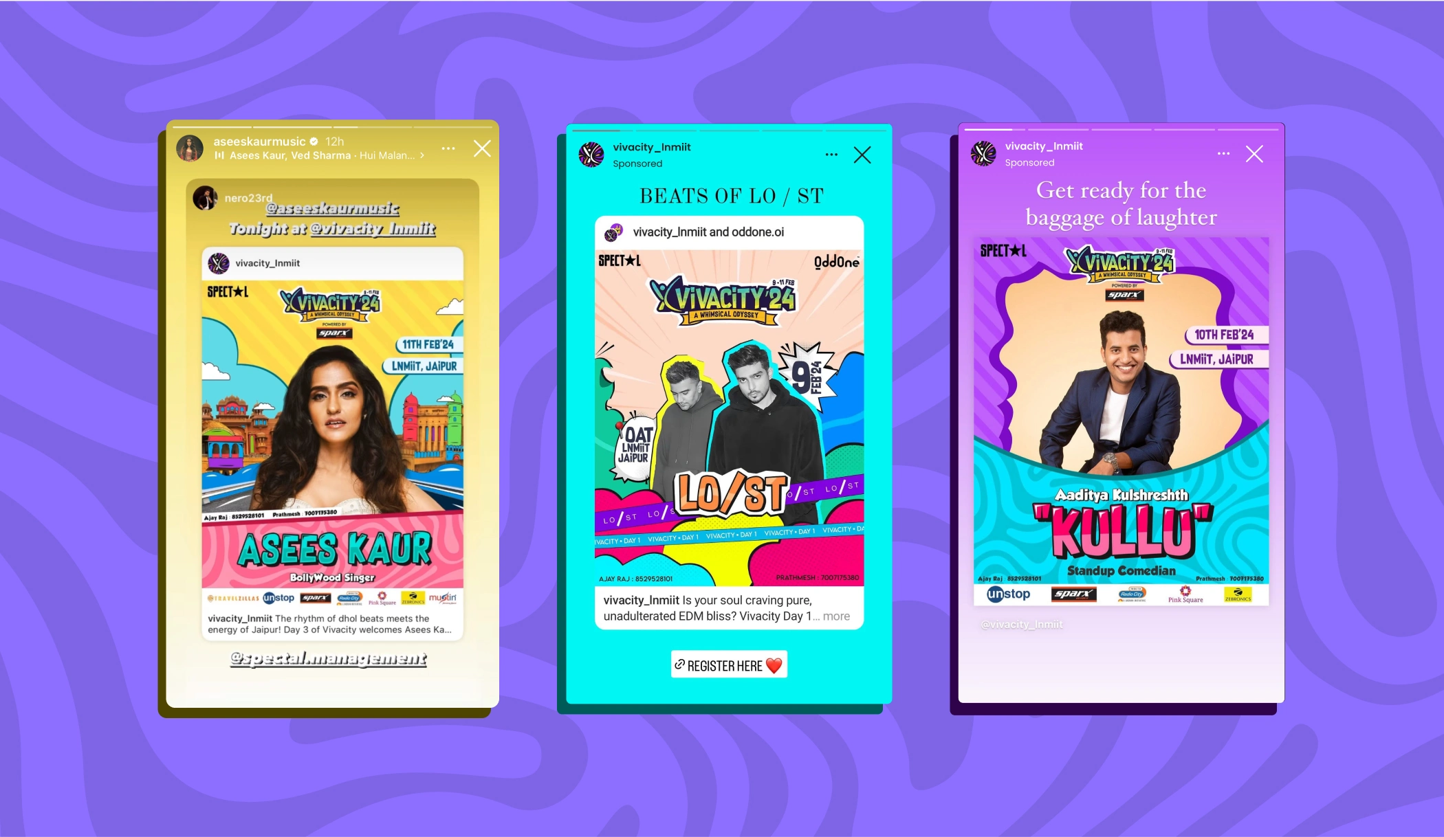 The next part of the design journey for Vivacity'24, the social media project, features artist flyers, event posters, and cutting-edge 3D and motion work.