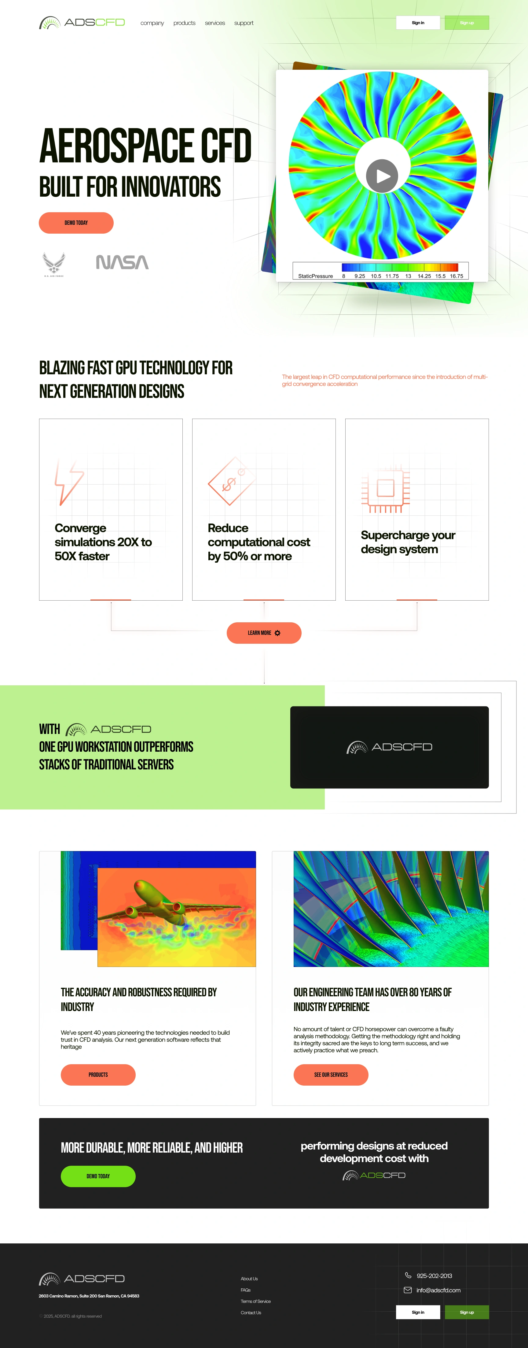 The landing page presents Aerospace CFD as a next-generation CFD platform, showcasing speed, efficiency, and engineering authority. By combining strong visuals, clear messaging, and intuitive flows, the site effectively communicates performance advantages and drives user engagement.