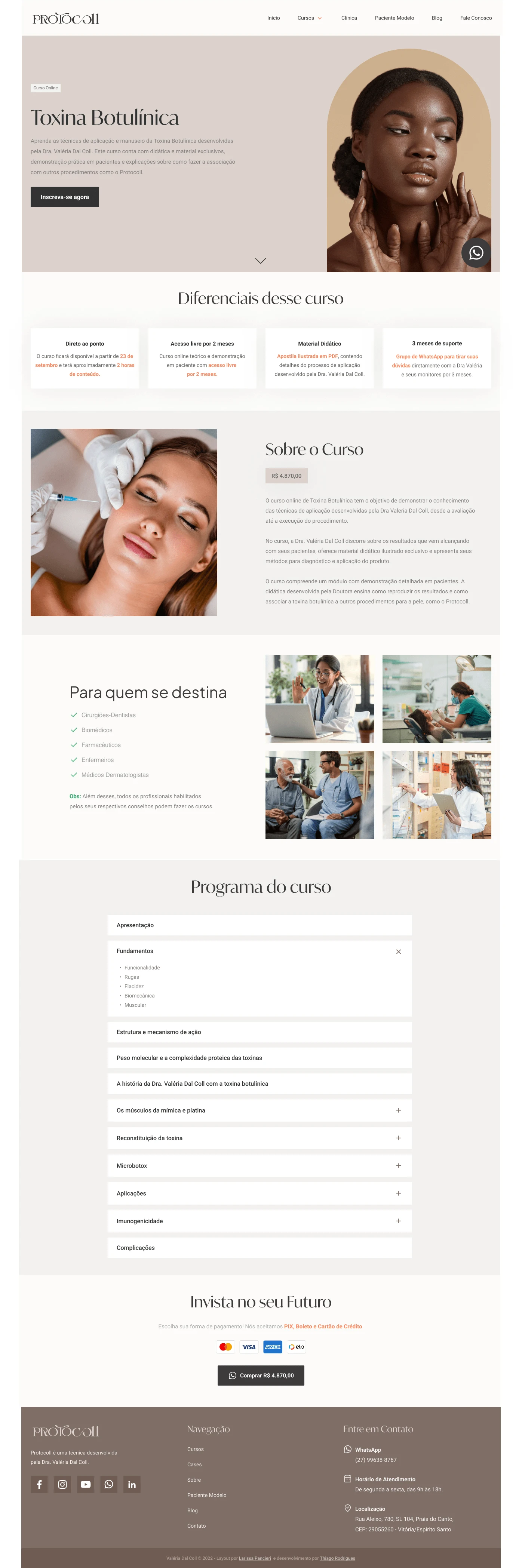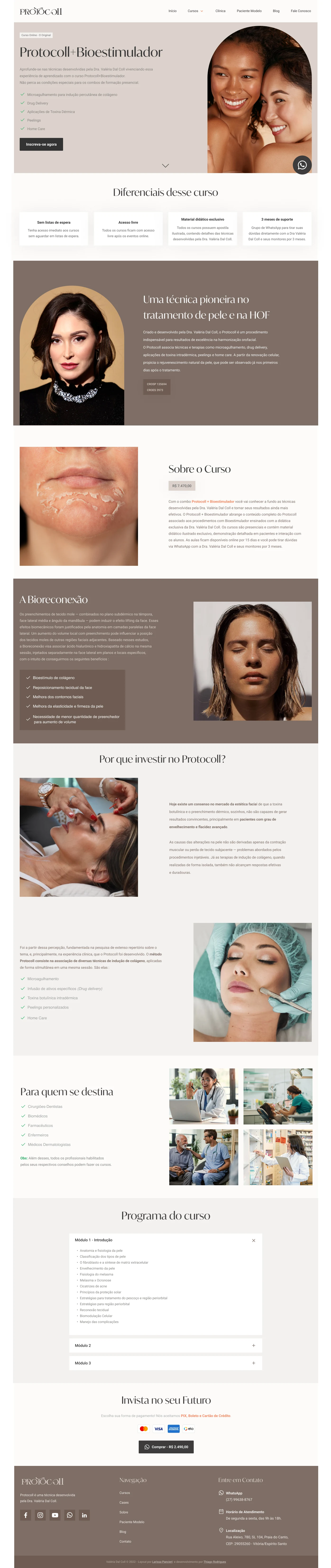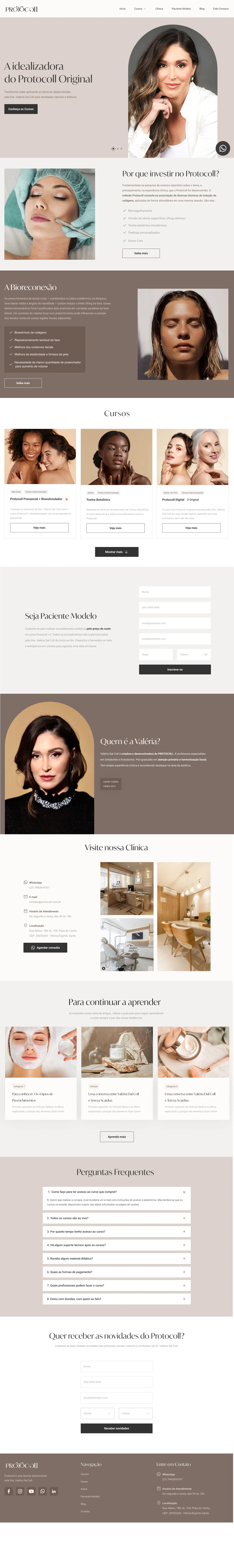 The goal was to create a website to clearly and effectively showcase Valéria's courses. It would include dedicated pages for each course, detailed explanations of the procedures, a FAQ section, the clinic's address, and a contact form. Additionally, it would highlight real cases with model patients and before-and-after comparisons.