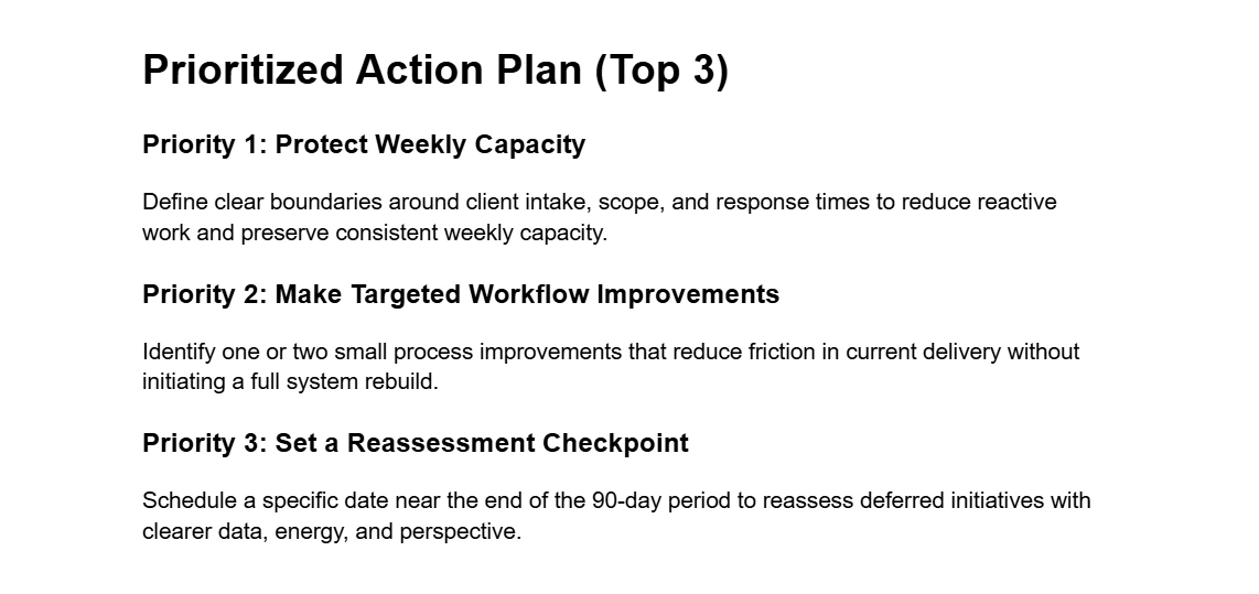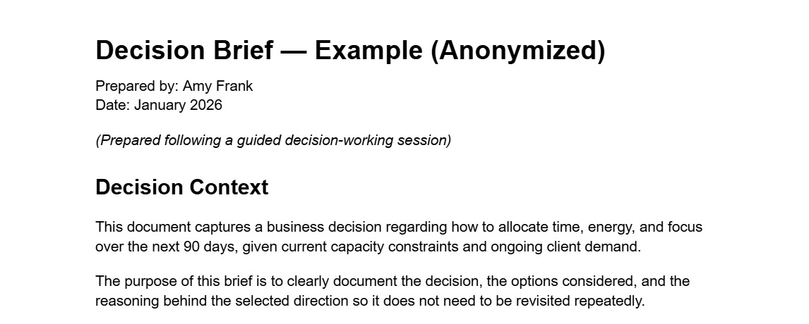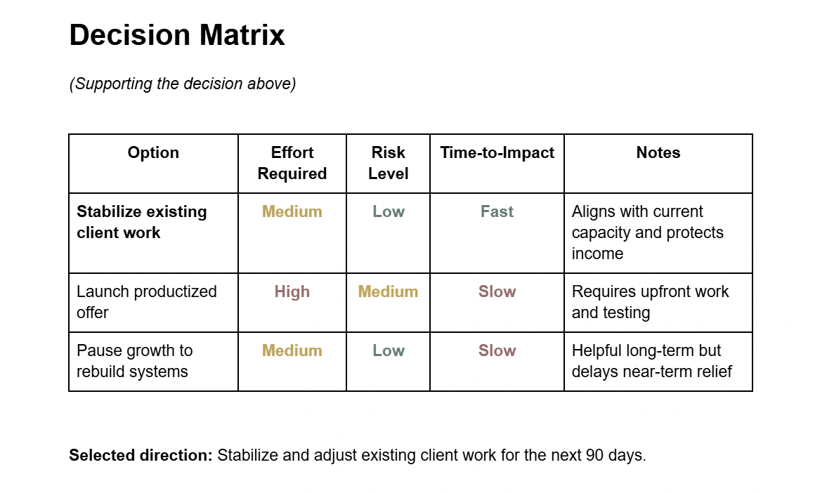 We clarified the specific decision that needed to be made for the next 90 days, surfaced the constraints shaping what was realistically possible, and compared options using simple criteria for effort, risk, and time-to-impact. Rather than treating every idea as immediately actionable, the session focused on identifying which options were viable now and which should be intentionally deferred.