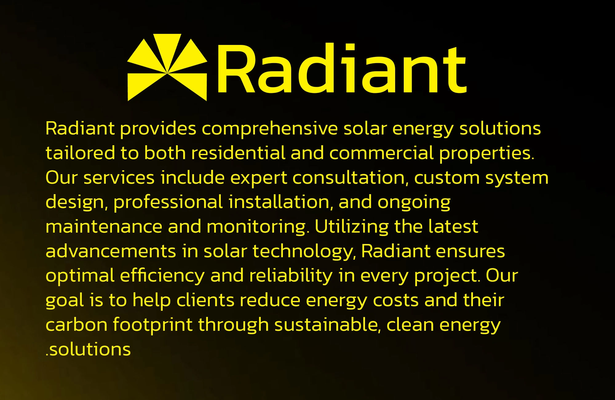 Radiant is a conceptual renewable energy brand crafted to showcase Vizualogy’s approach to clean, modern, and purposeful design. This identity reflects the spirit of solar energy while positioning the brand as innovative, reliable, and impactful for both residential and commercial markets.