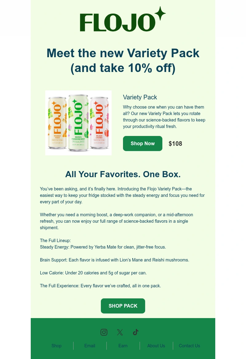 Flojo customers often stick to a single favorite flavor. The goal was to introduce the Variety Pack—a convenient way for fans to enjoy the entire range—without overwhelming them with text. The challenge was to balance the "science-backed" brand authority with a clean, lifestyle-focused aesthetic that drives immediate action.