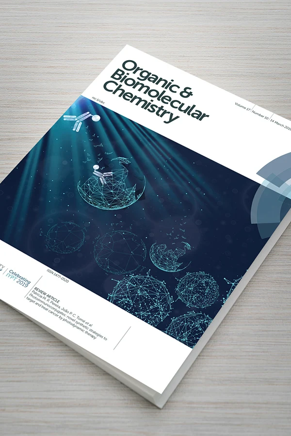 I have had the privilege of collaborating as a freelance designer with the prestigious Royal Society of Chemistry. To date, I have successfully designed three unique journal covers that seamlessly blend artistic creativity with scientific rigor. These covers were created for publications featuring groundbreaking research conducted by leading professors from universities and colleges across Europe and the United States. Their research focuses on innovative methods to target and eliminate cancer cells using light-based therapies and specific chemicals, offering a promising alternative to more aggressive treatments like chemotherapy.