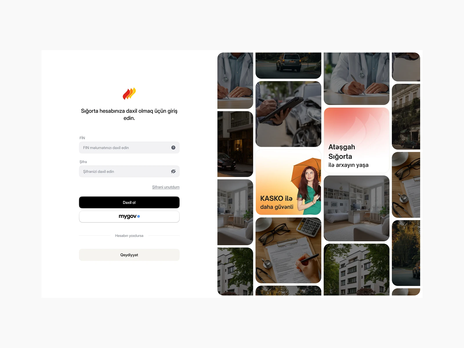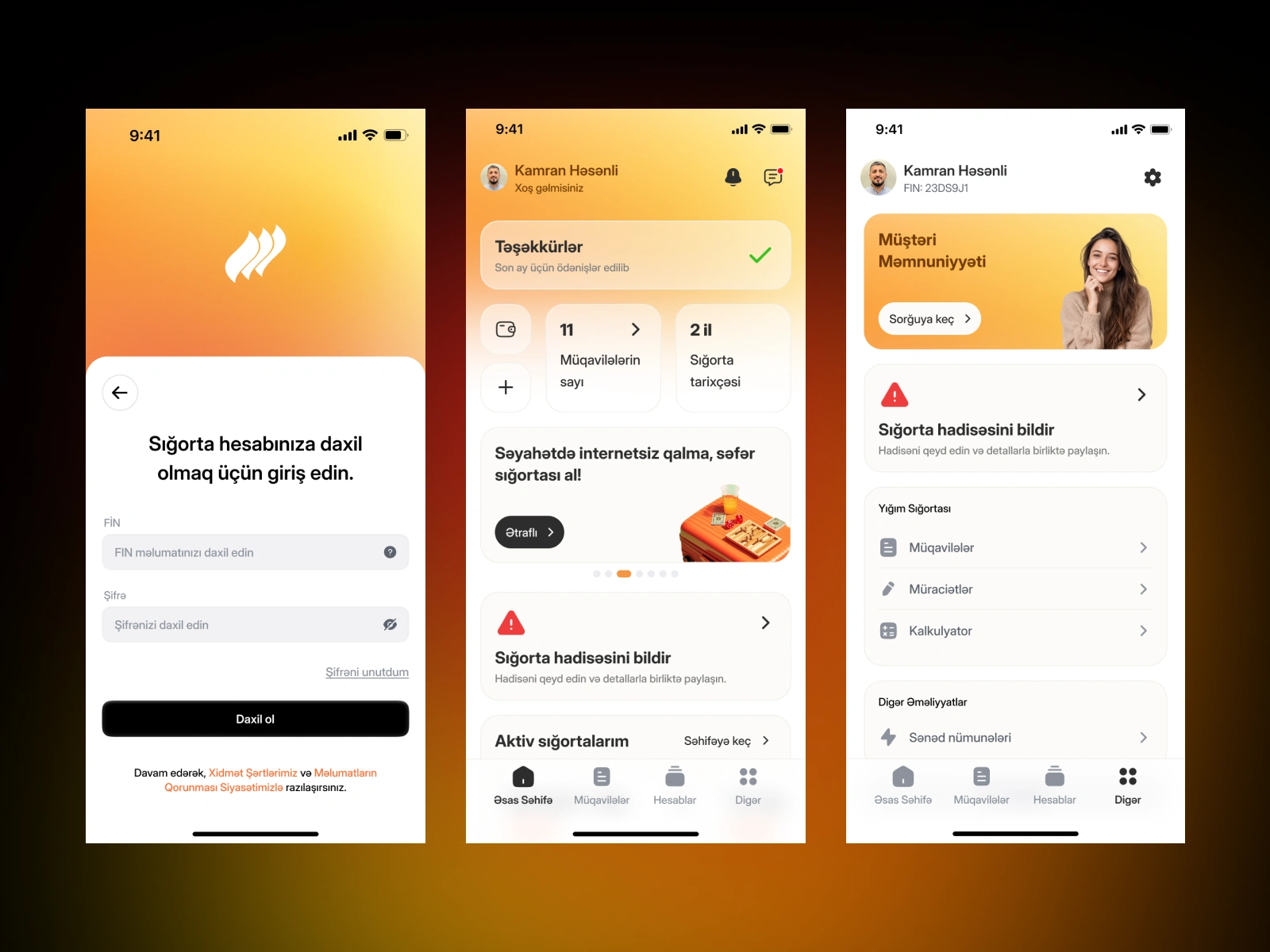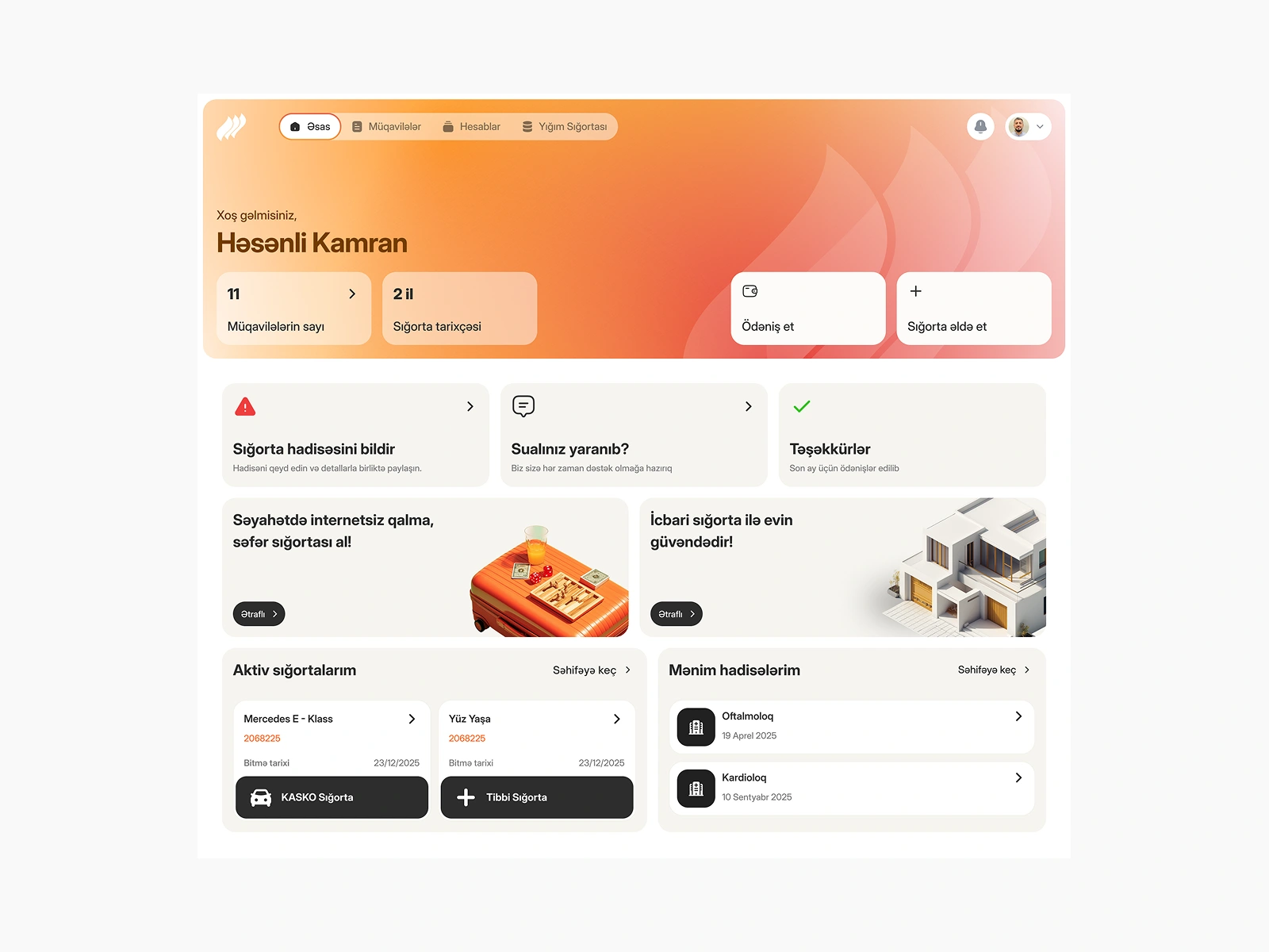 This dashboard concept is designed to simplify how Atəşgah customers manage their insurance policies. It delivers a warm, personalized experience with a clean layout, soft gradients, and intuitive navigation. Users can instantly access their active policies, make payments, report incidents, track claims, and explore new insurance options — all from one unified home screen. The design focuses on clarity, accessibility, and trust, creating a seamless digital experience for insurance management.