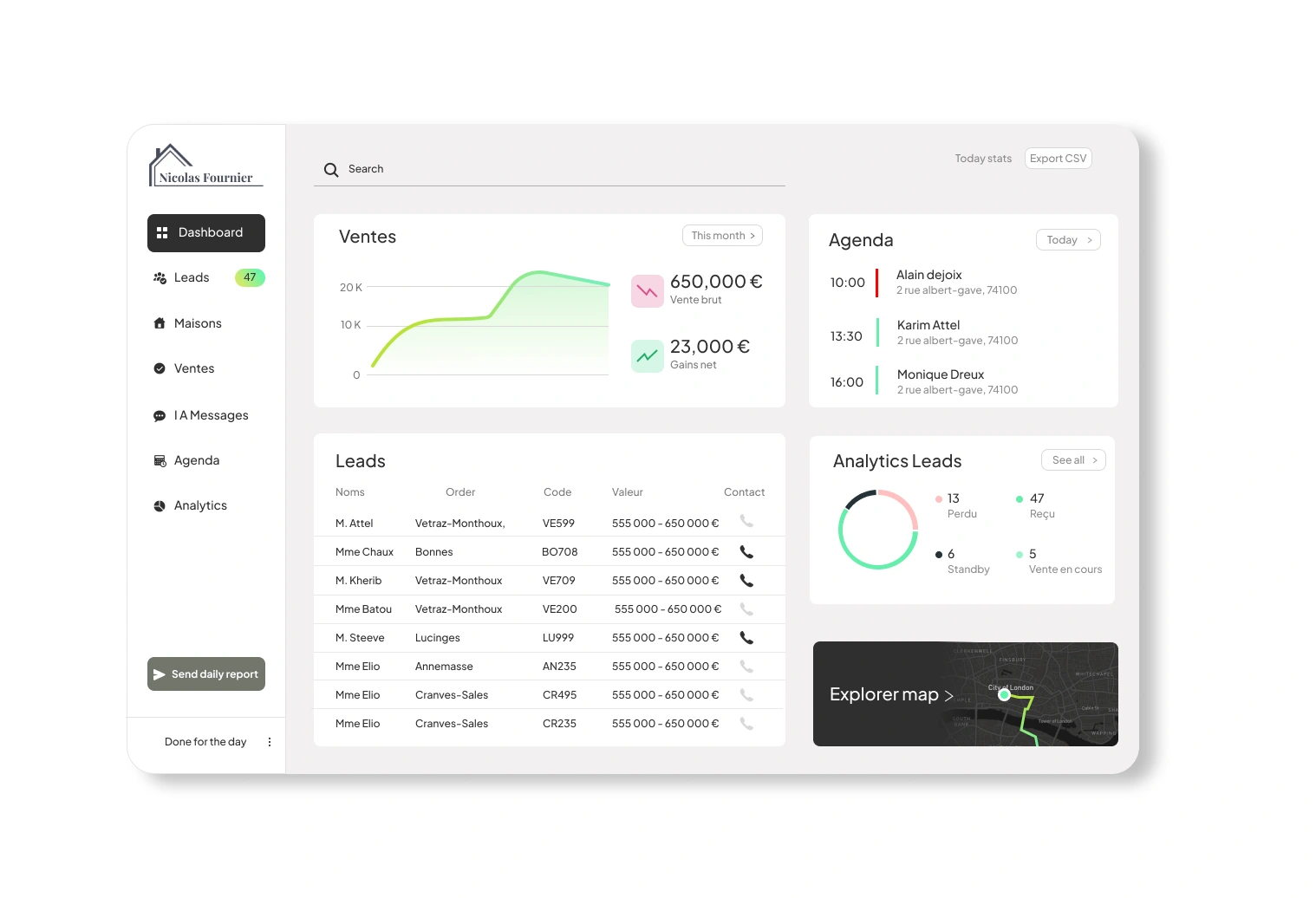 Streamline the workflow by centralizing information. Reducing friction in everyday tasks: property files, tracking lead status, and preparing for appointments.