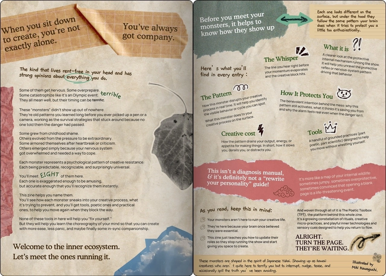 The project began as a conceptual framework by Cuauhtemoc Velázquez López, who conceived the eight “monsters” as protective inner forces rather than flaws to eliminate. Each monster reflects a familiar creative block pattern; overthinking, perfectionism, shame, freeze, comparison, and more.