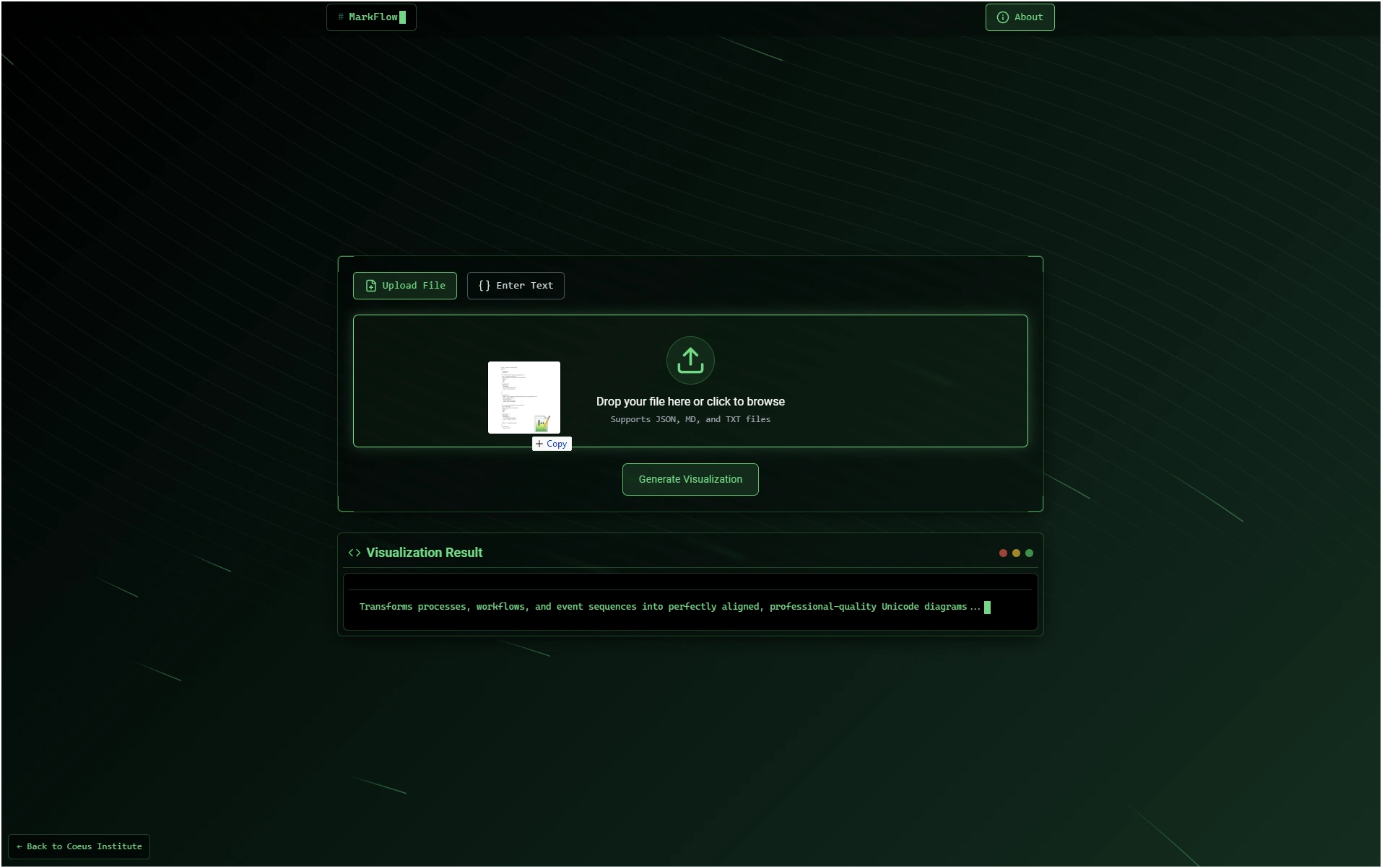 MarkFlow is a micro web application designed to transform textual descriptions or blueprints of processes, workflows, pipelines, and event sequences into visually structured Unicode/ASCII diagrams. It provides a user-friendly interface where professionals can input information via file upload (JSON, MD, TXT) or direct text entry, and then, with a single click, generate a diagrammatic representation of that information.