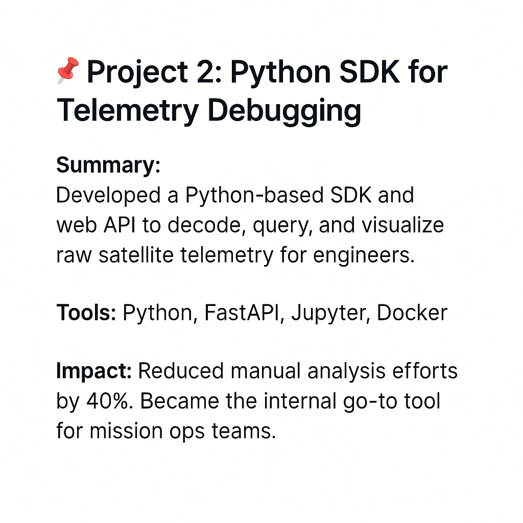 Built a telemetry SDK & API to decode satellite data. Cut manual analysis by 40% and became the go-to tool for mission ops.