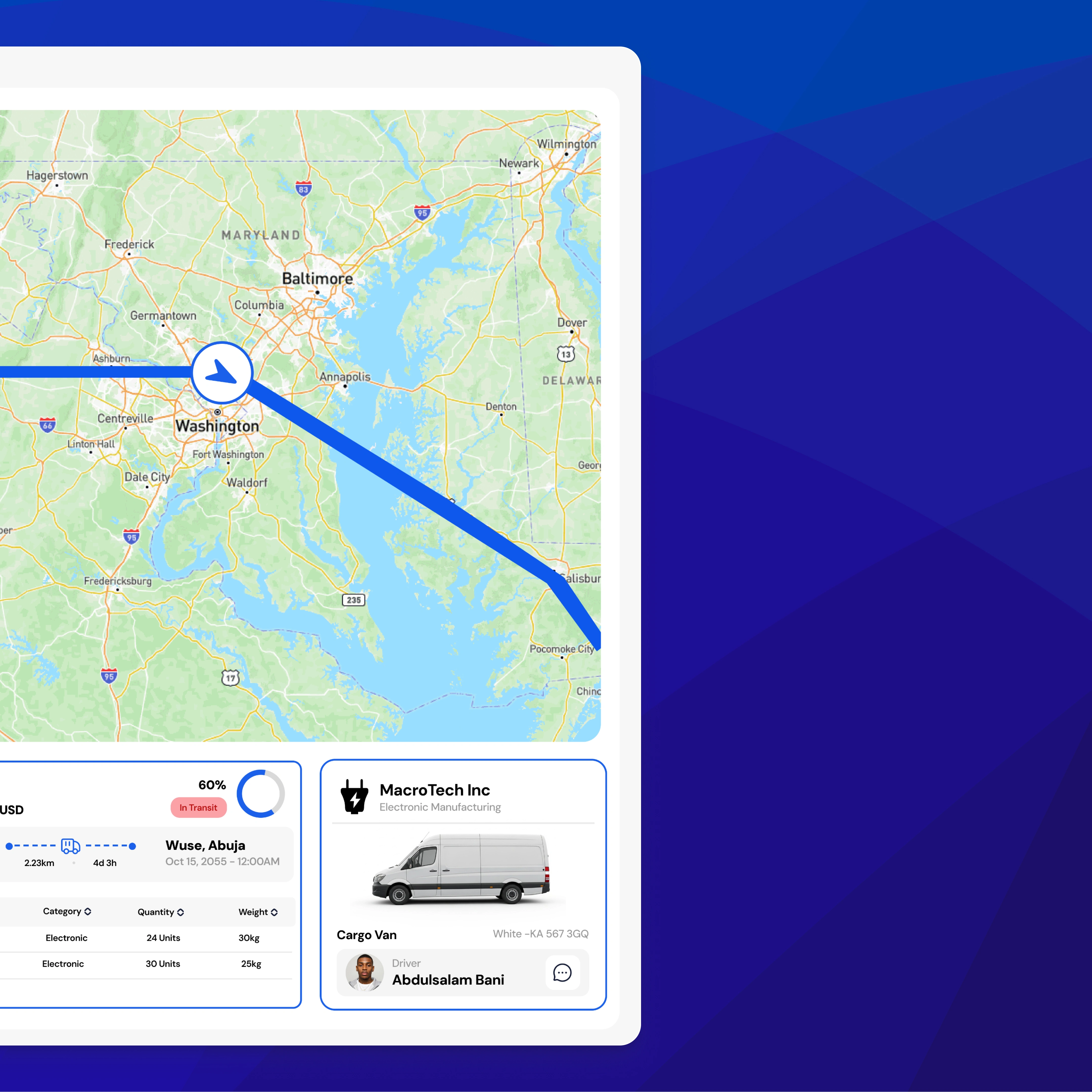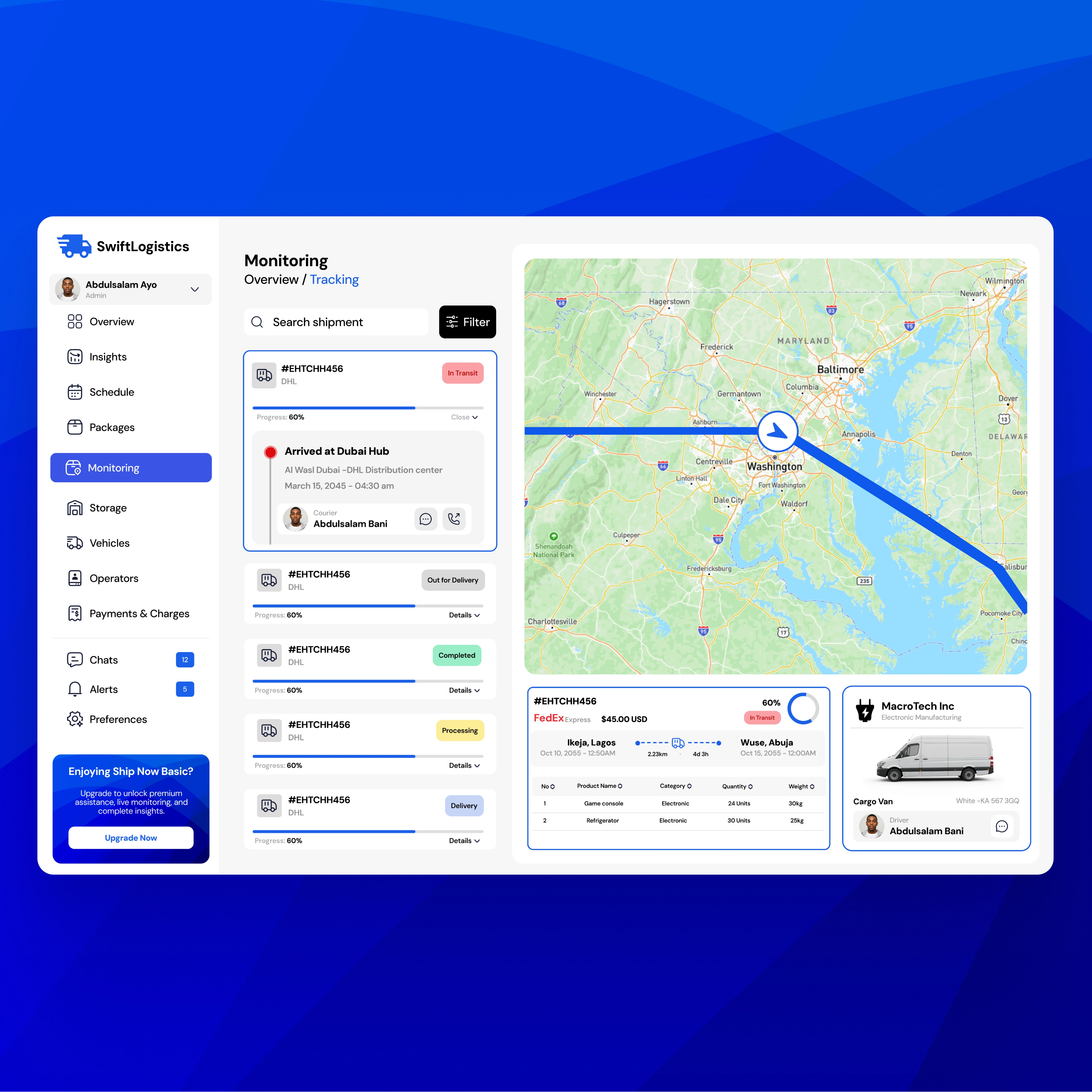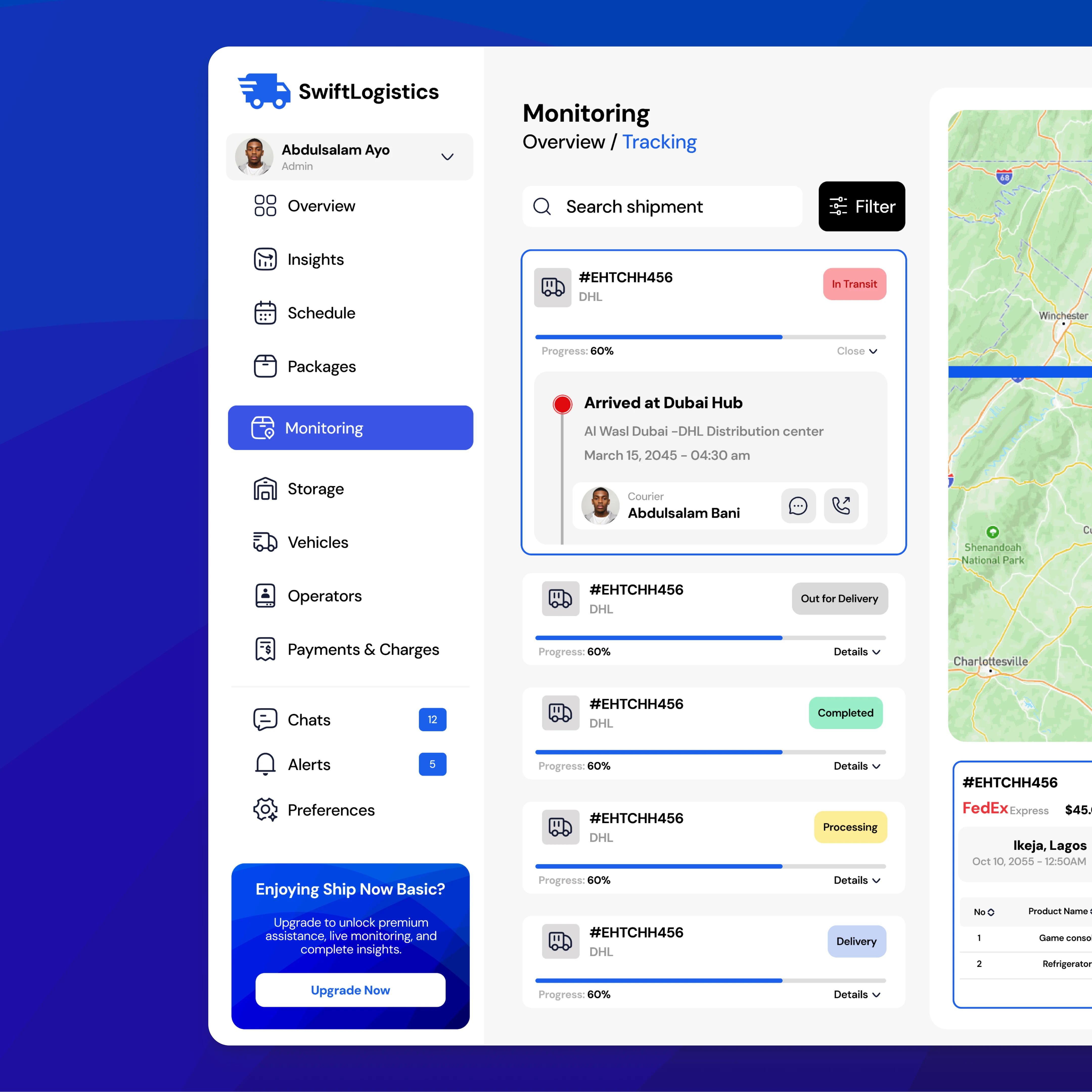 Live map tracking with flight path visualization, color-coded status indicators (In Transit, Completed, Processing, Delivery), comprehensive shipment cards showing tracking numbers and progress percentages, detailed cargo manifests with product quantities and weights, operator assignment and contact management, and search and filter functionality for quick shipment location.