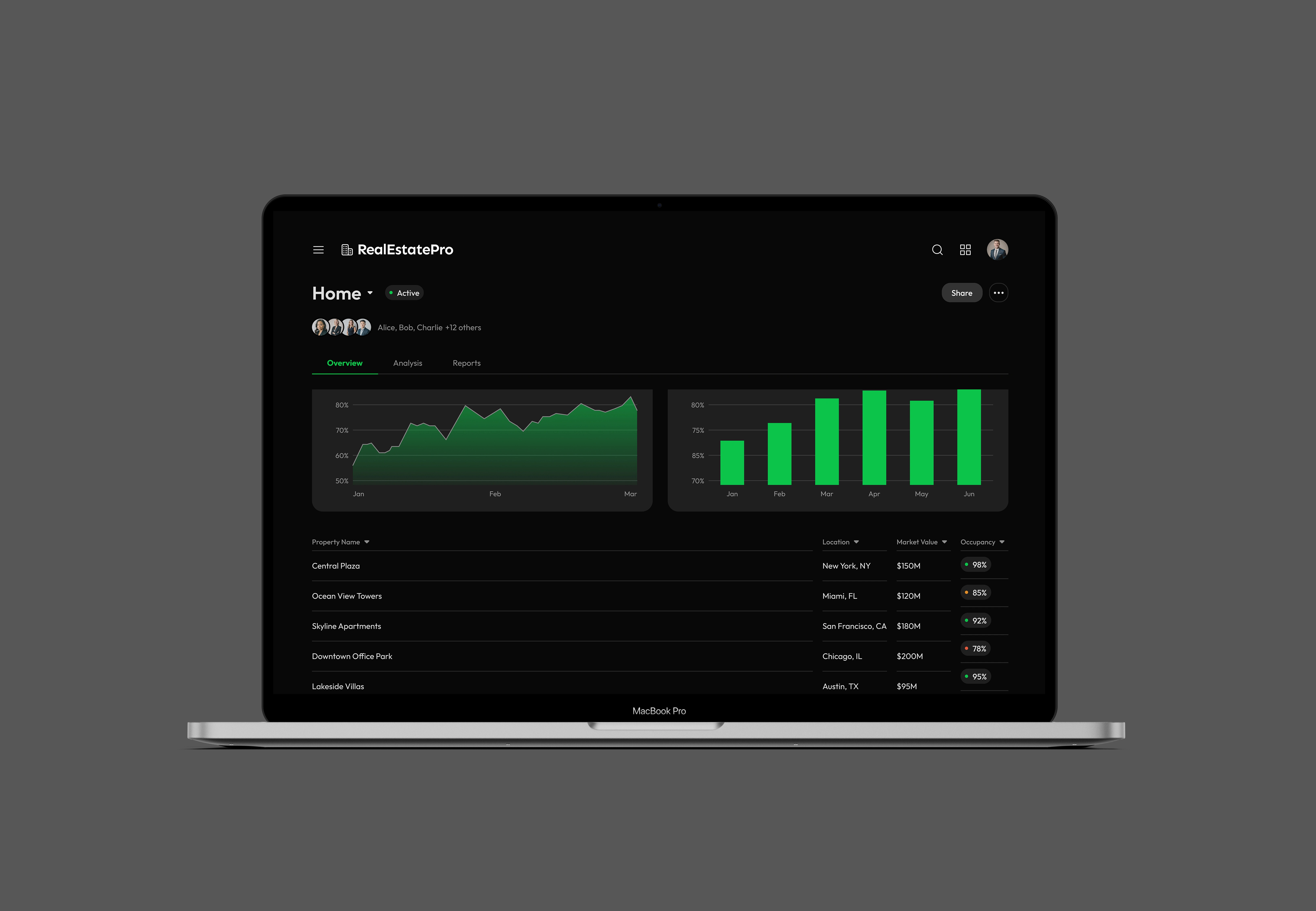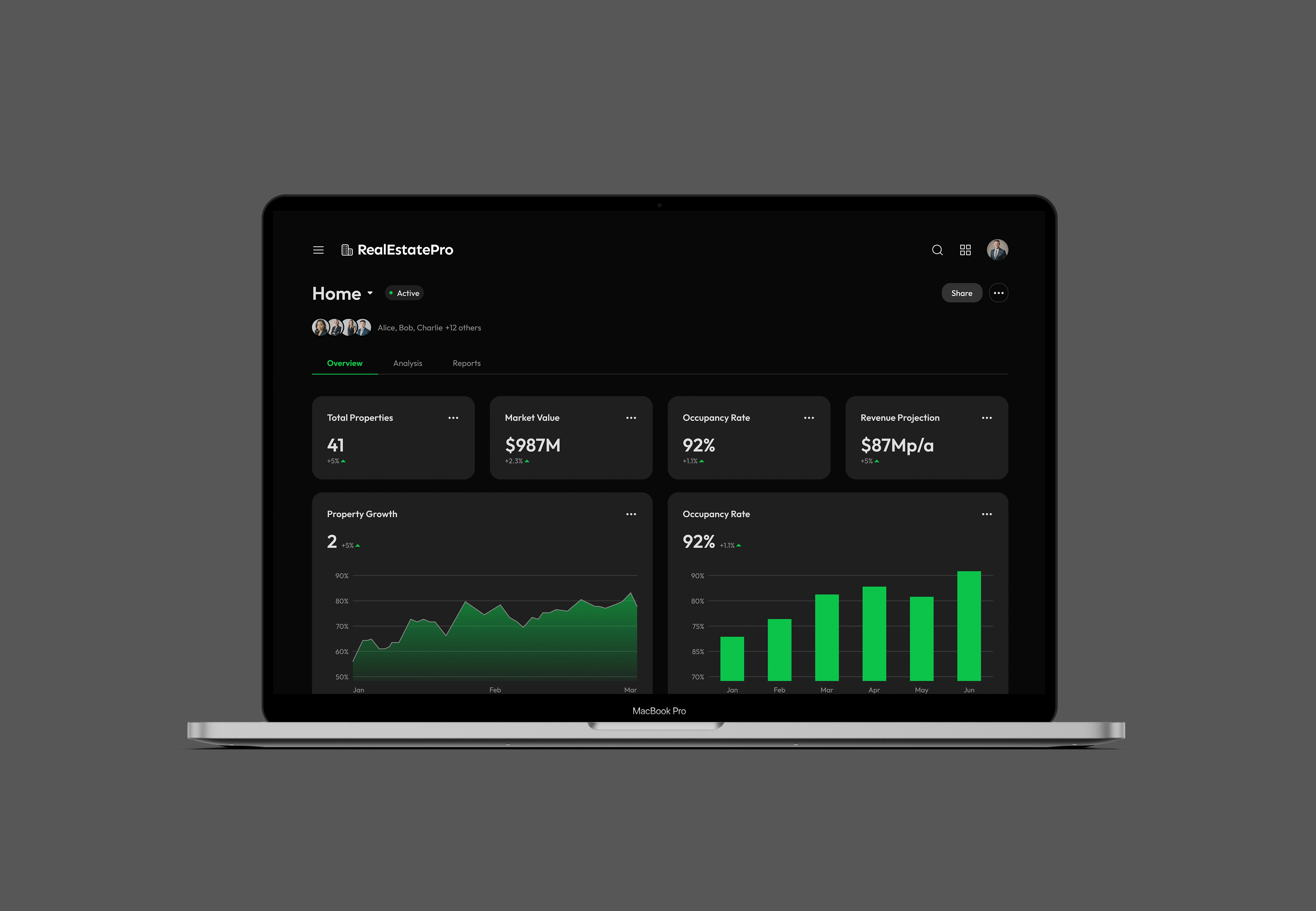 Sleek dark-mode real estate dashboard with market value, revenue insights, occupancy tracking, and interactive visuals for smart property management.