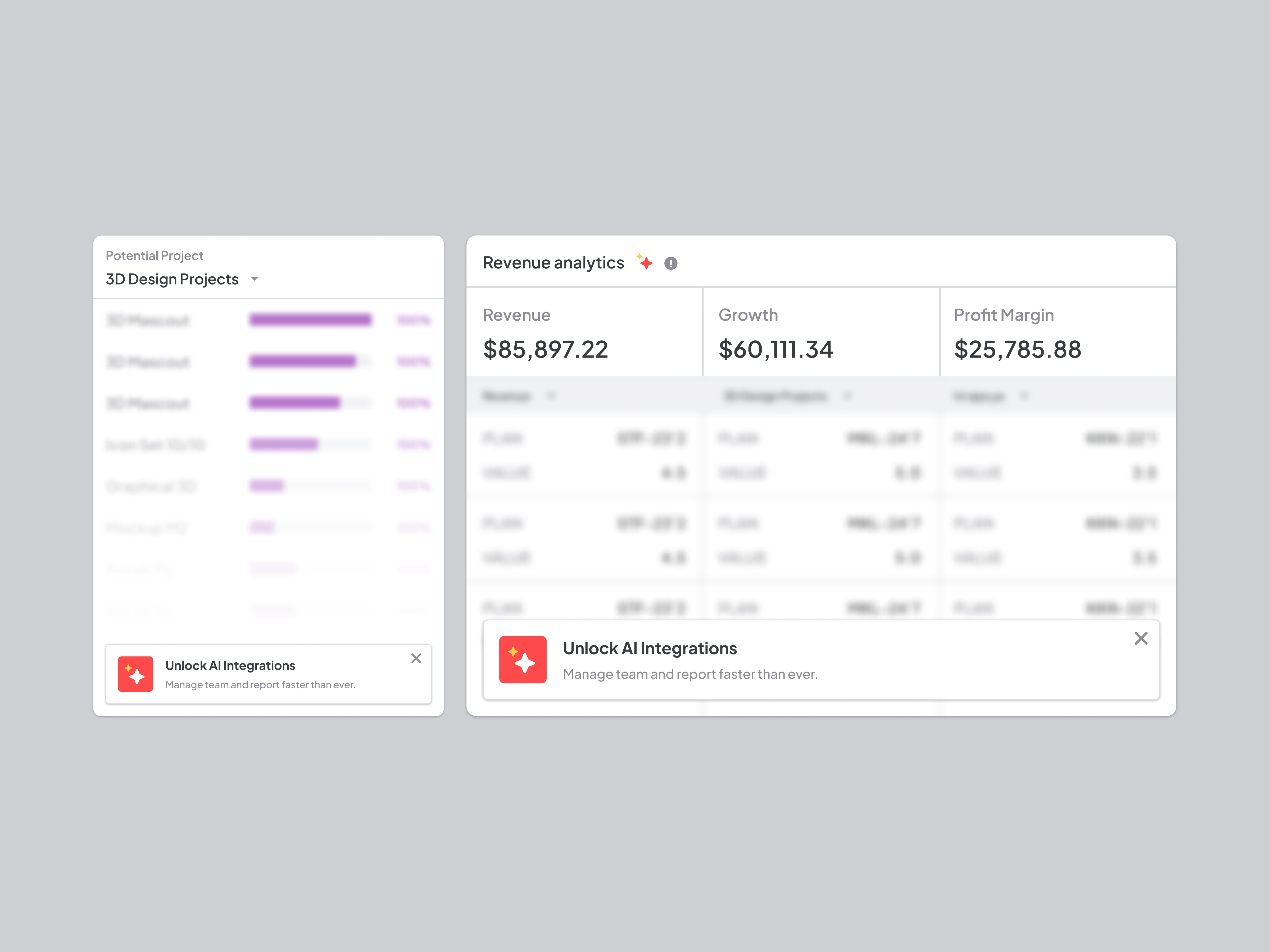 Modular UI components for a CRM with AI integration. They surface key predictive insights and automated suggestions for better customer and sales management.