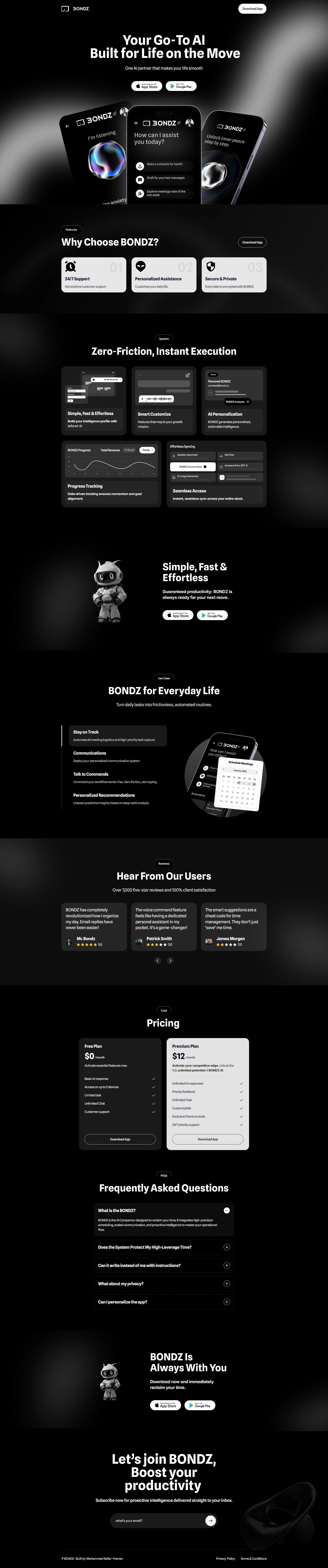 Designed and built BONDZ AI companion website landing page entirely with Framer, focusing on end to end user-friendly, web/mobile-first experience for SAAS.