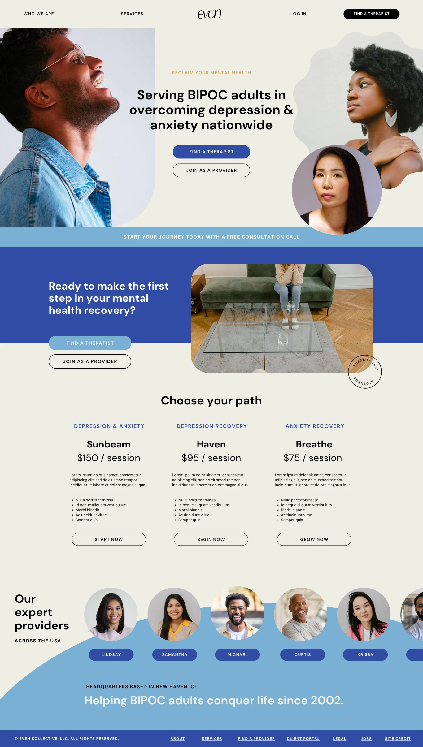 Even is a BIPOC-owned therapy collective founded on helping people of color overcome depression and anxiety nationwide through a subscription-based model.