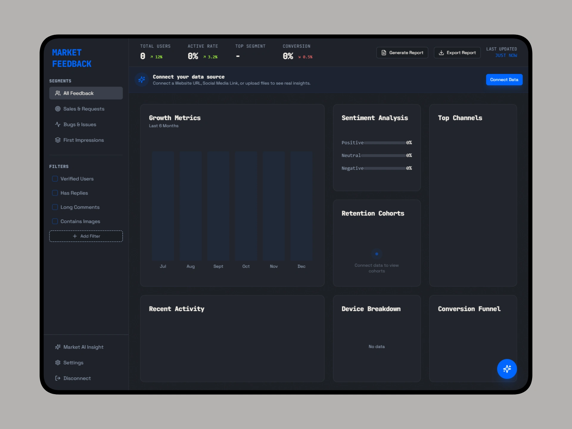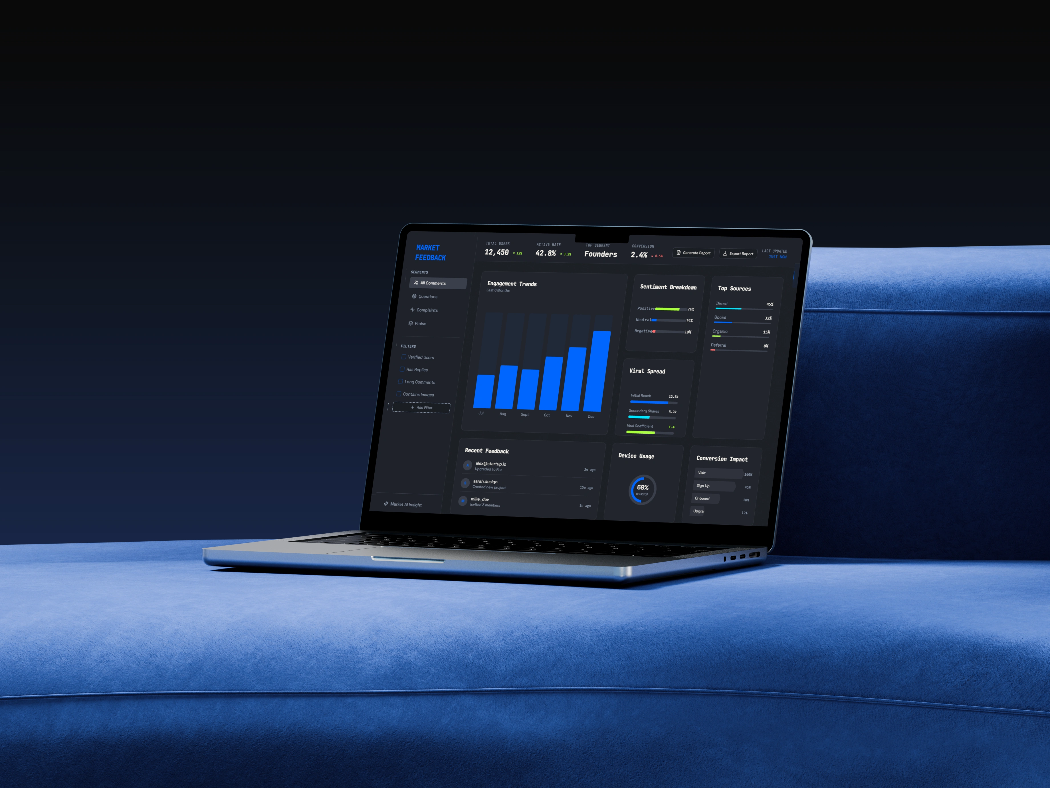 User Insights & Marketing Dashboard is an AI-driven analytics platform that helps marketers and product teams understand user behavior, sentiment, and cross-channel performance — all in one clean, unified dashboard.