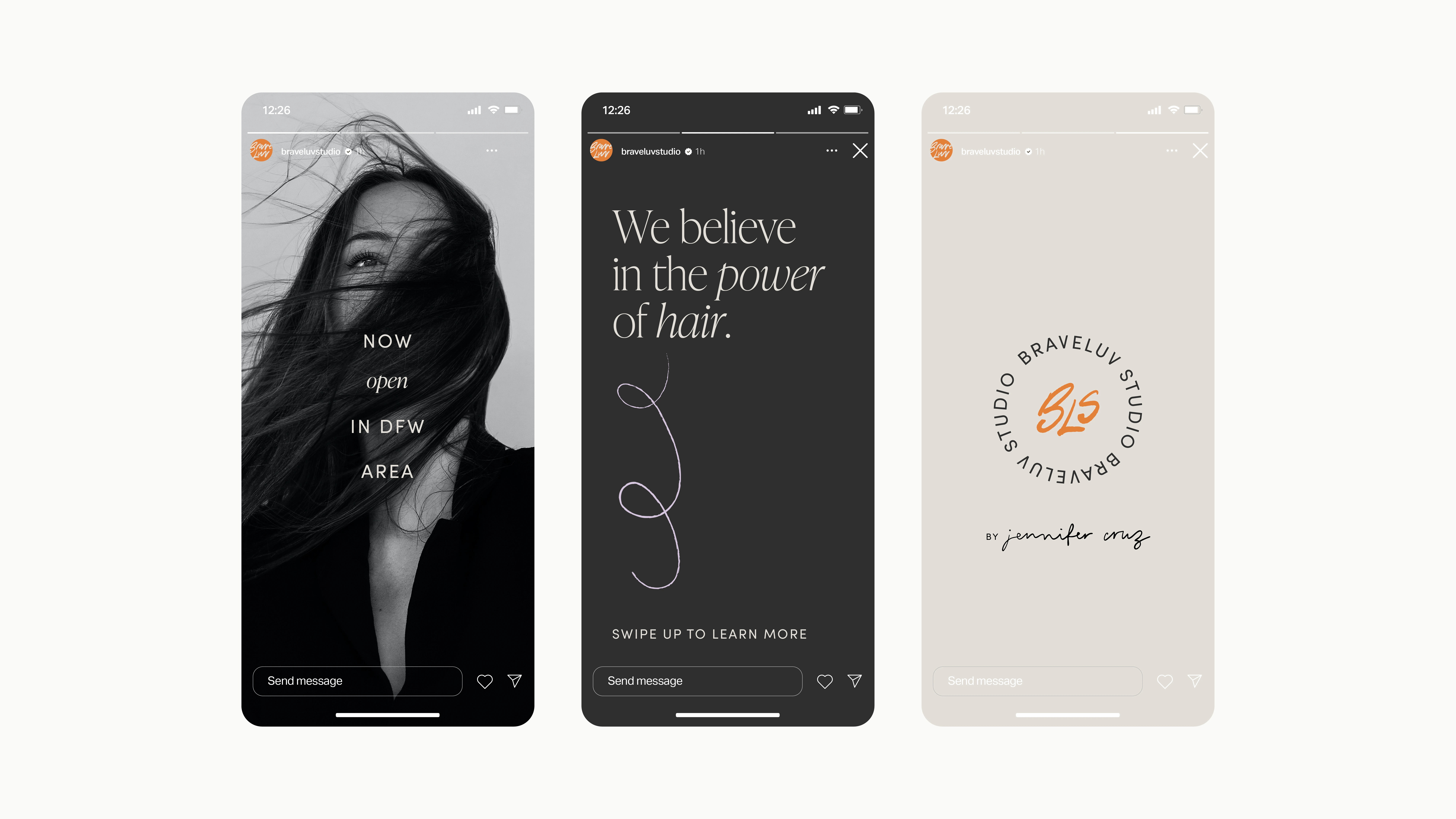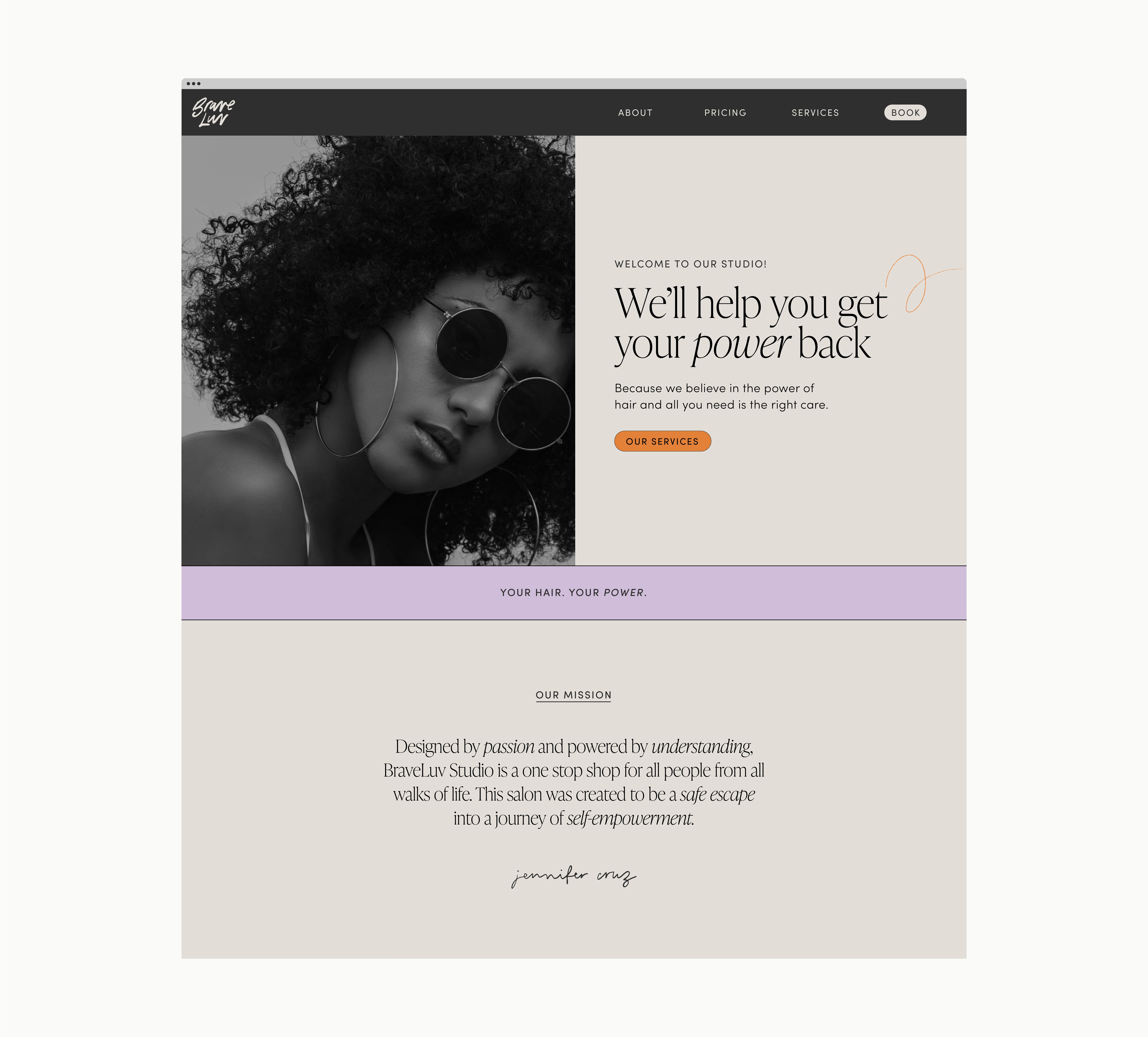 BraveLuv Studio is a brand new luxury hair salon, located in Plano, Texas. The vision for this one-stop shop is to deliver several hair and lash services to all ‘manes’ & lashes from all walks of life. Owned by a curly haired latina, this salon is brave enough to love and thrive through inclusivity. It’s an inviting place where customers can regain their confidence by being empowered in their hair journey. The design is inspired by the power of confidence. Bold lettering & vivid splashes of colour brighten up the brand identity. Combining different typefaces represents individuality. Different curl patterns are shown through the hand-drawn coils throughout the identity.