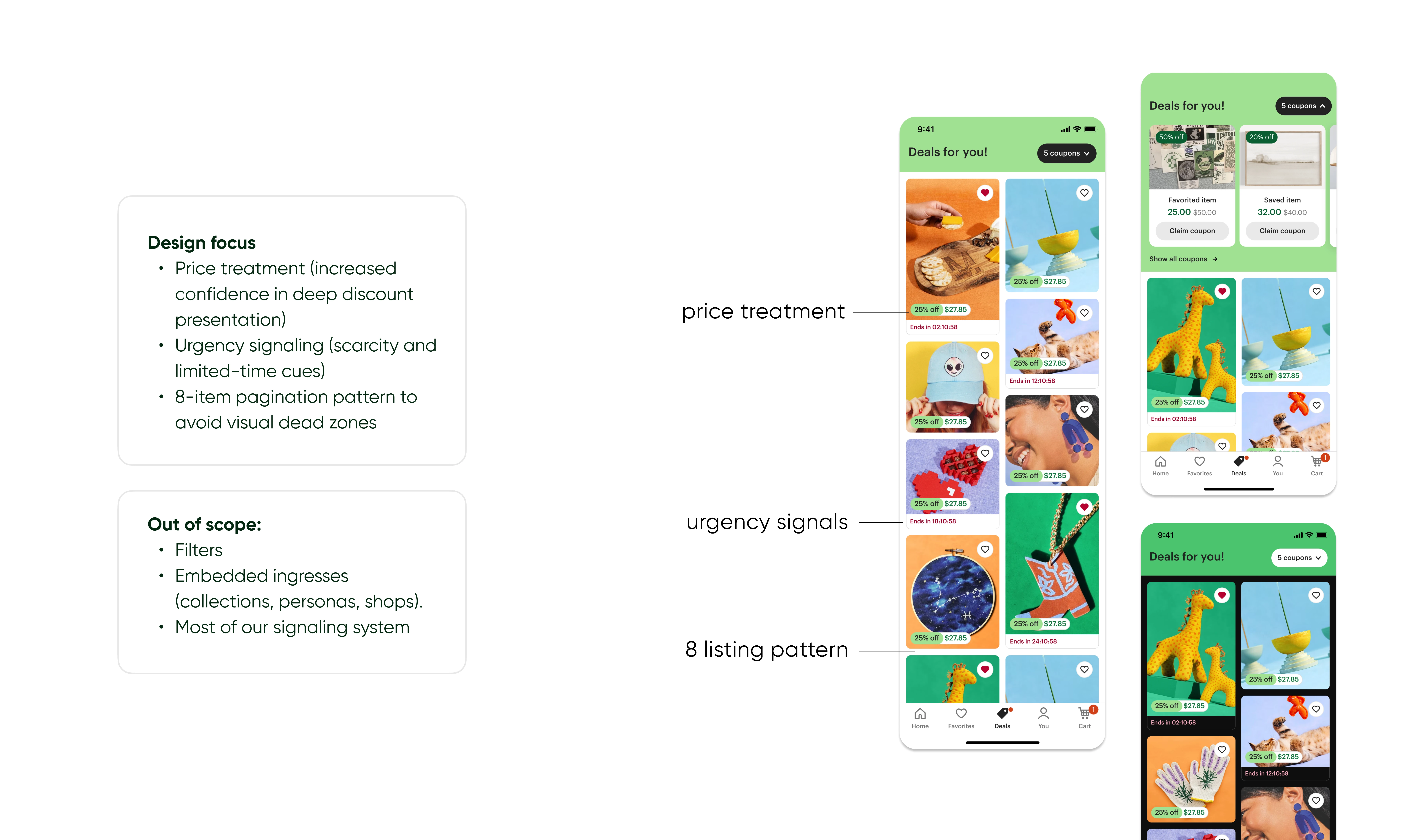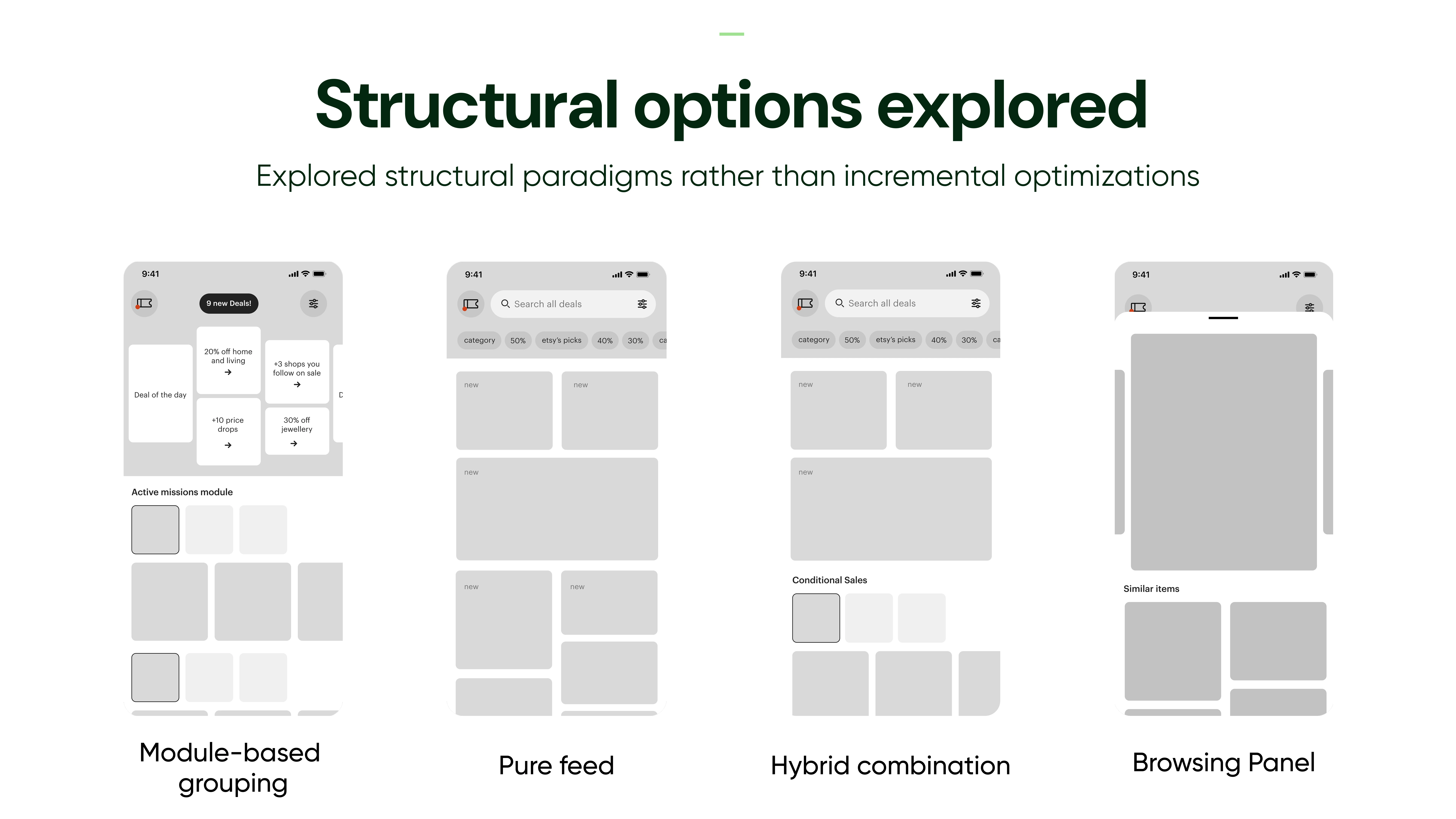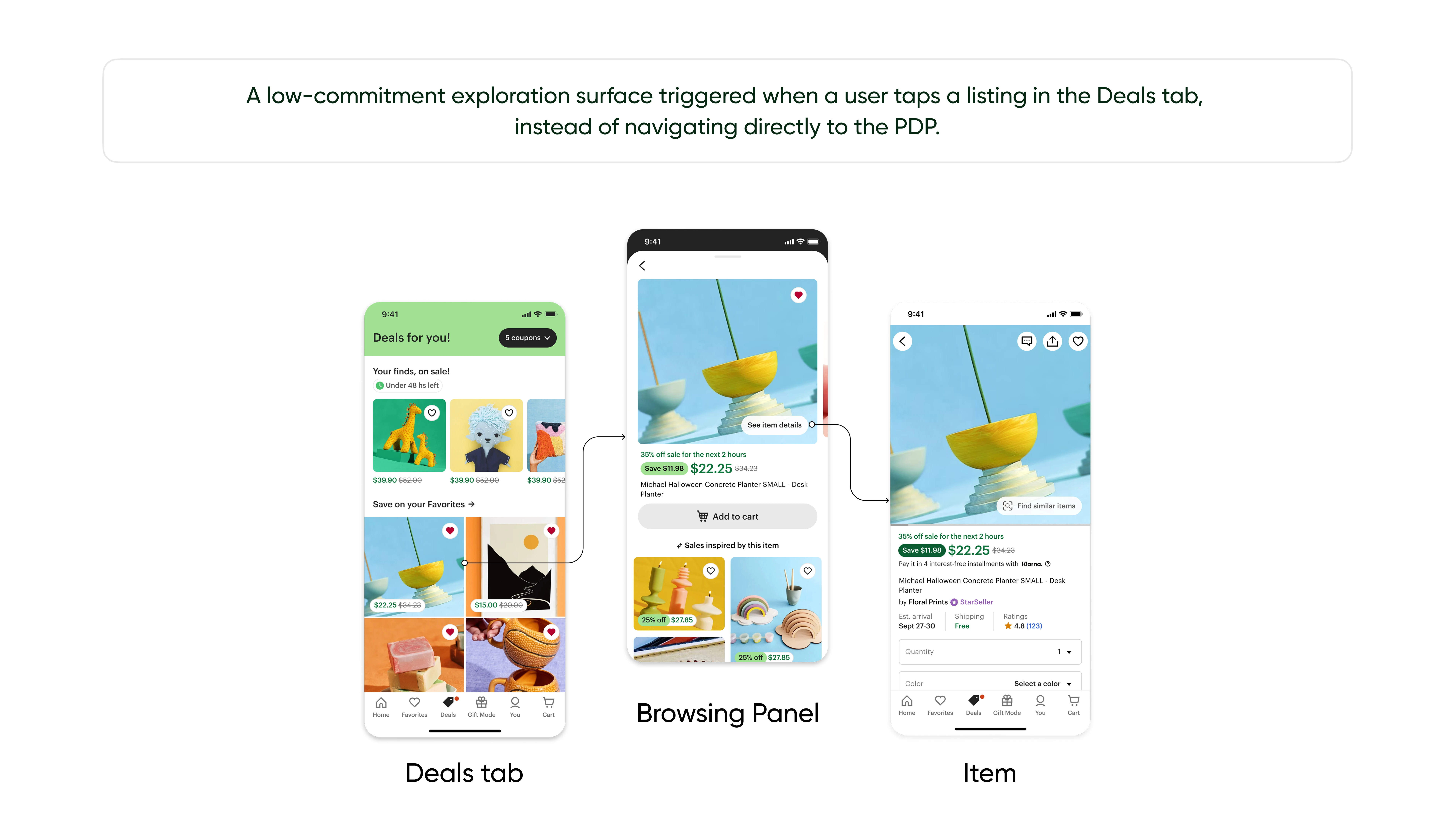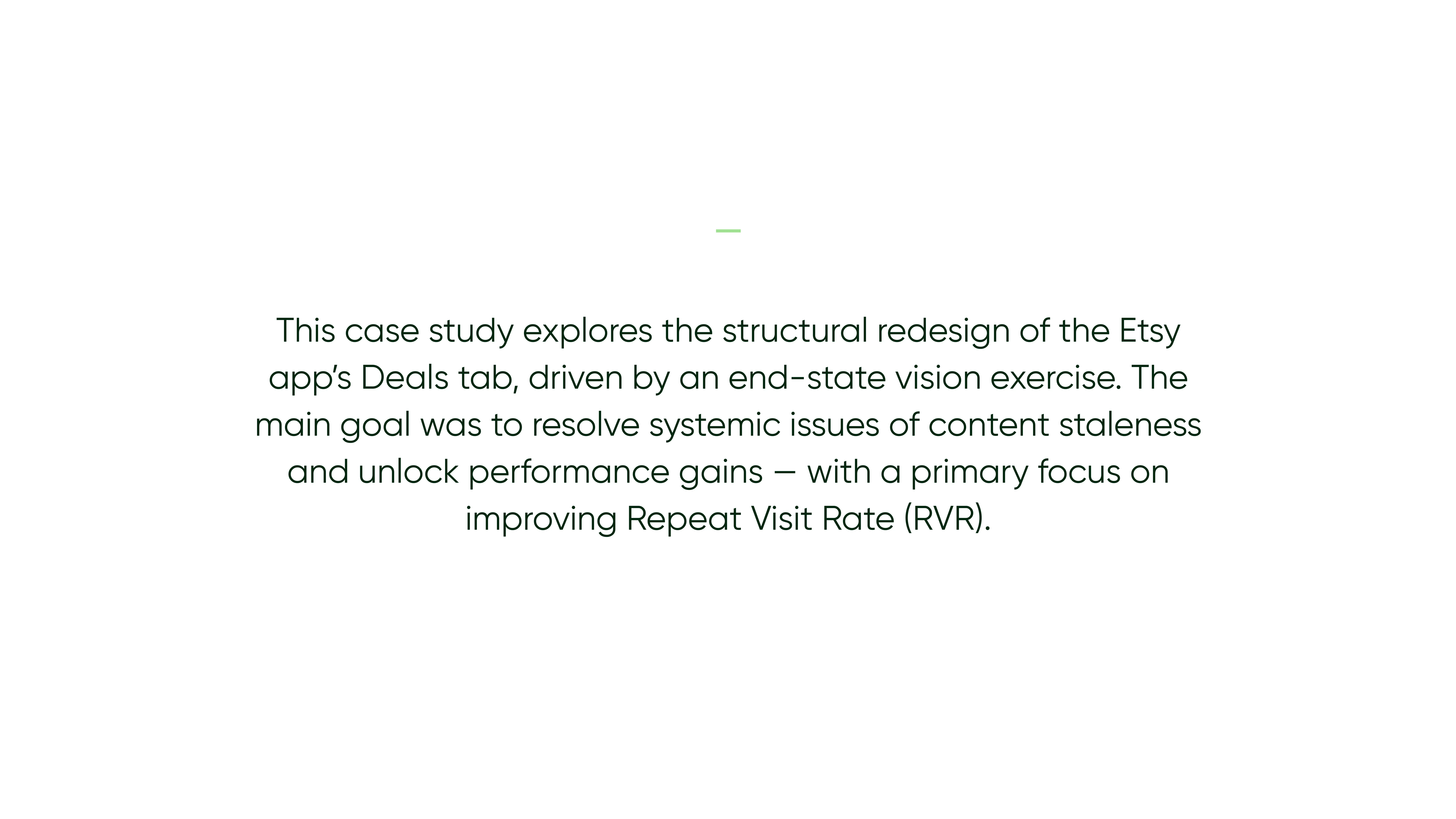 Redesign of Etsy’s Deals tab to combat staleness and boost repeat visits, shifting from modules to a dynamic feed and low-commitment browsing panel.