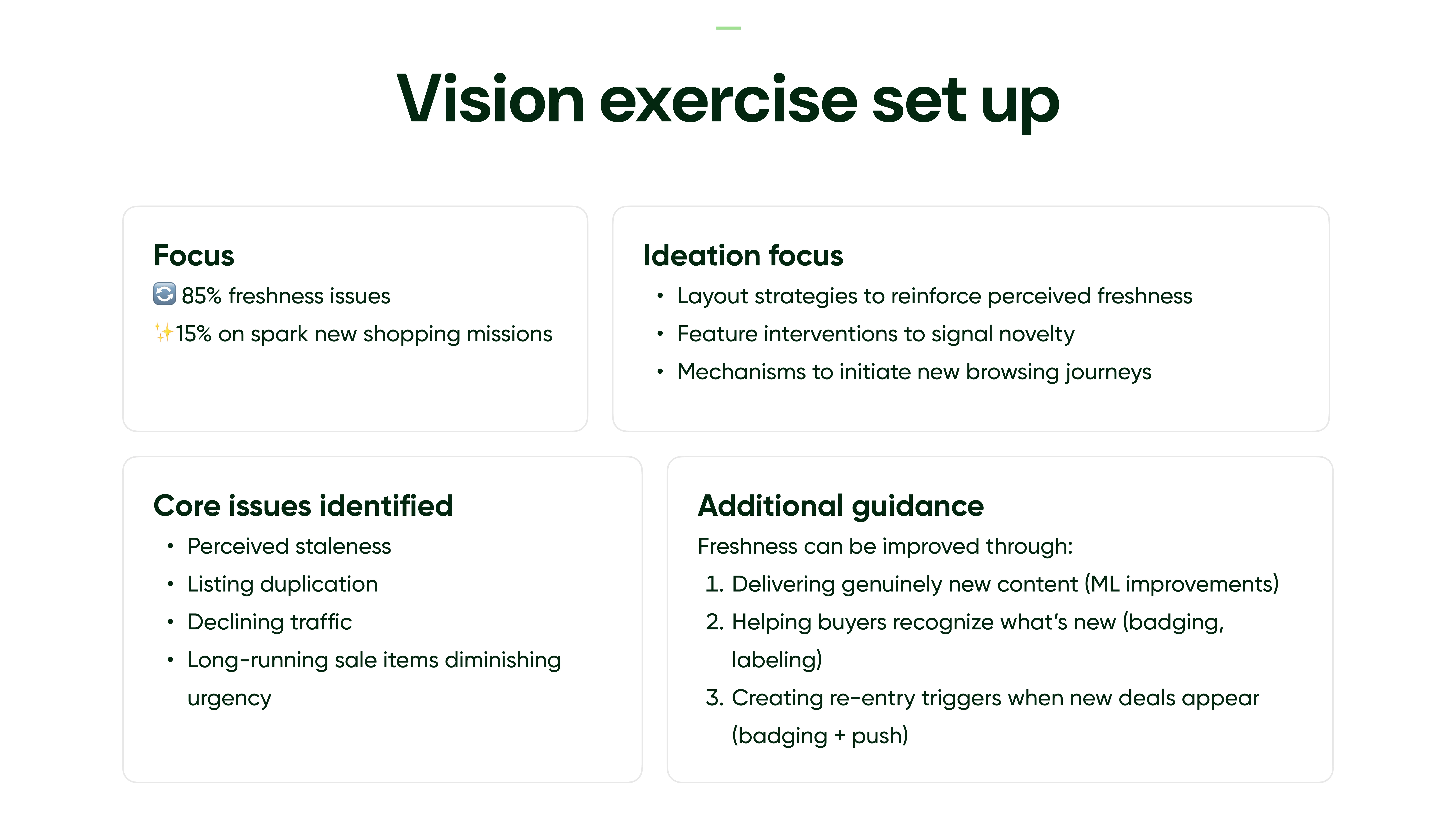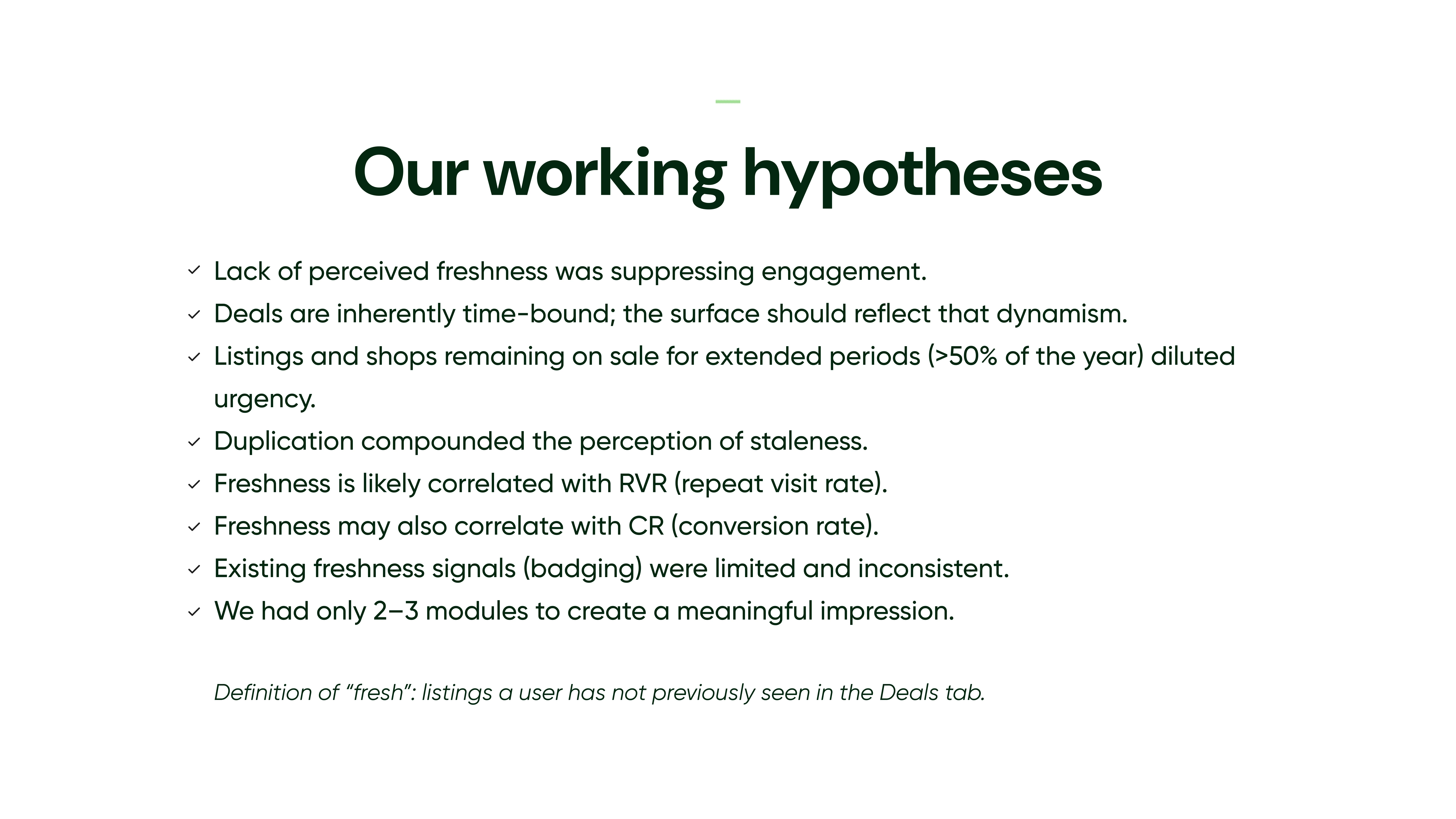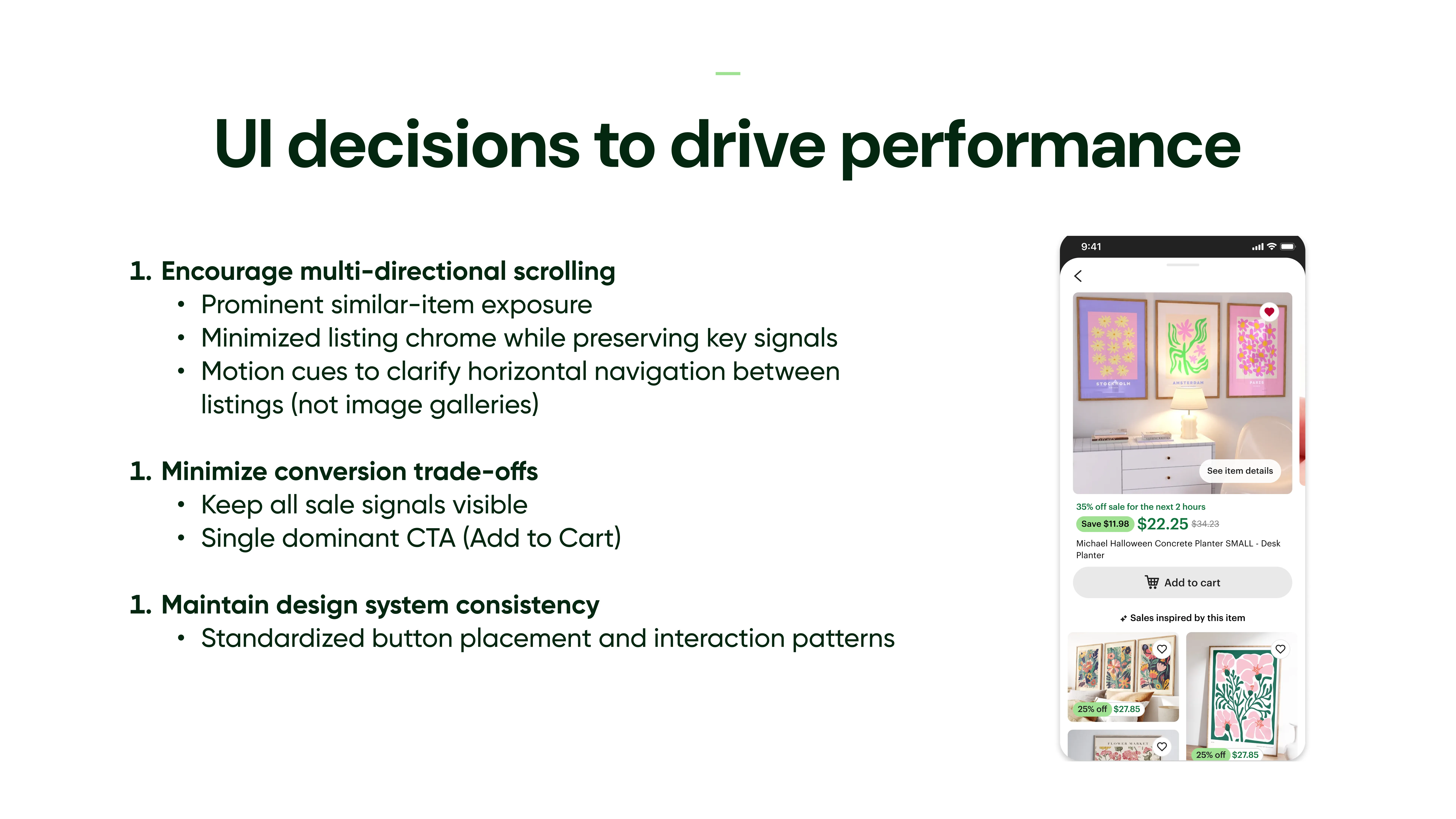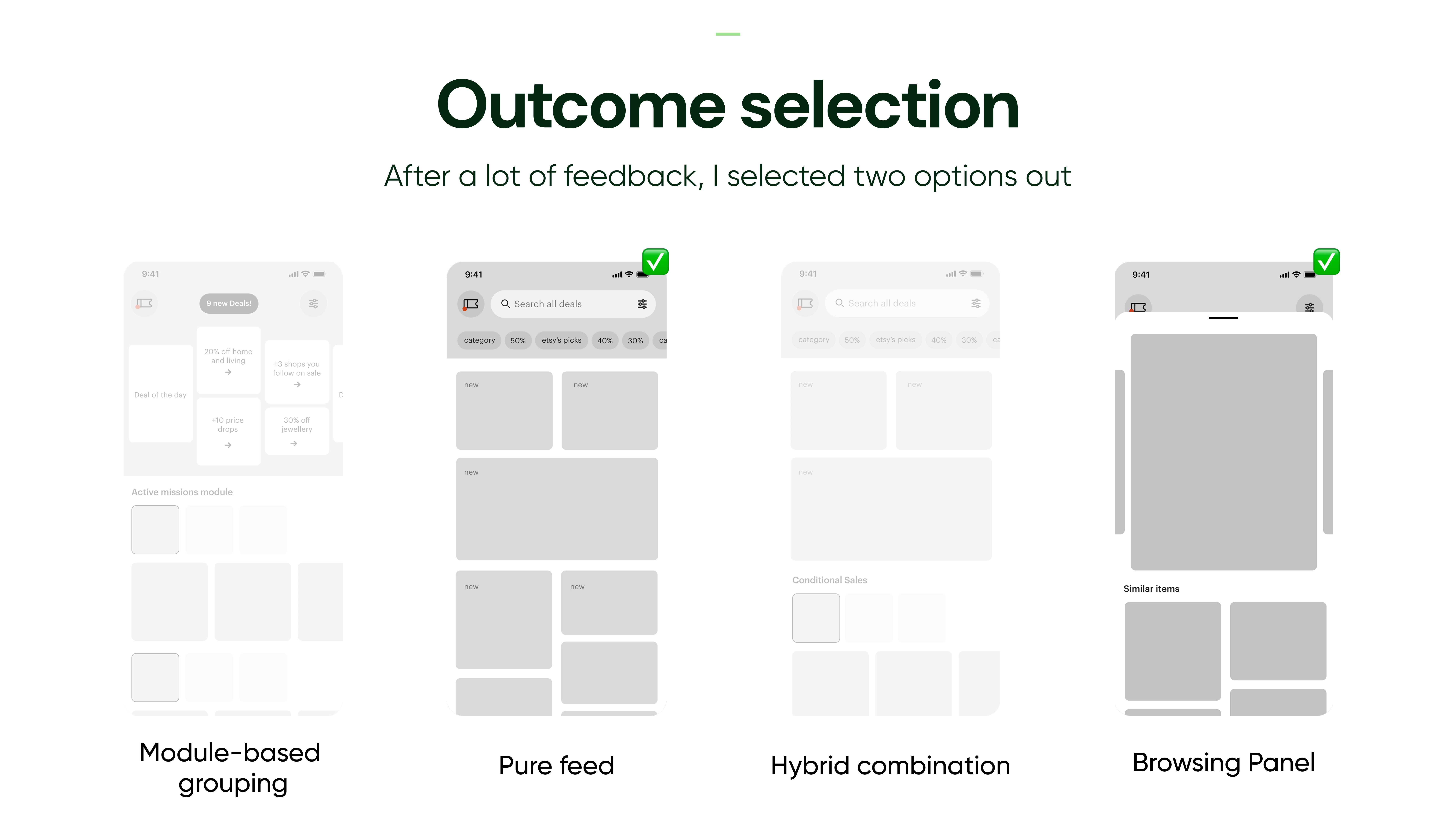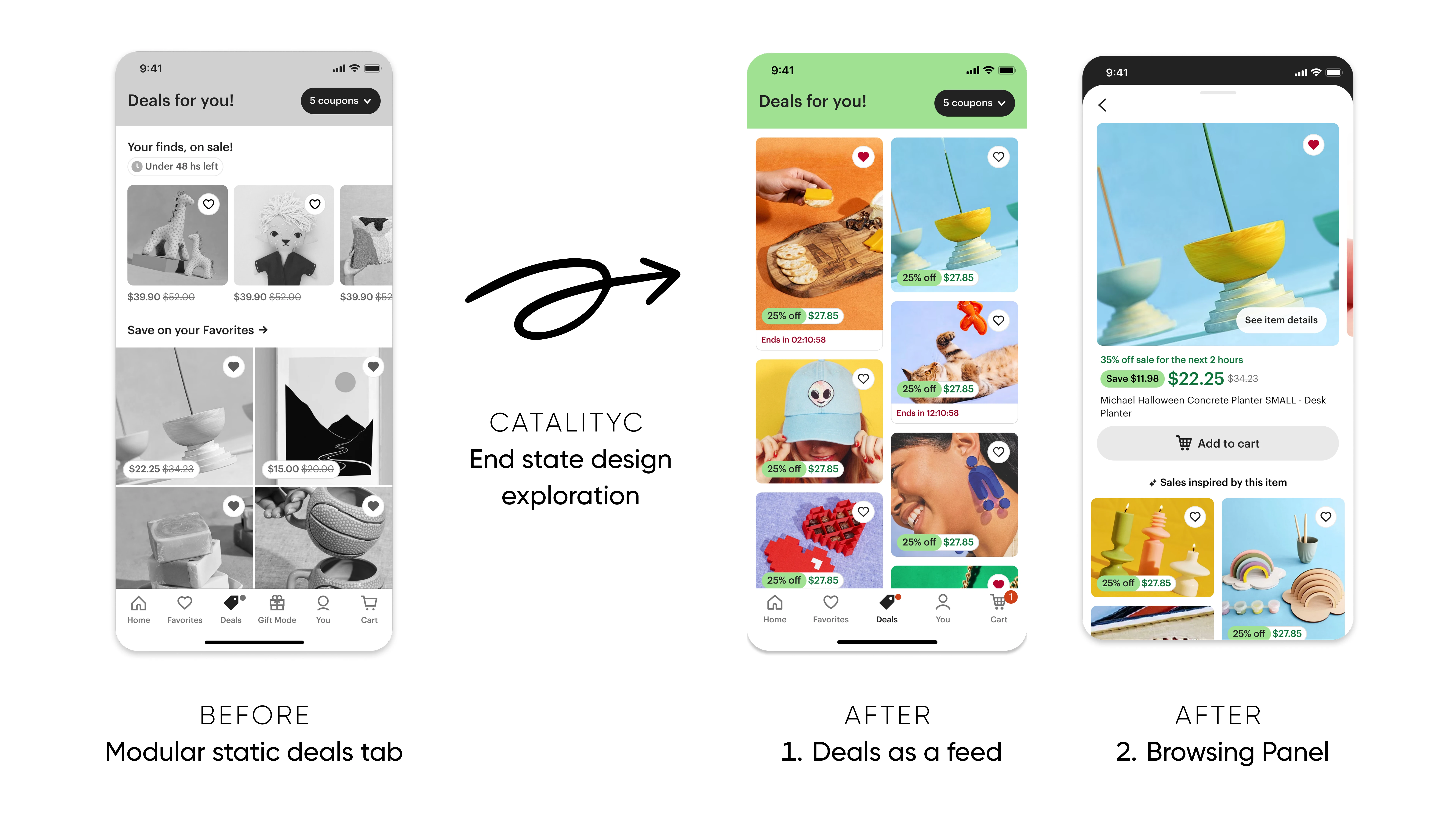 Redesign of Etsy’s Deals tab to combat staleness and boost repeat visits, shifting from modules to a dynamic feed and low-commitment browsing panel.