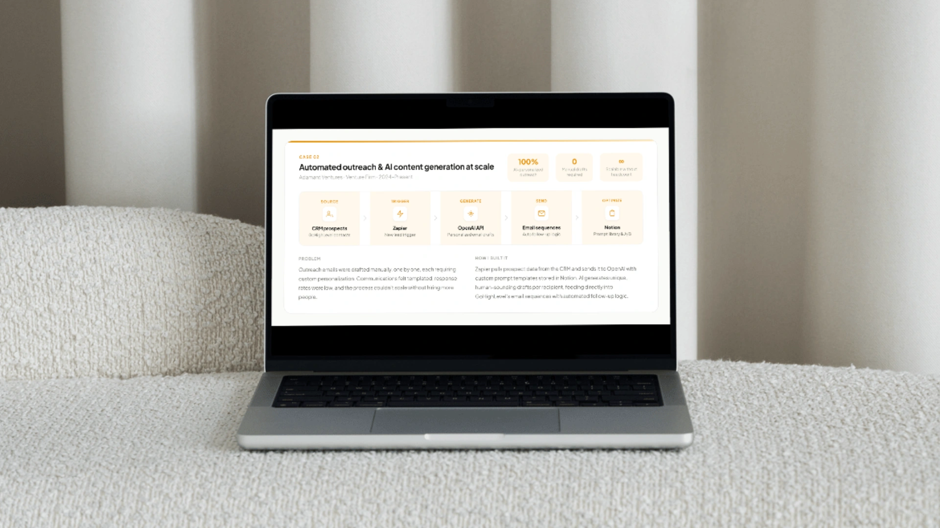 I built a Zapier workflow that triggers whenever a new prospect enters the GoHighLevel CRM. It pulls the prospect's profile data — name, company, role, industry, and any enrichment data from the research pipeline — and sends it to the OpenAI API along with a custom prompt template.