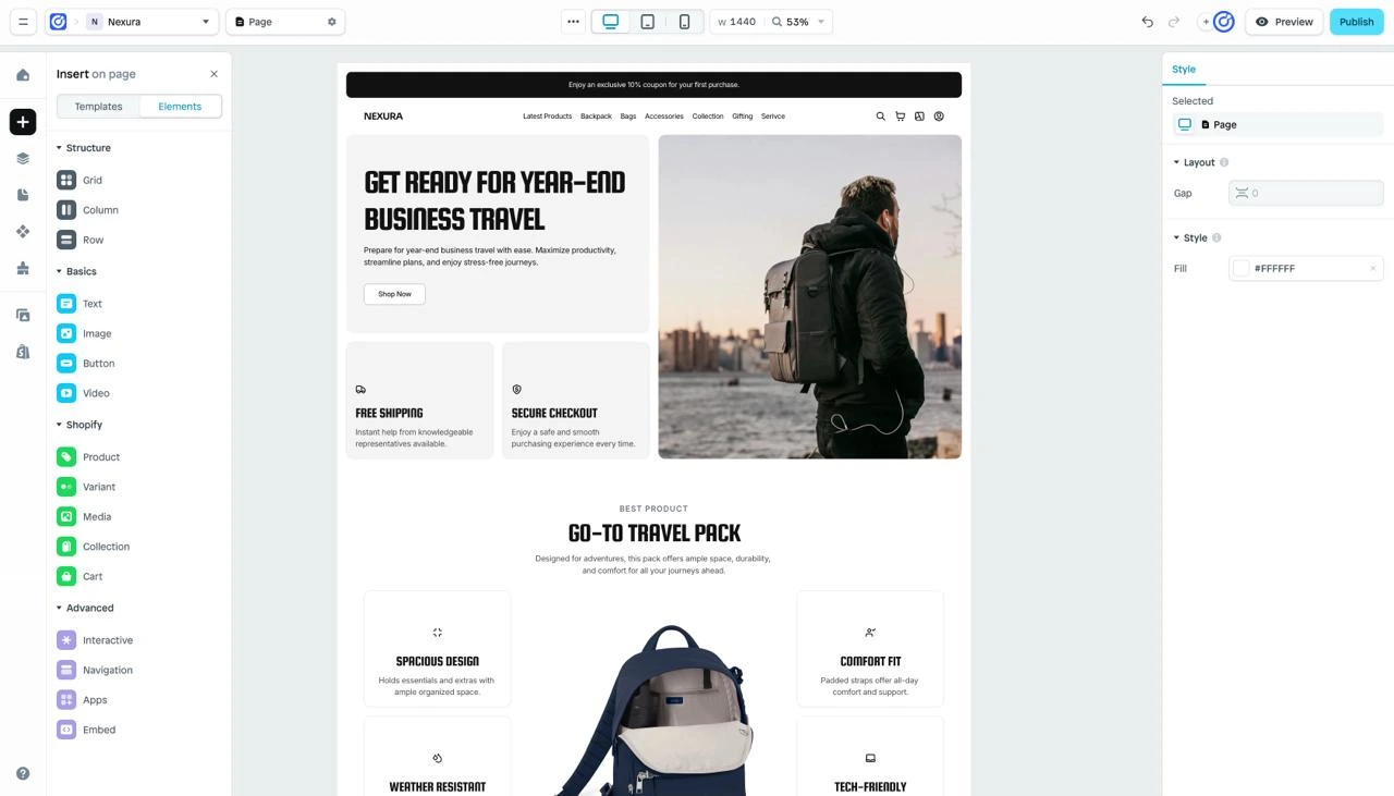 Nexura is a premium travel gear brand designed for modern explorers. The goal of this project was to create a responsive e-commerce website that reflects the brand’s adventurous spirit while offering a seamless and functional shopping experience across all devices.