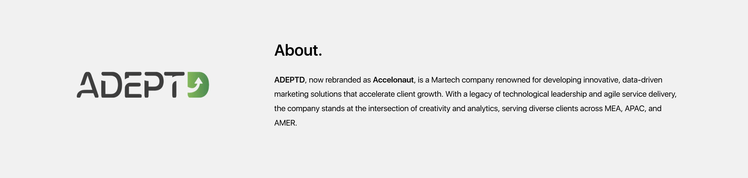 ADEPTD, now rebranded as Accelonaut, is a Martech company renowned for developing innovative, data-driven marketing solutions that accelerate client growth. With a legacy of technological leadership and agile service delivery, the company stands at the intersection of creativity and analytics, serving diverse clients across MEA, APAC, and AMER.