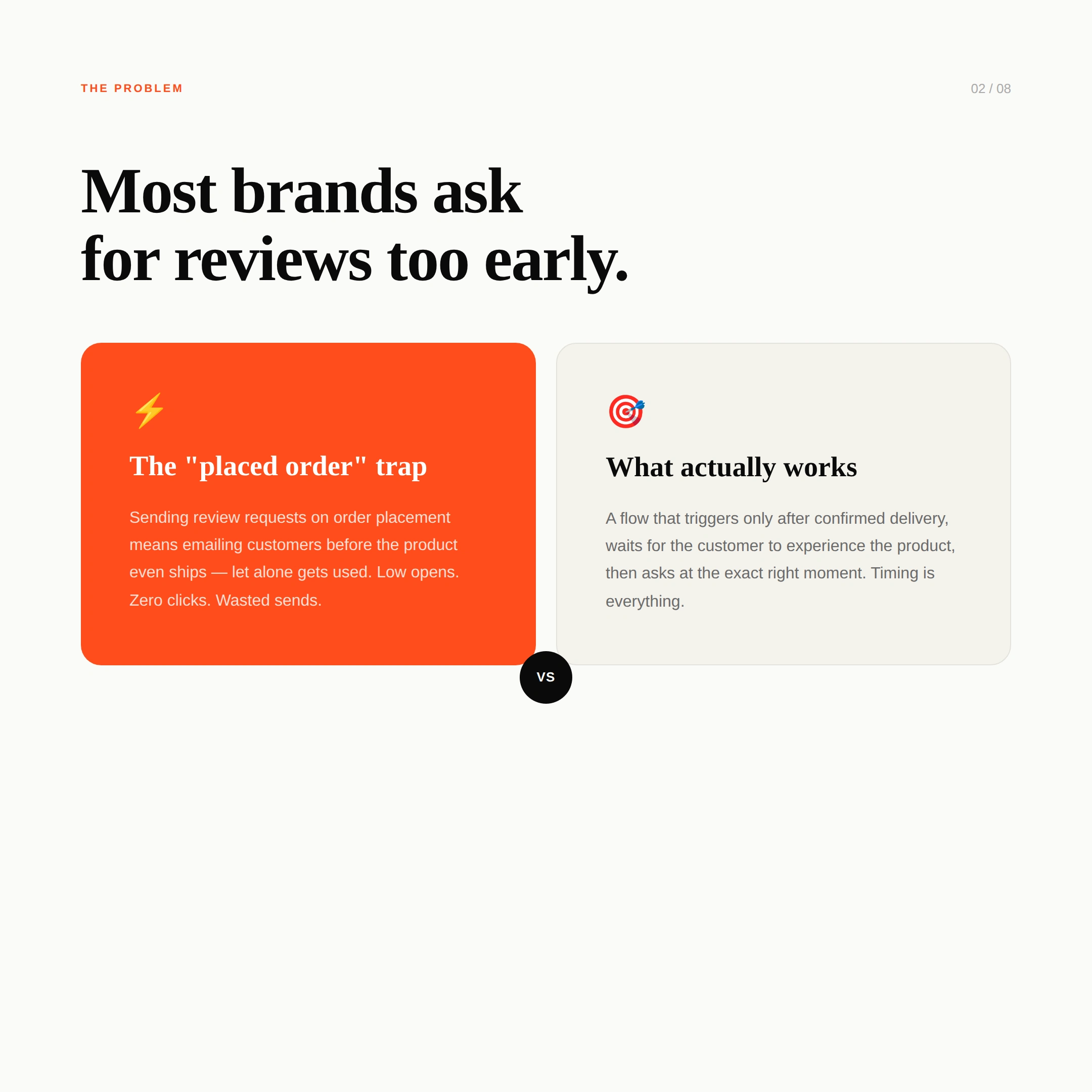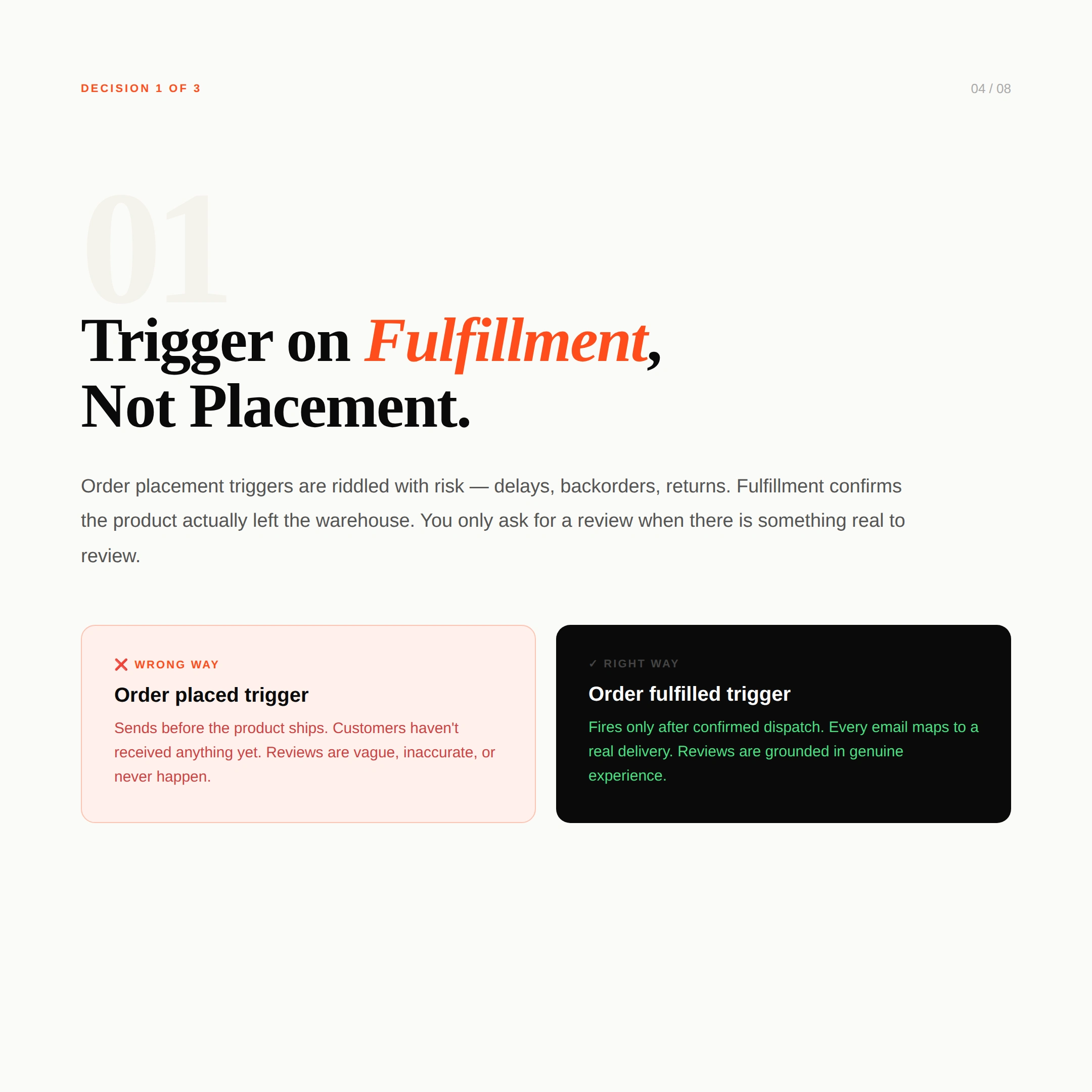 A two-email post-purchase flow triggered on order fulfillment — not order placement. This distinction matters: triggering on fulfillment ensures only customers who have actually received their order are asked to review, eliminating inaccurate or premature responses.