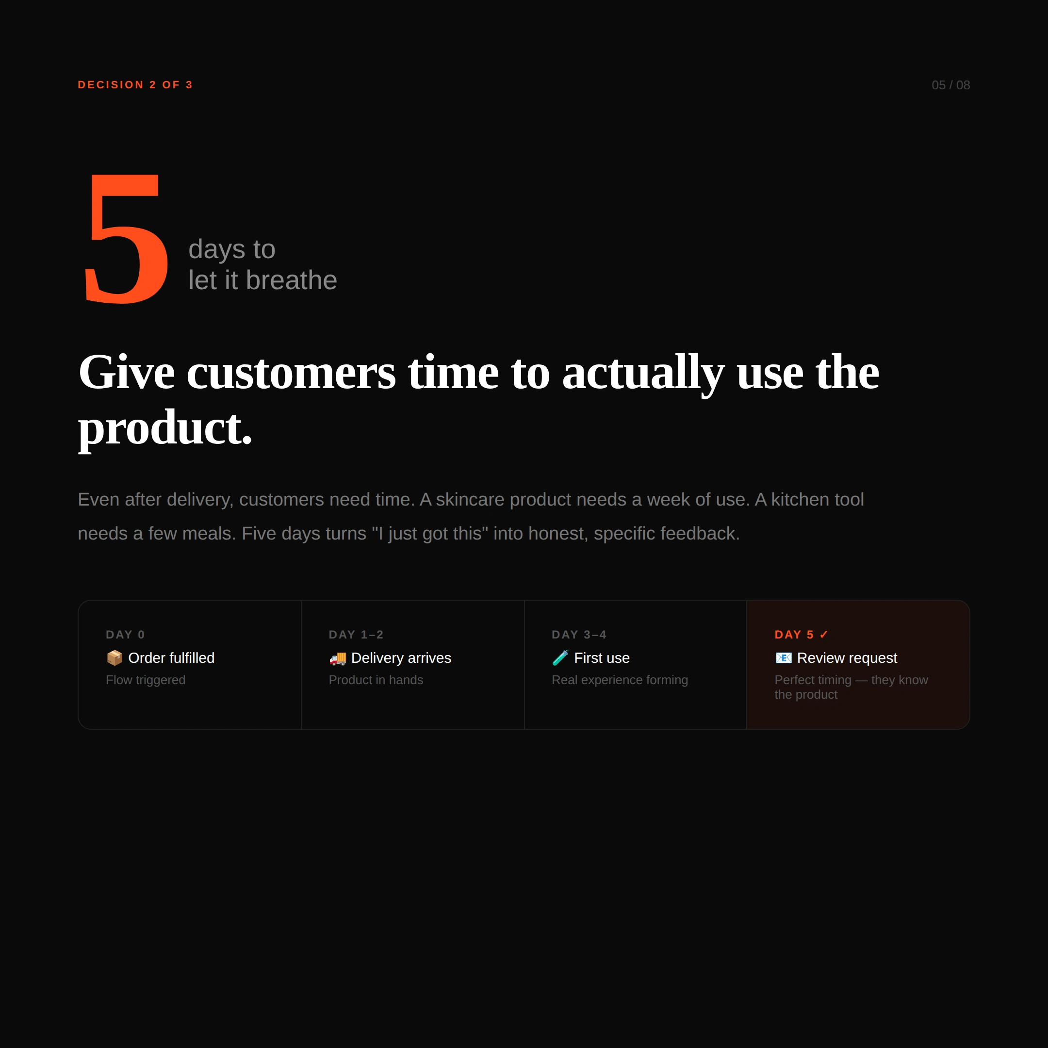 After fulfillment, the sequence holds for 5 days to give customers adequate time to use the product before forming an opinion. The review request email is then sent featuring an embedded 5-option star rating poll (1★ through 5★) directly in the email — reducing friction by letting the customer signal their experience with a single click.