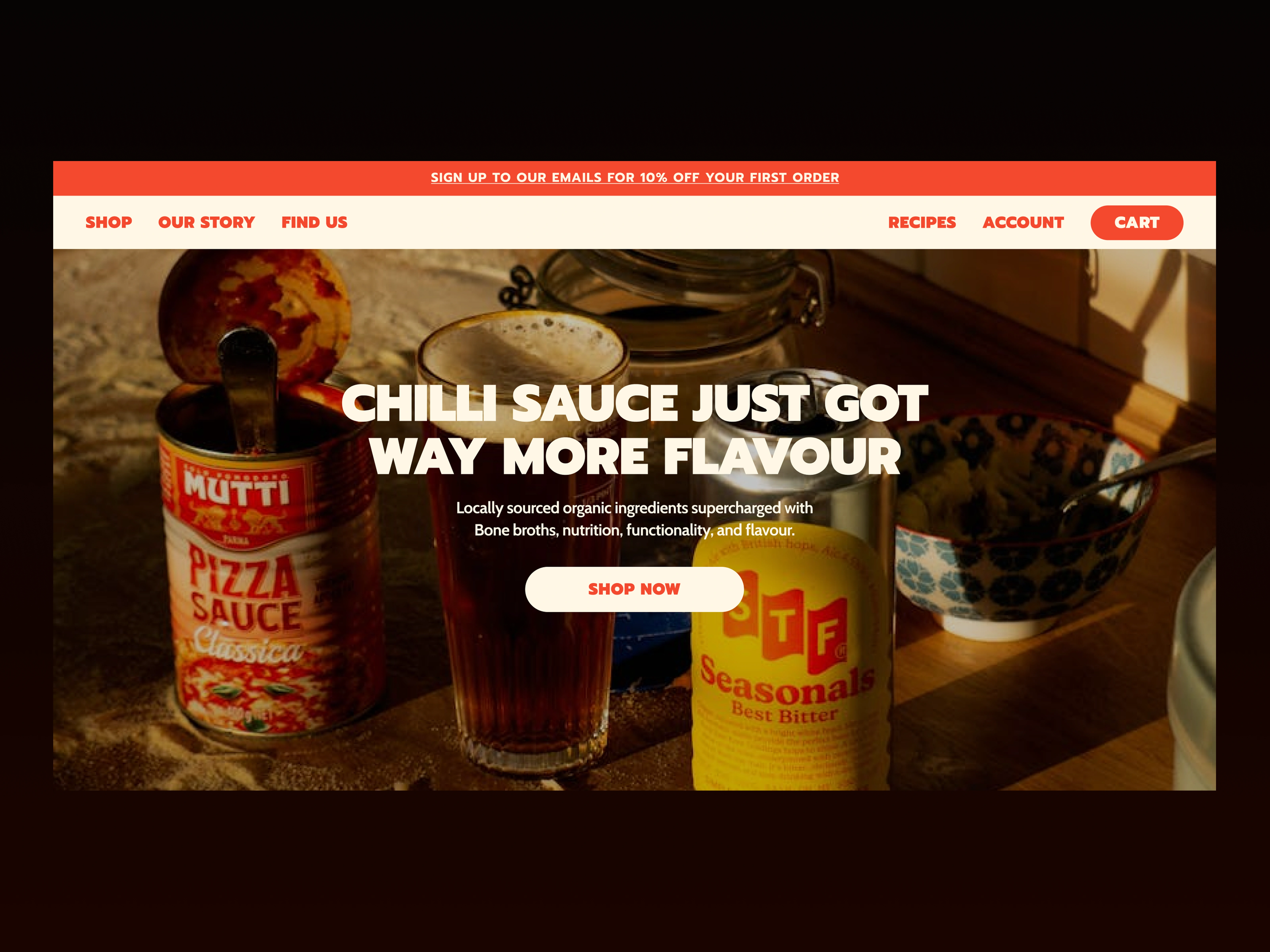 A bold hero section for a chilli sauce brand, focused on warmth, flavour, and visual impact through strong typography and rich imagery.