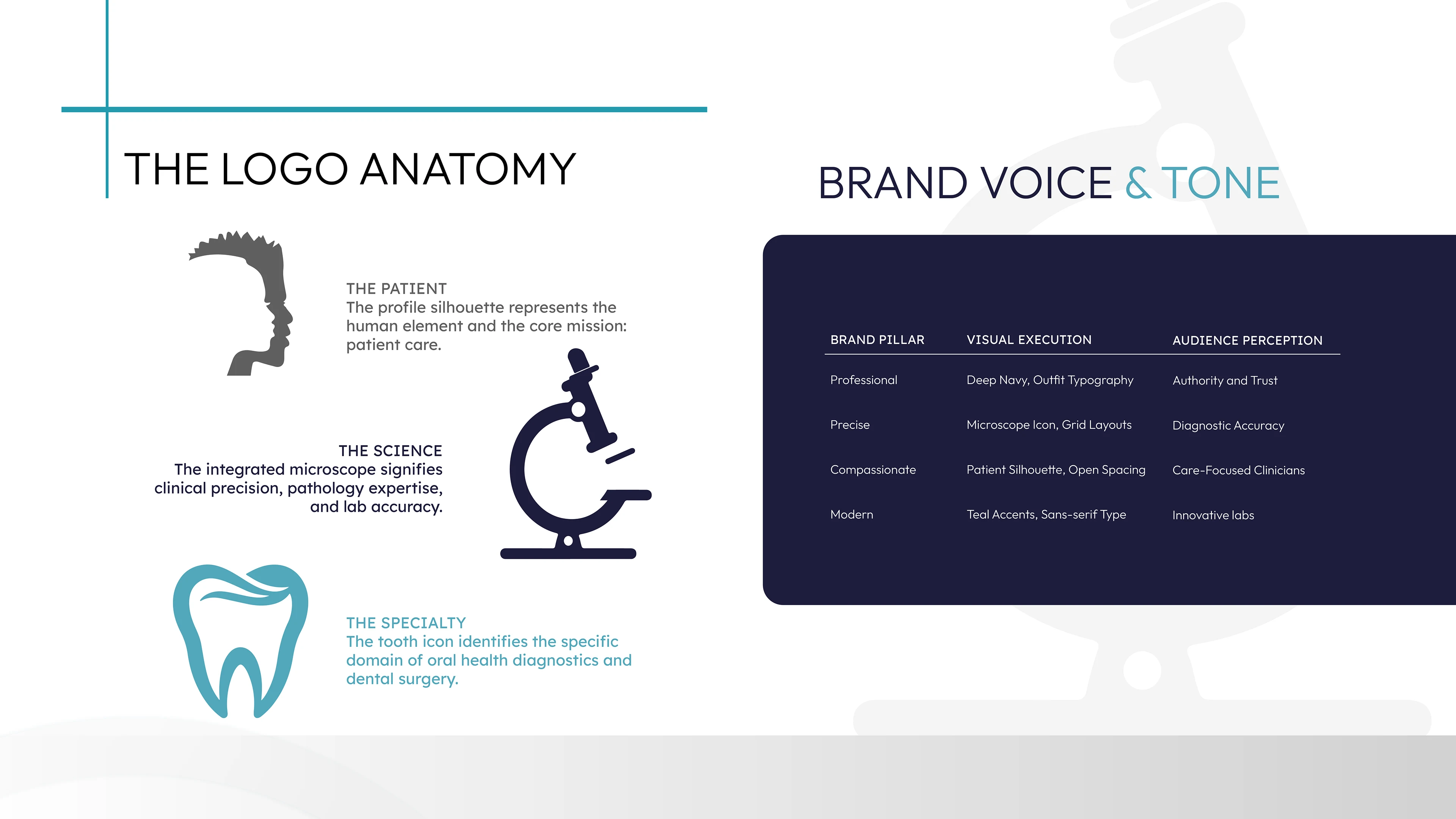 The Solution: We developed a sophisticated visual system centered around a custom-engineered icon. By merging the silhouette of a human profile with a laboratory microscope and a tooth, we created a singular mark that defines the special