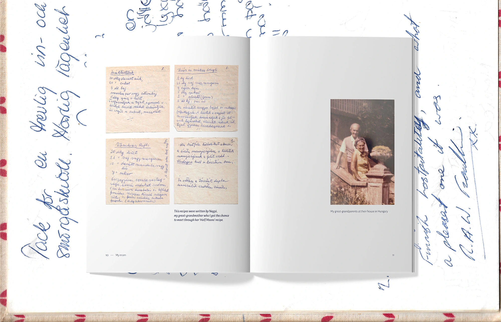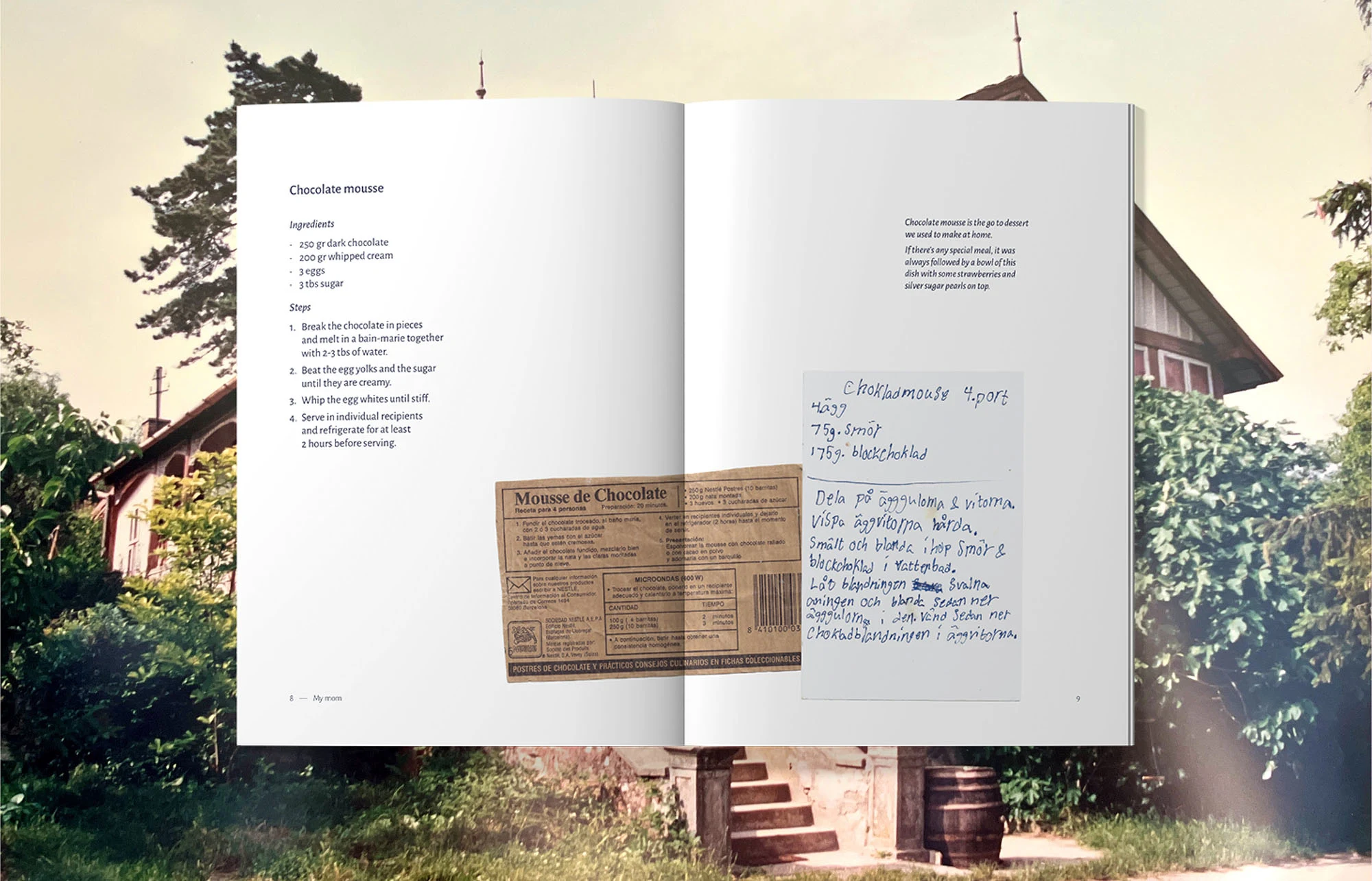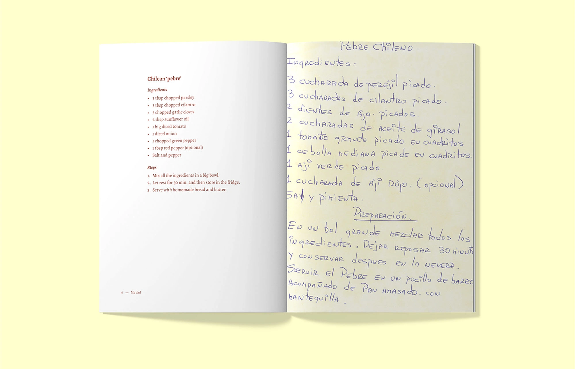Photographed and styled recipes with a natural, homemade aesthetic. Differentiated each book through typography, color, and composition—bold serif and deep red for Chilean recipes, light sans-serif and soft blue for Finnish dishes—while unifying both with a handmade, scrapbook-like feel that evokes family memories and traditions.