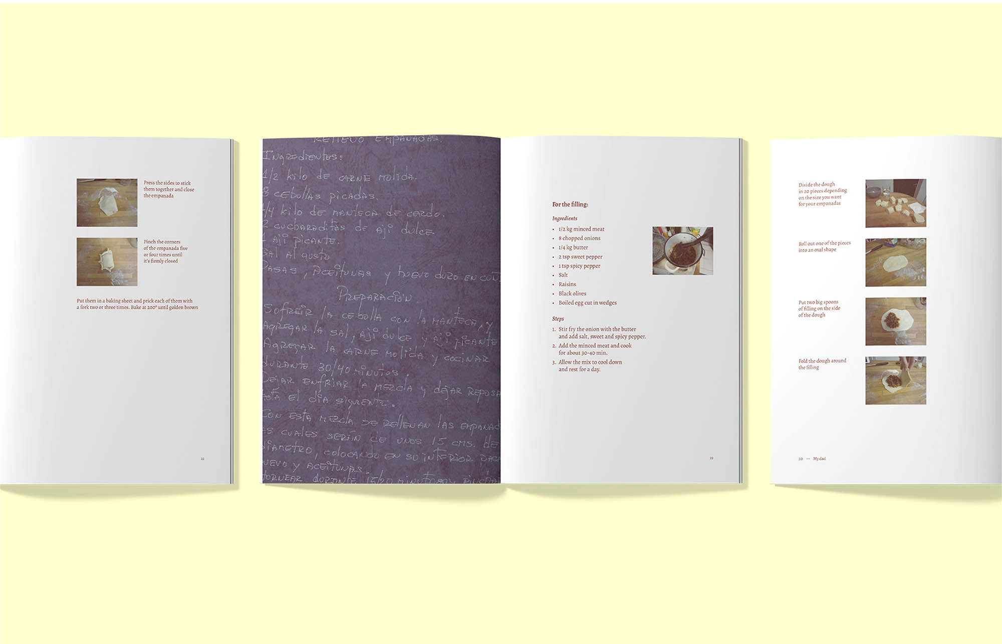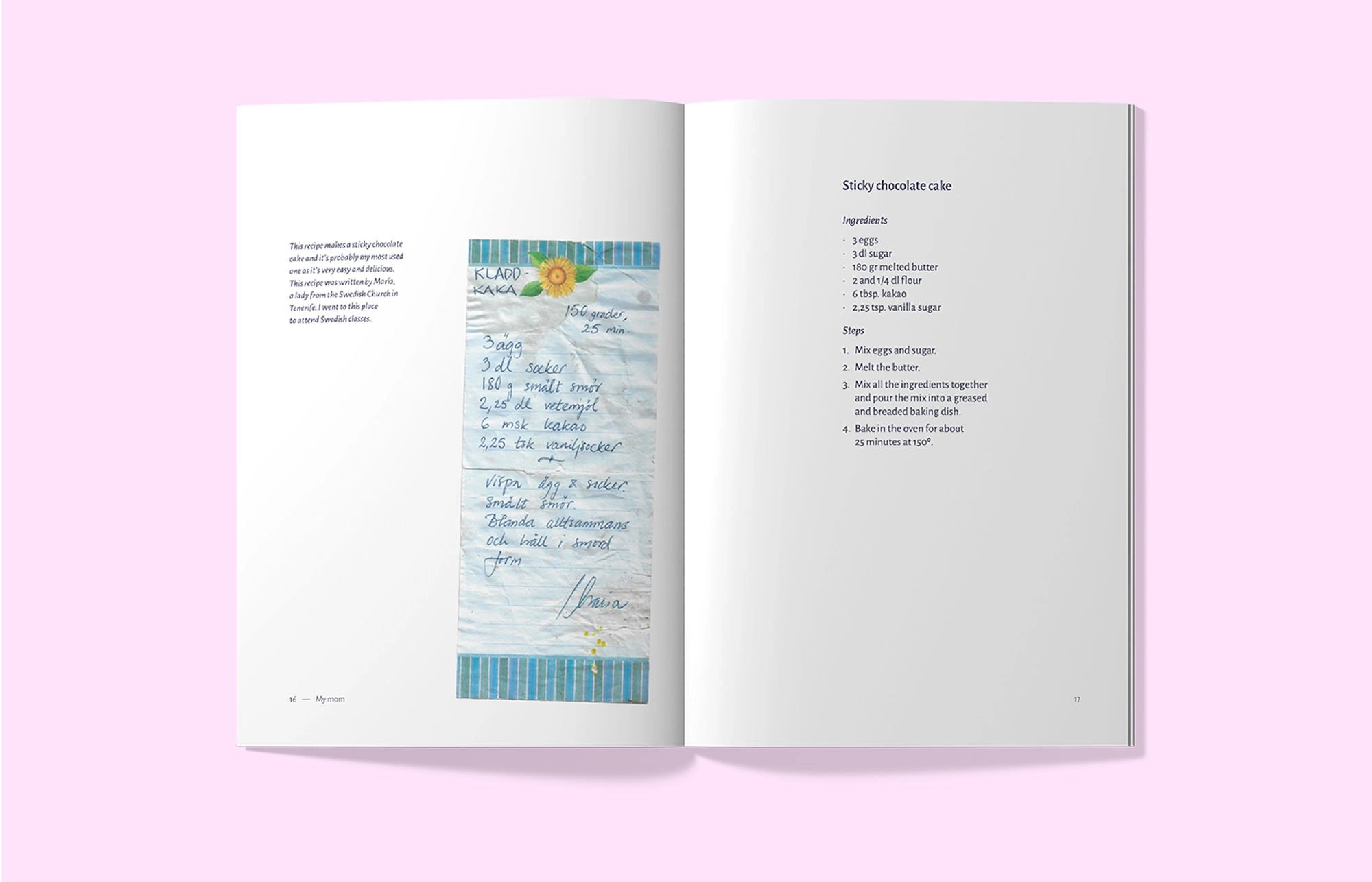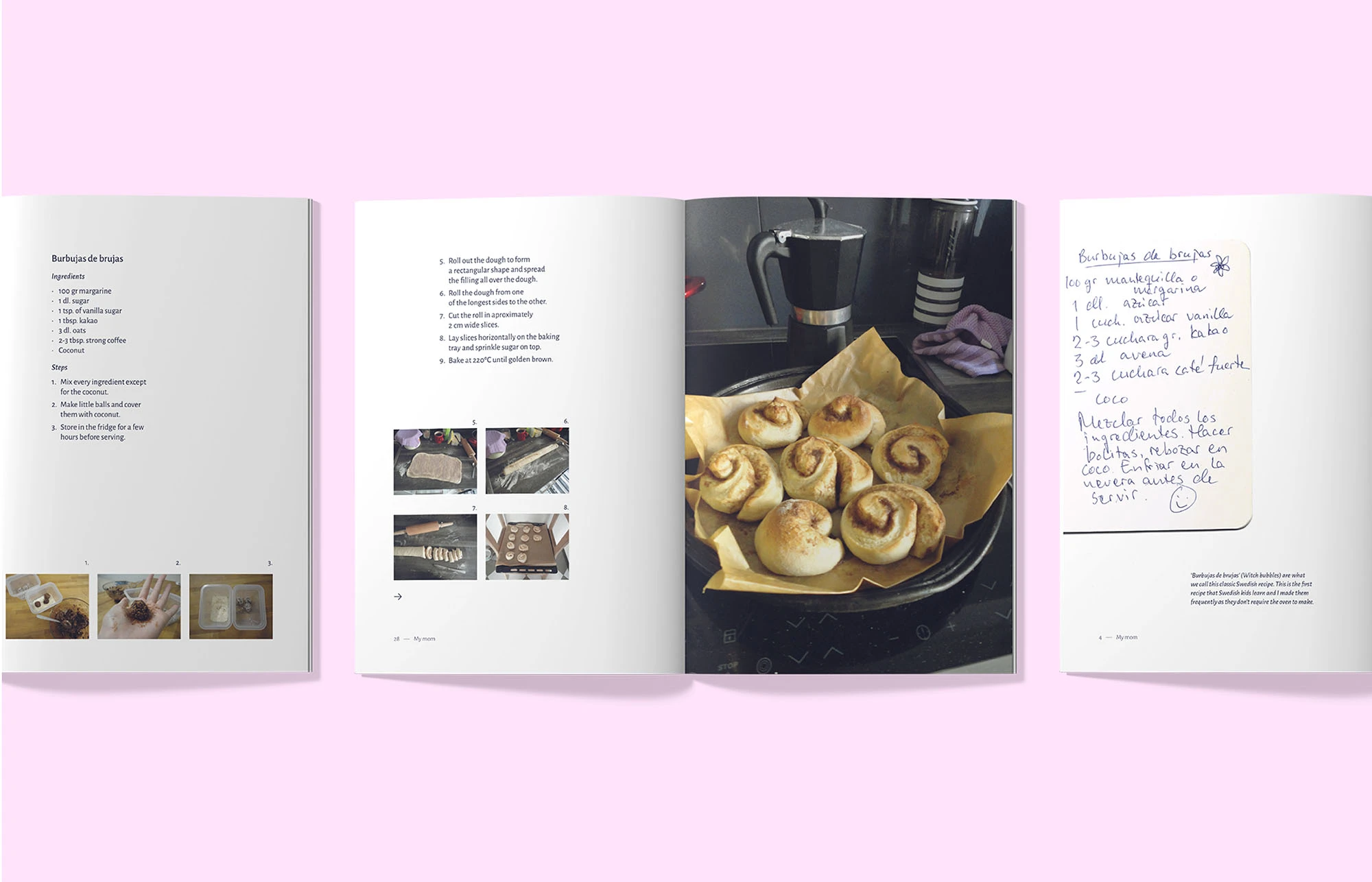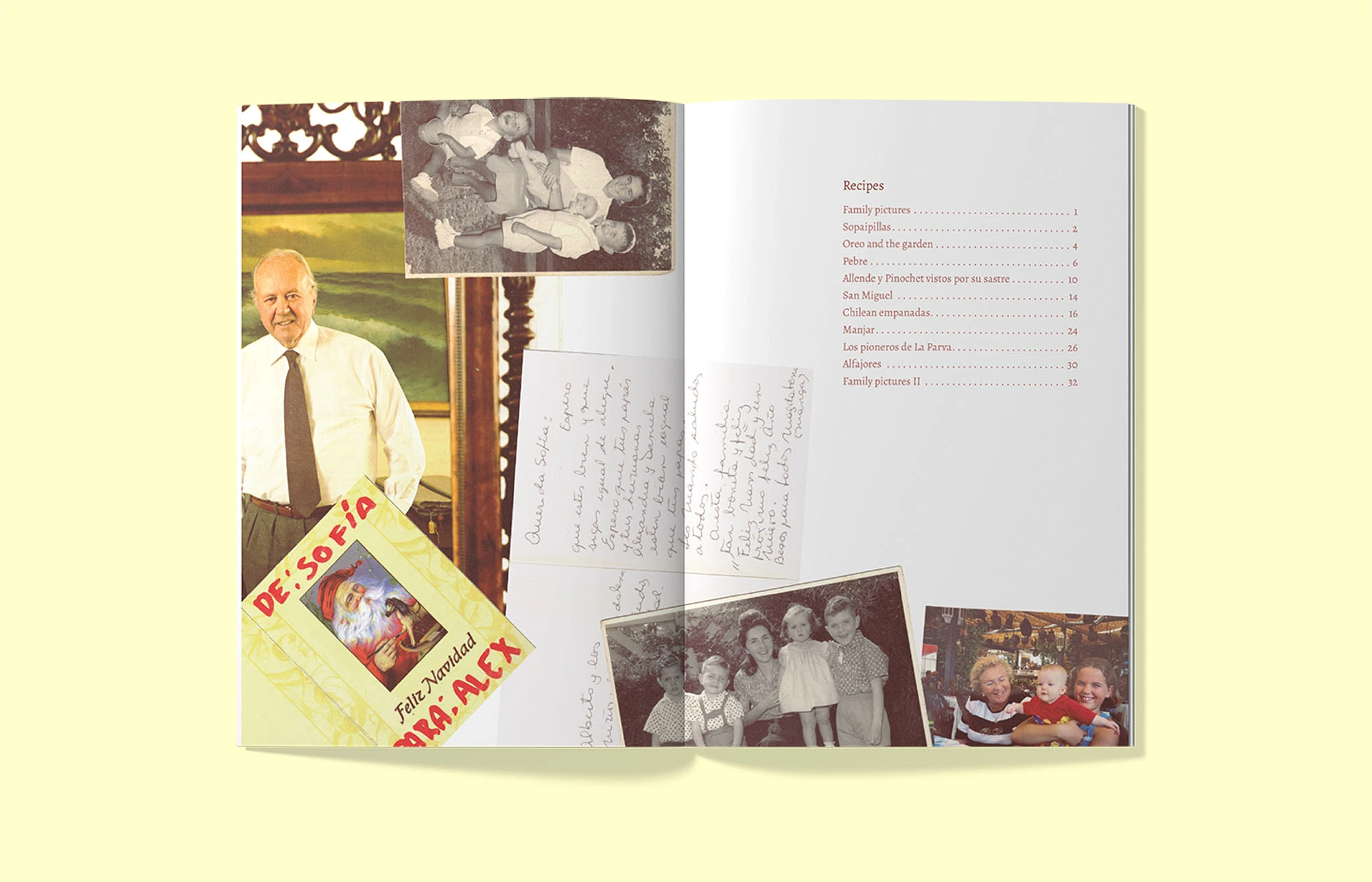 Photographed and styled recipes with a natural, homemade aesthetic. Differentiated each book through typography, color, and composition—bold serif and deep red for Chilean recipes, light sans-serif and soft blue for Finnish dishes—while unifying both with a handmade, scrapbook-like feel that evokes family memories and traditions.