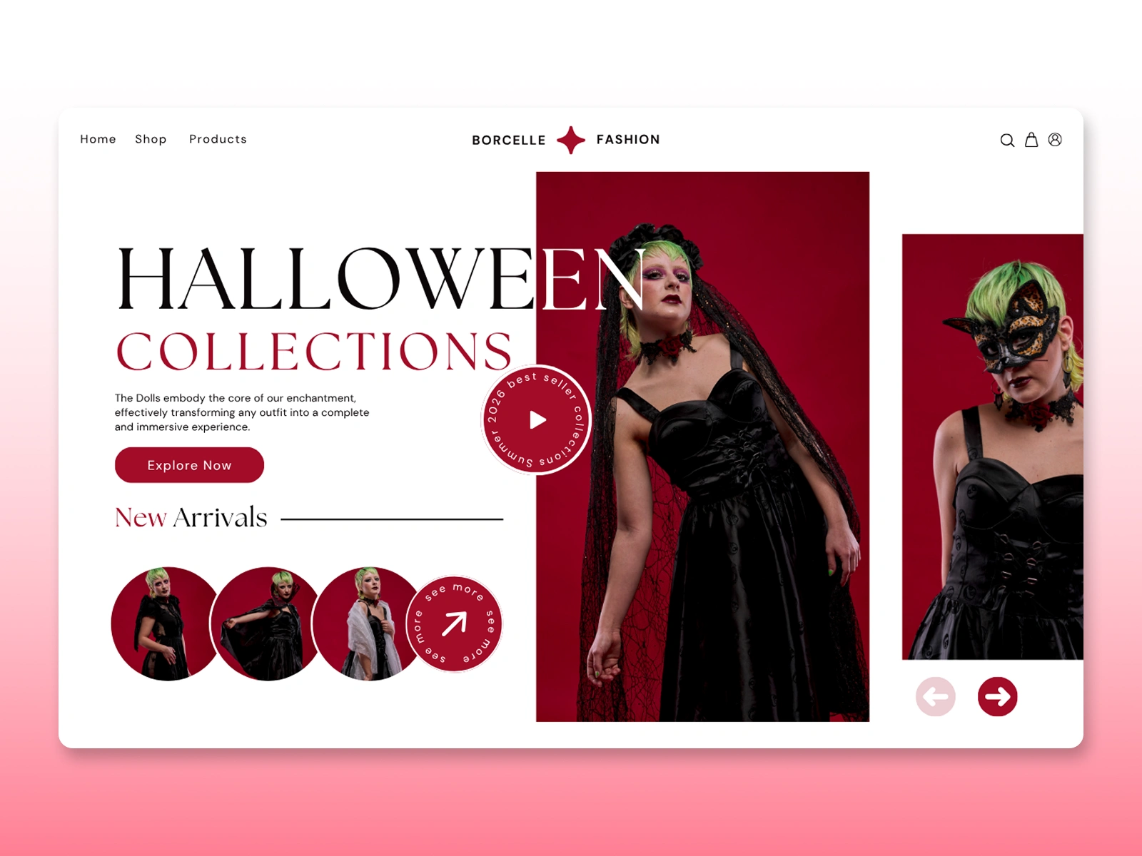Borcelle Fashion needed to create a themed landing page to promote their Halloween Collection. The objective was to immediately capture the collection's dark, dramatic, and edgy aesthetic, drive excitement around the new arrivals, and encourage users to explore the full range of costumes and accessories.