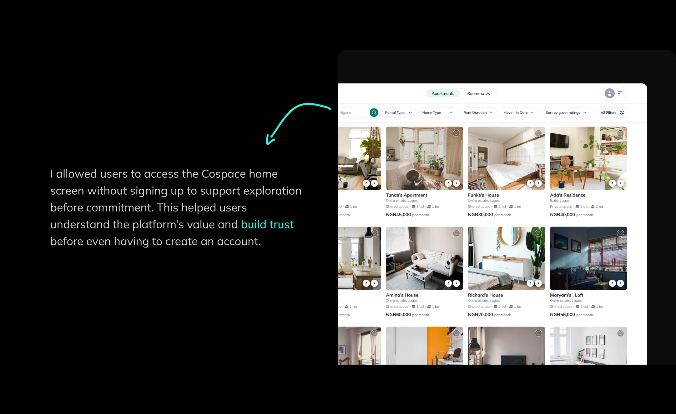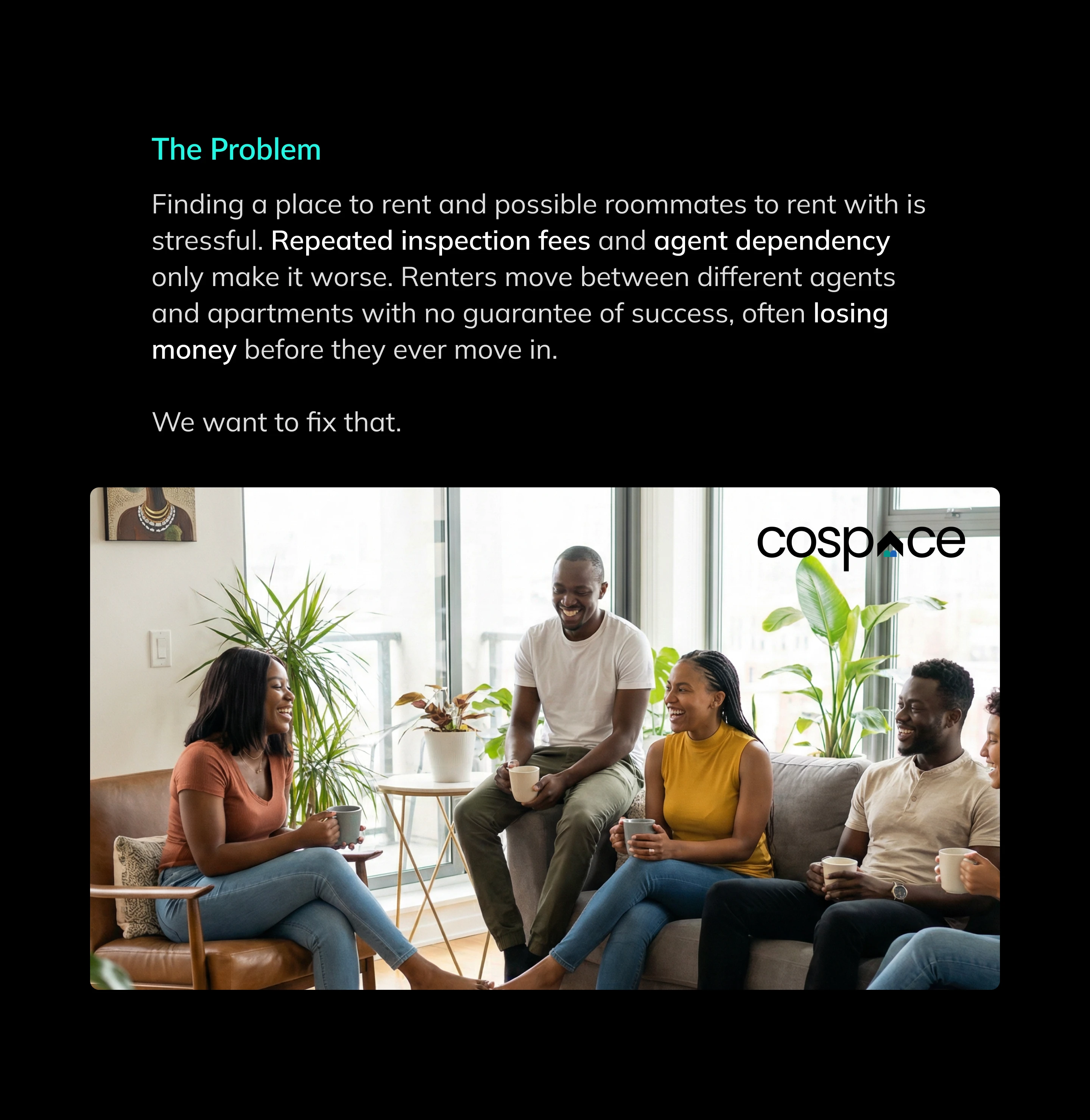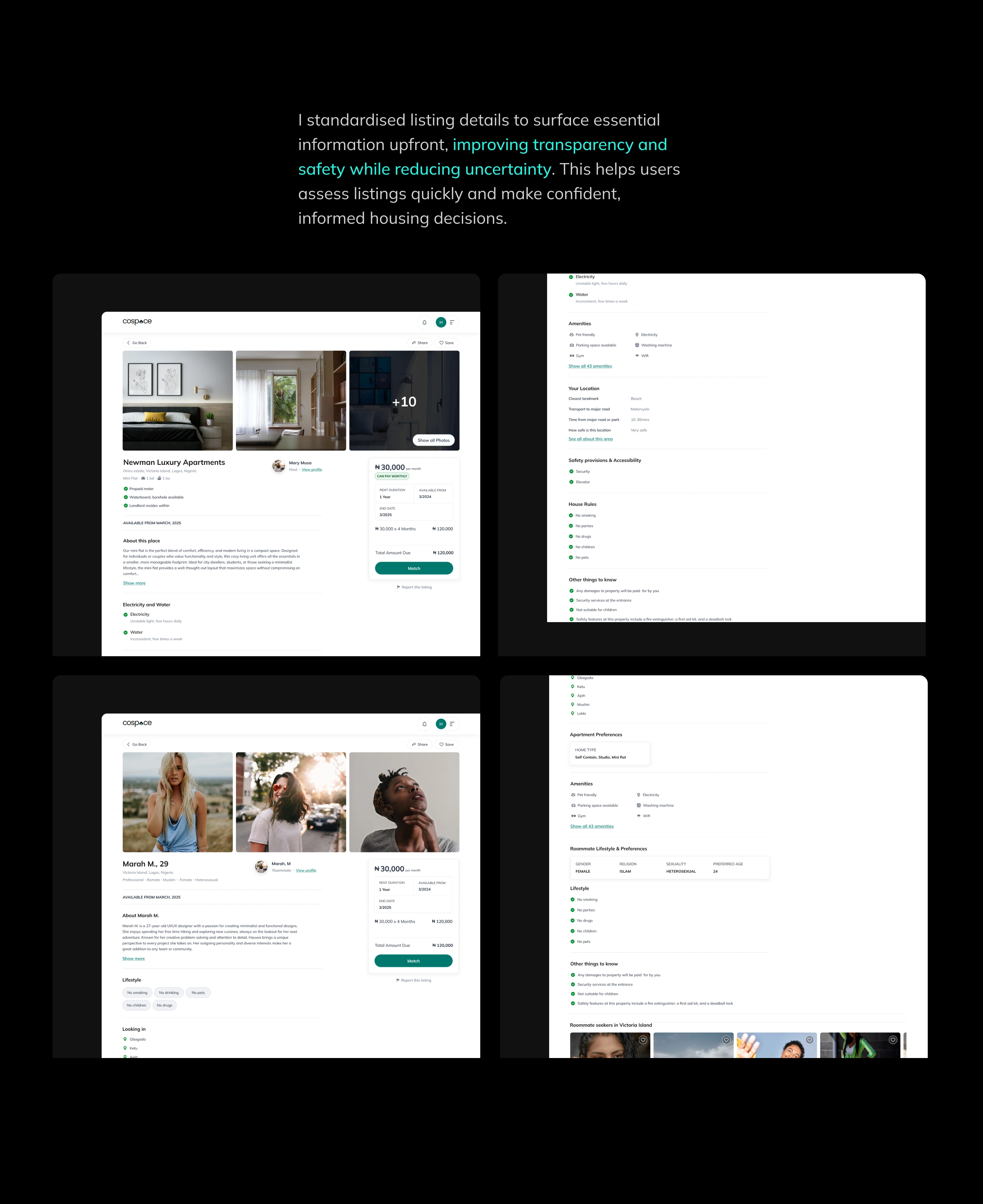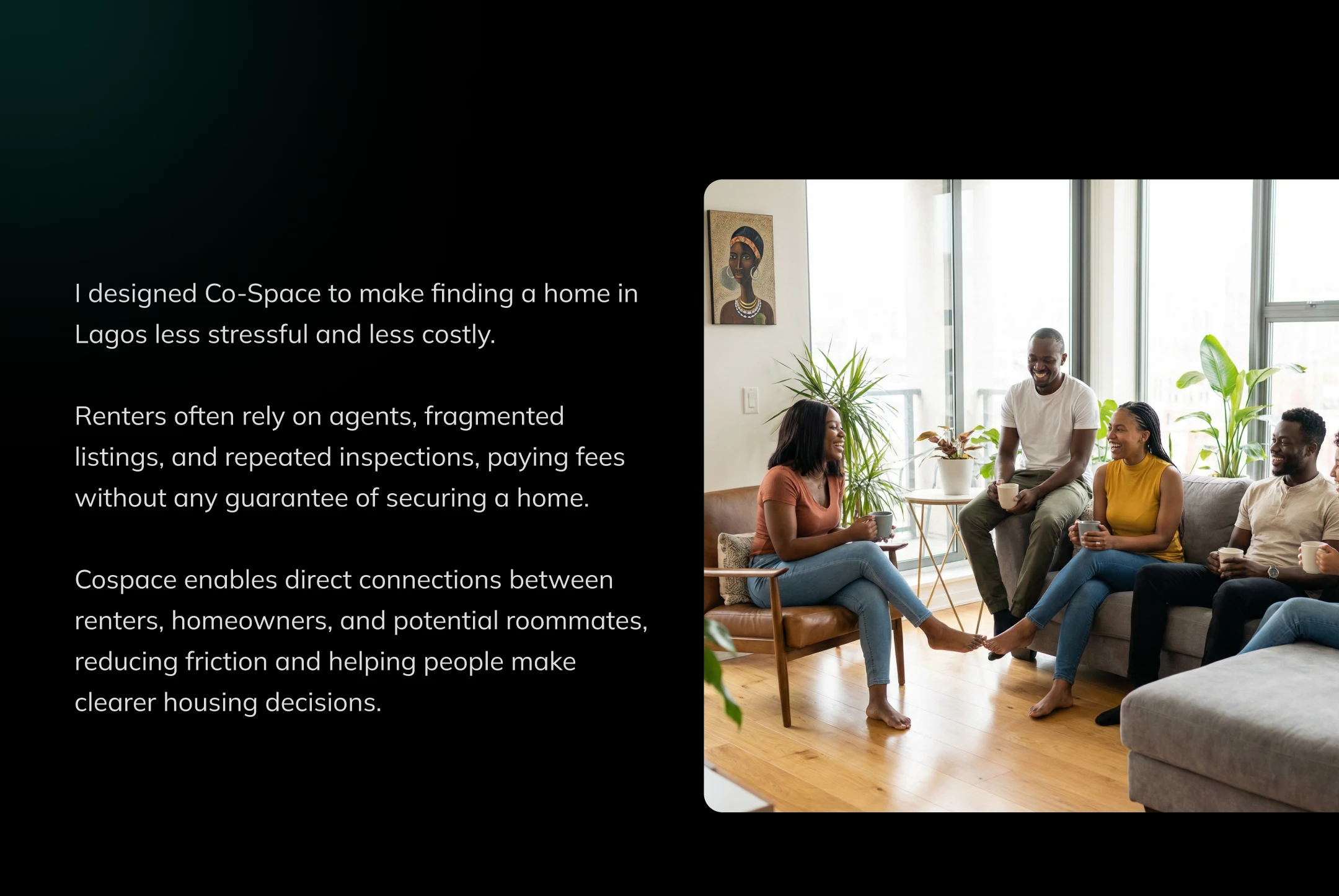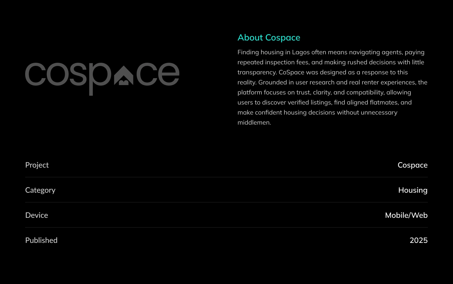 CoSpace is a Lagos-based housing platform that connects apartment owners and renters directly, eliminating agent fees and unnecessary middlemen. Unlike traditional property platforms, CoSpace enables users to find long and short term rentals, co-renting partners, and shared living options through verified listings, smart matching, and direct communication, making home search faster, more transparent, and more affordable.