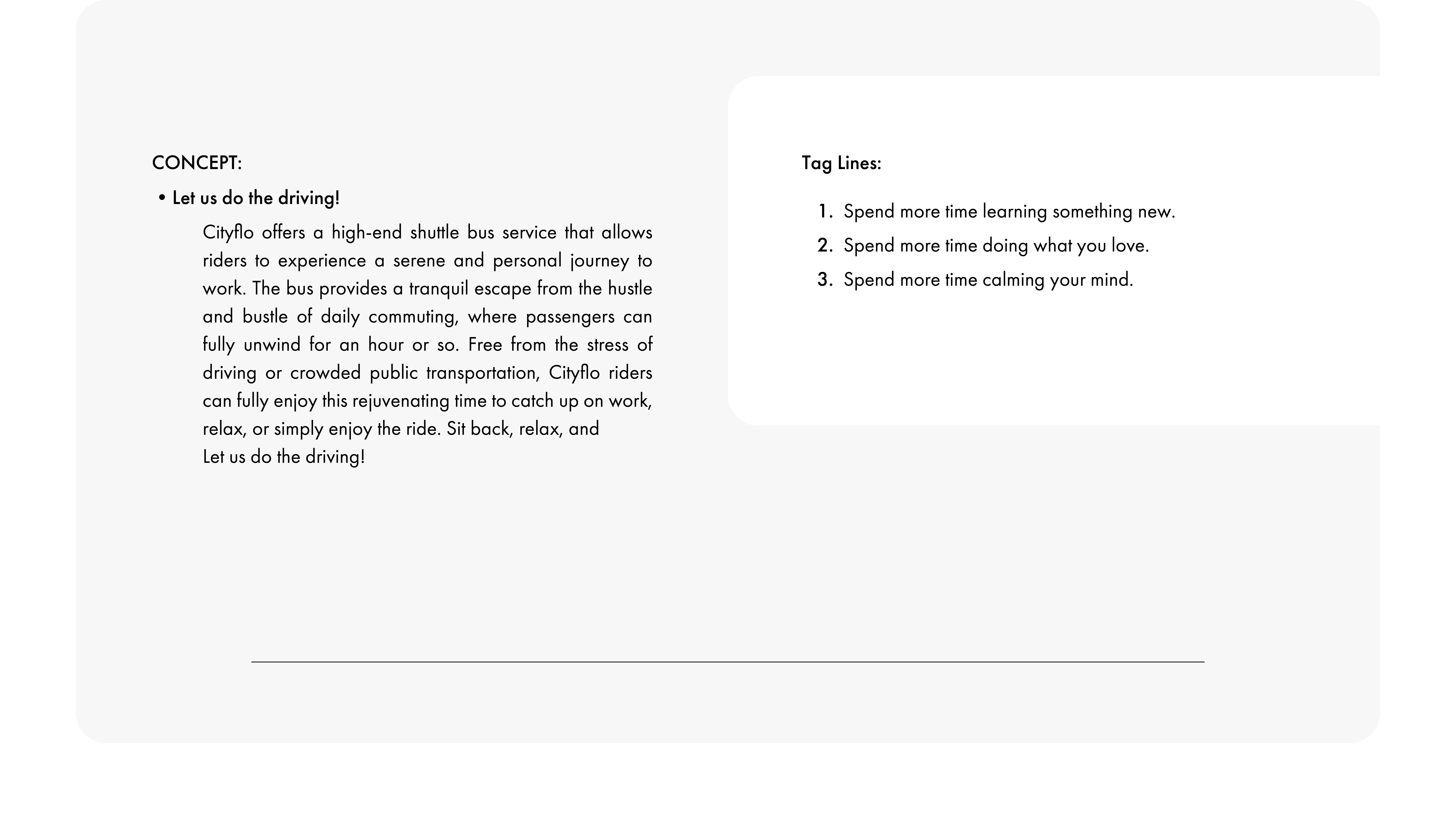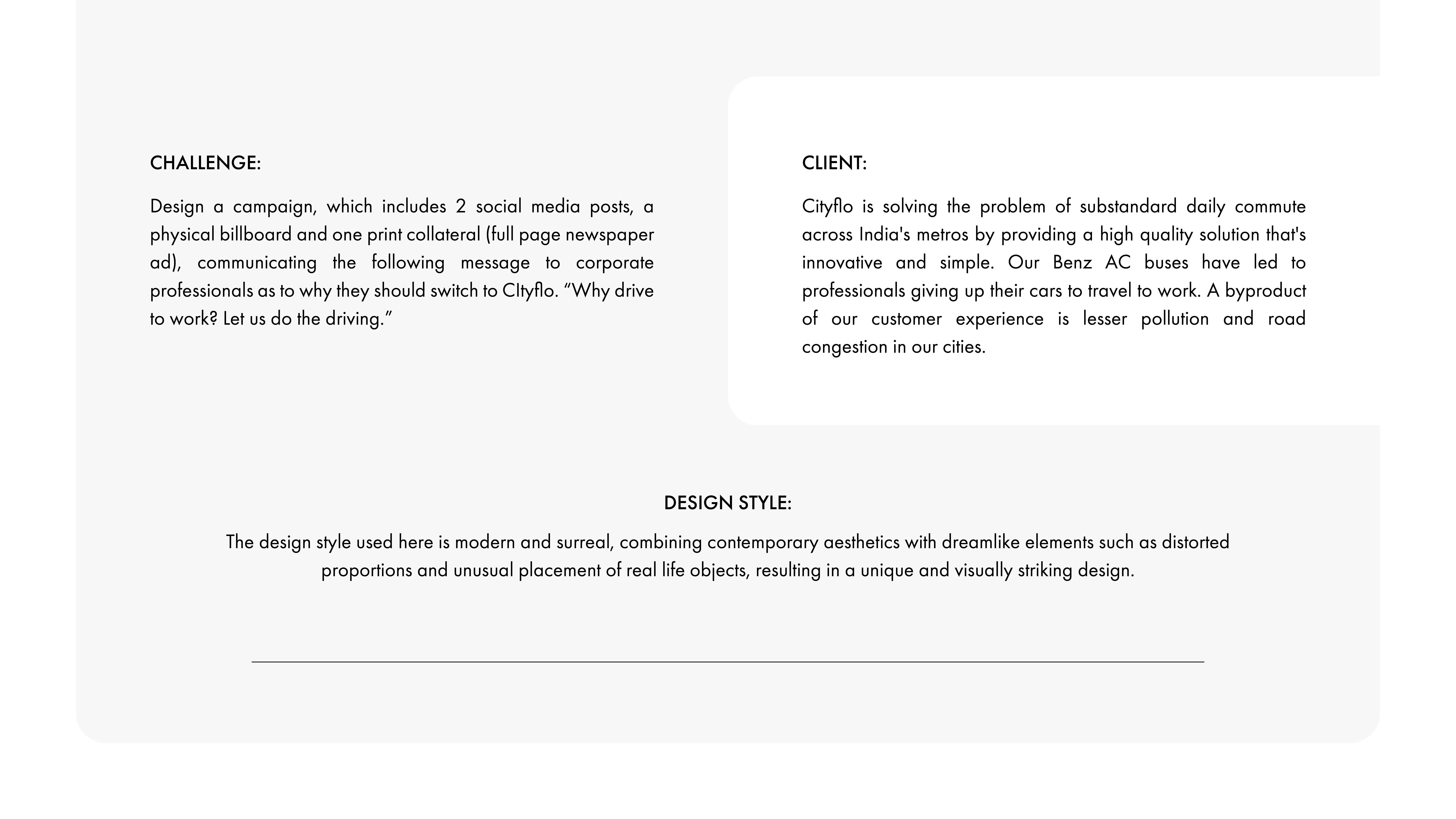 Designed a surreal, modern campaign for Cityflo: “Why drive to work? Let us do the driving.” Encourages riders to relax and enjoy their daily commute.