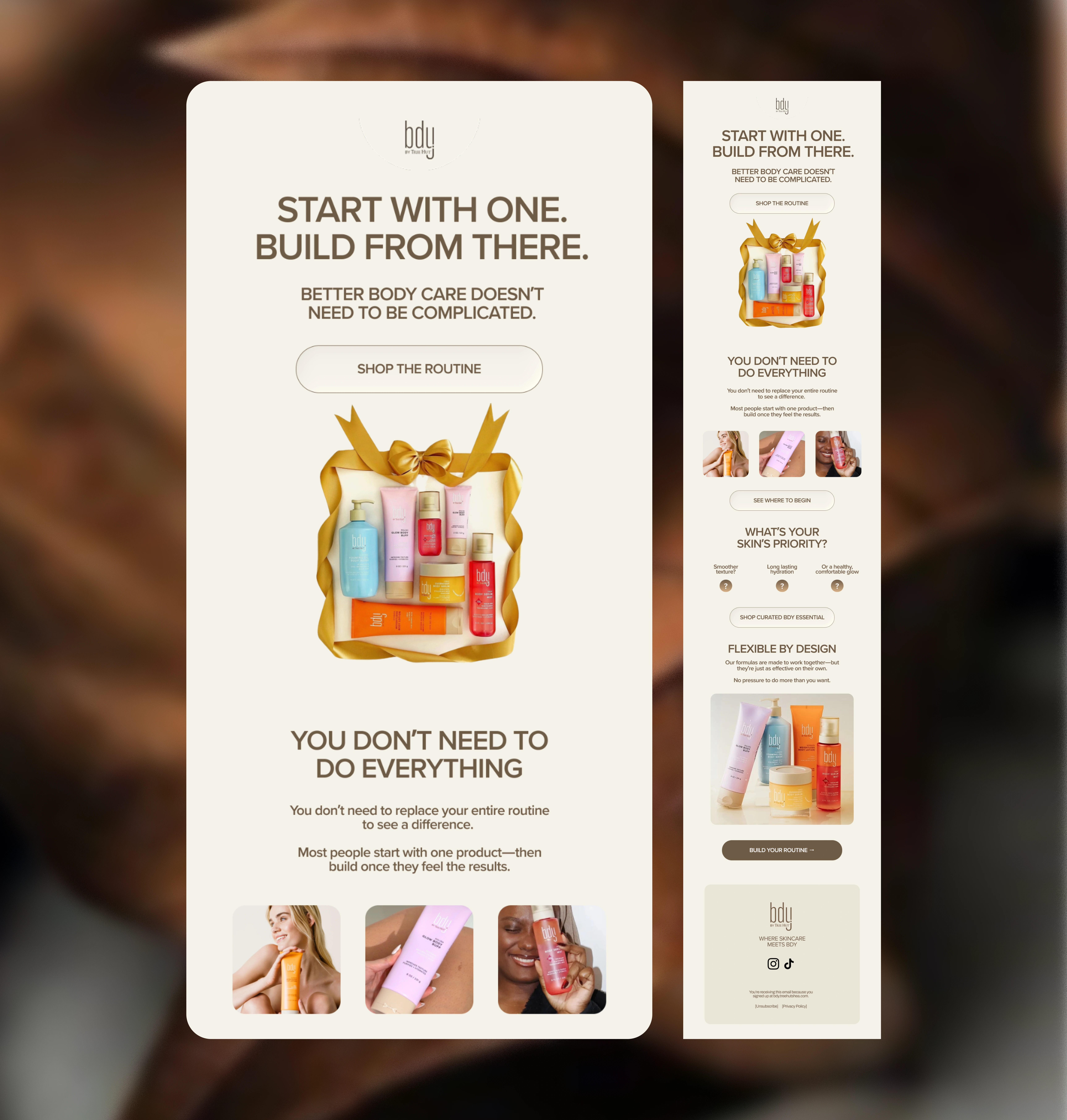 Designed a three-email welcome flow concept for BDY by Tree Hut, a body-care brand focused on skincare-level ingredients and simplified routines. The goal of the flow was to introduce the brand philosophy, educate new subscribers, and guide them toward building a routine without overwhelming them.