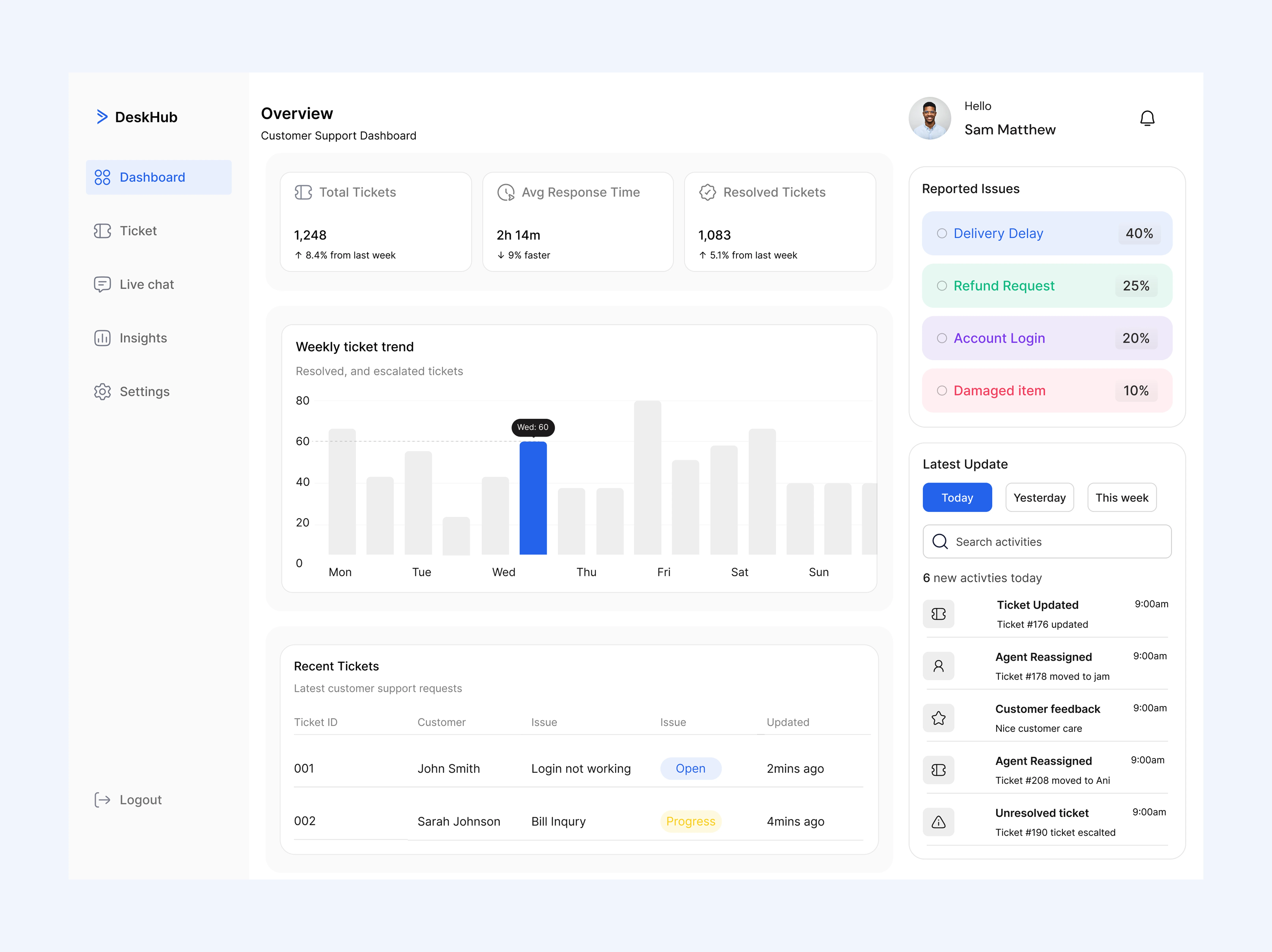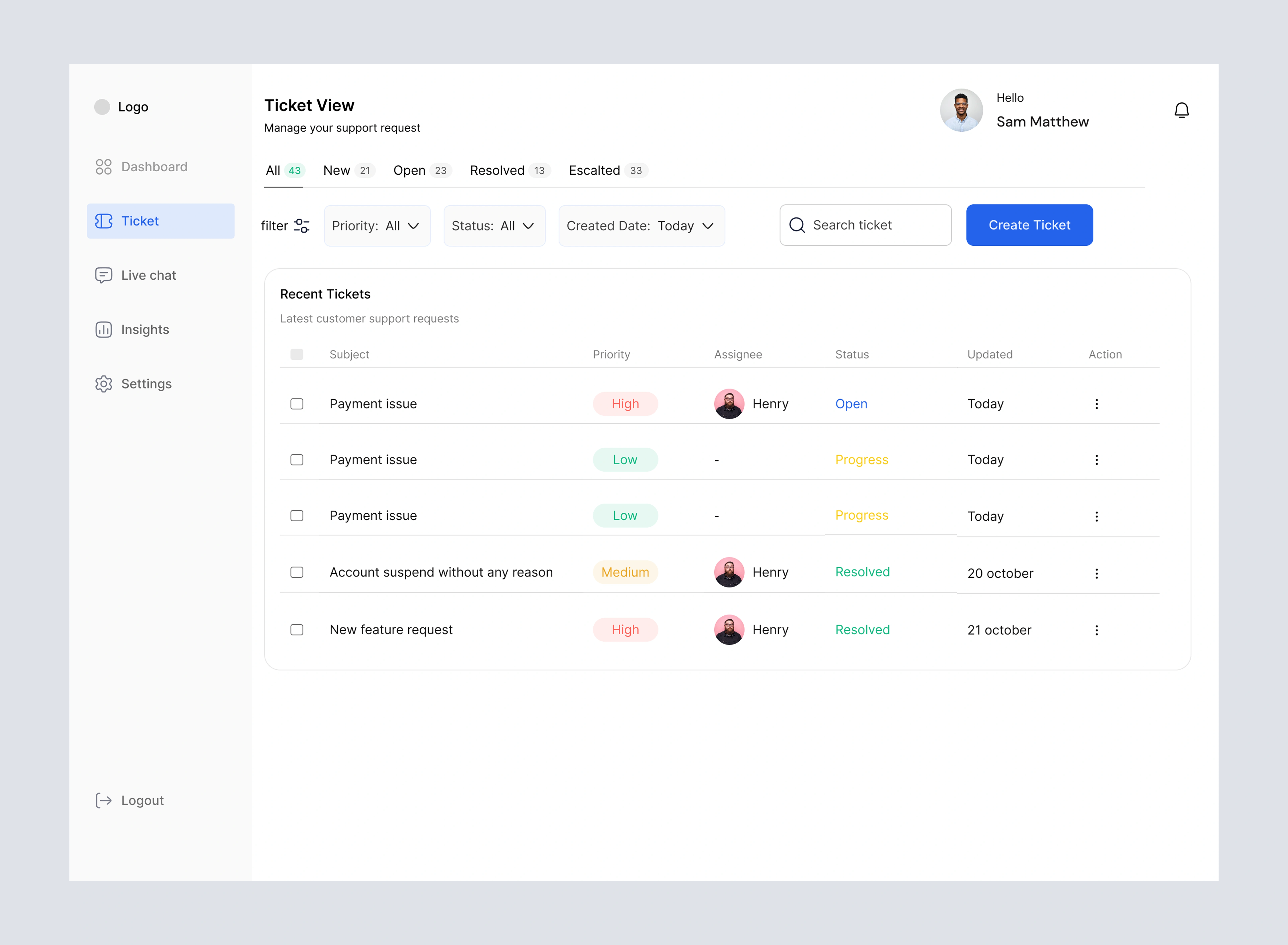 The system provides a centralized Tickets Navigation screen where all support tickets are listed with key details such as subject, customer name, assigned agent, status, priority, and last updated time. From this screen, admins can create new tickets, assign them to agents, and track progress in real time.