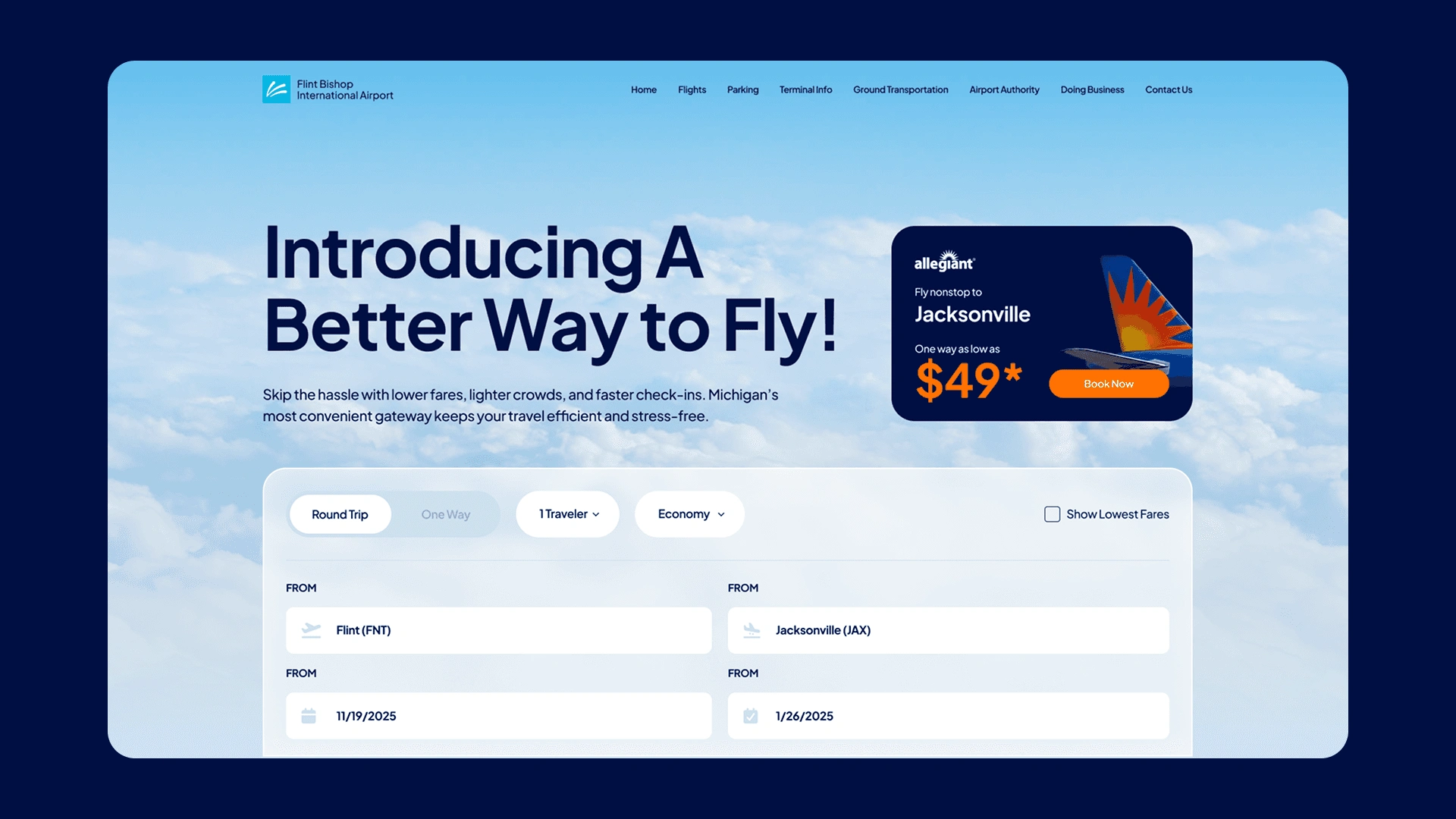 Located in Flint, Michigan, Flint Bishop Airport (FNT) is a trusted regional travel hub designed around community and accessibility. Passengers can reach international destinations in one stop or less, making global travel simpler, closer, and more convenient.
