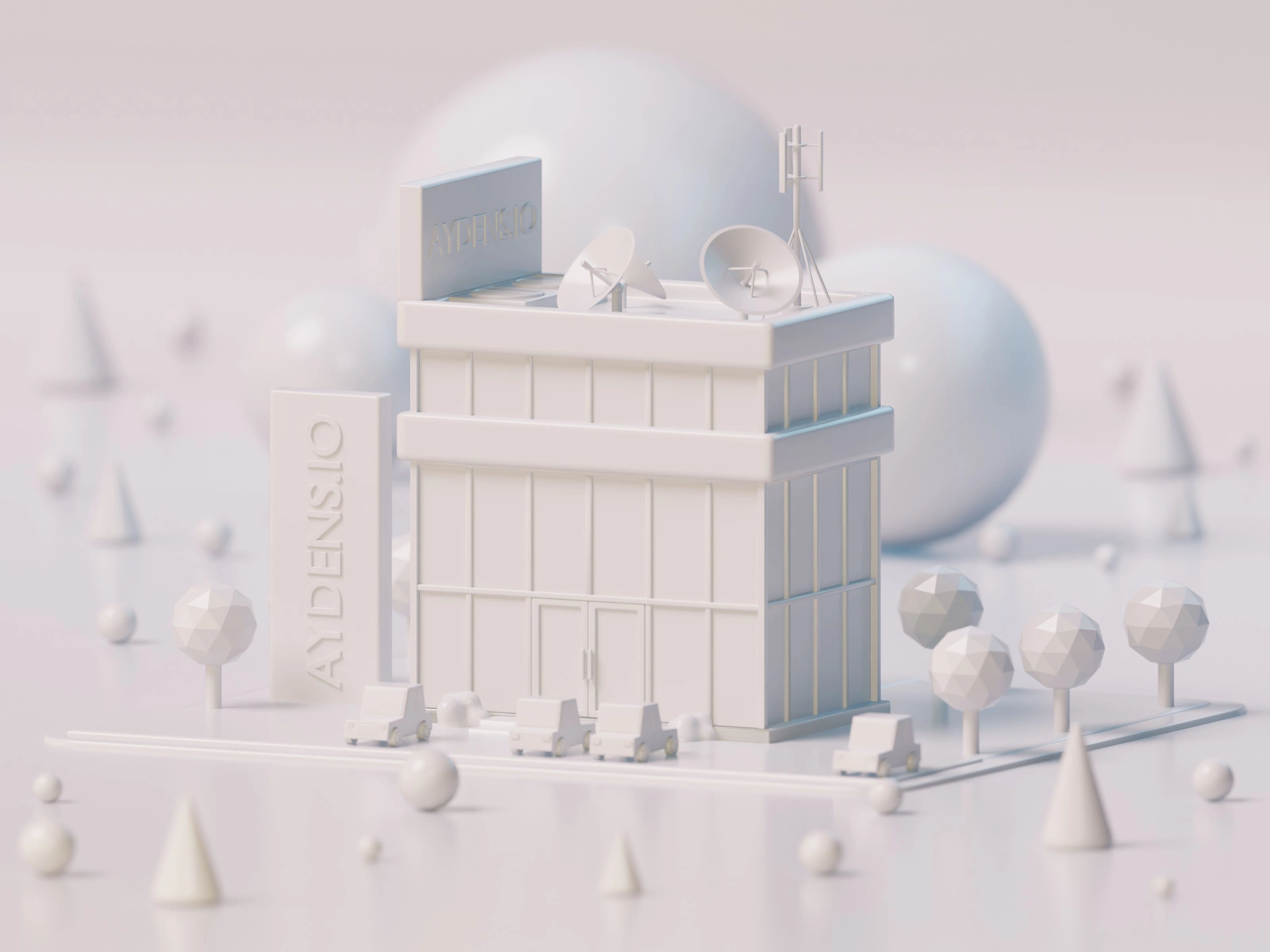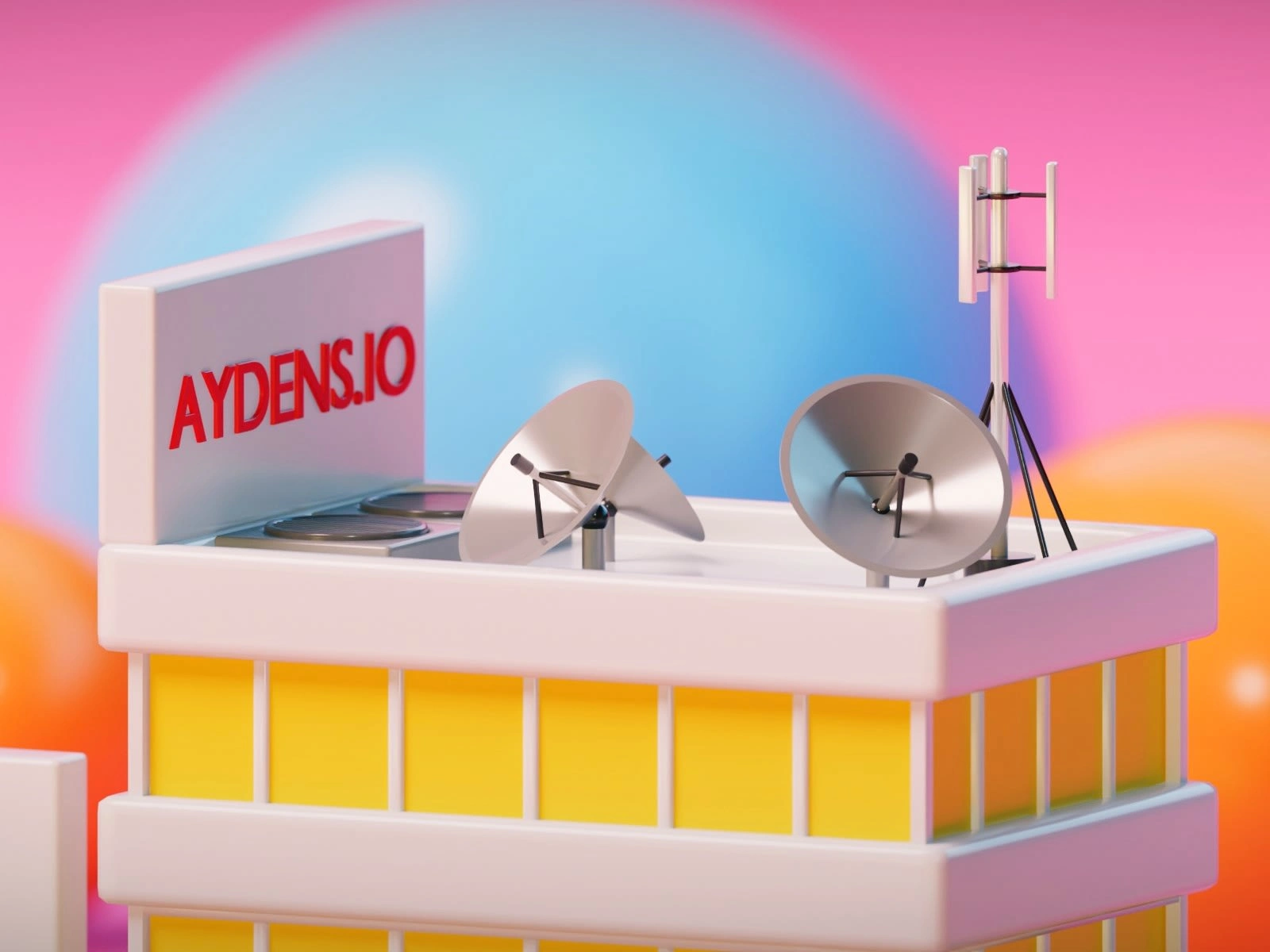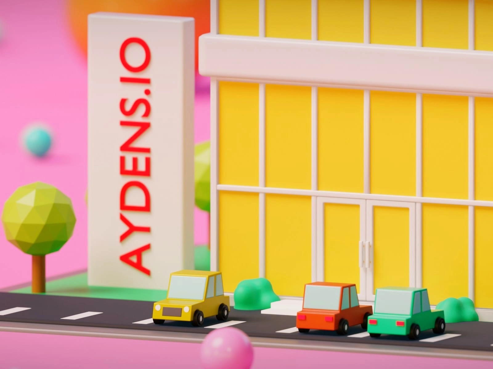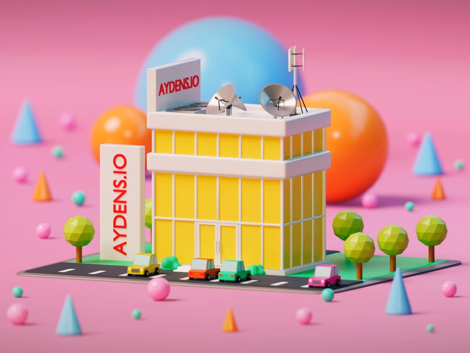 Aydens.io sign—set against a whimsical pink backdrop with oversized cones and spheres, blending corporate identity with creative flair. A perfect mix of modern architecture and cheerful minimalism.