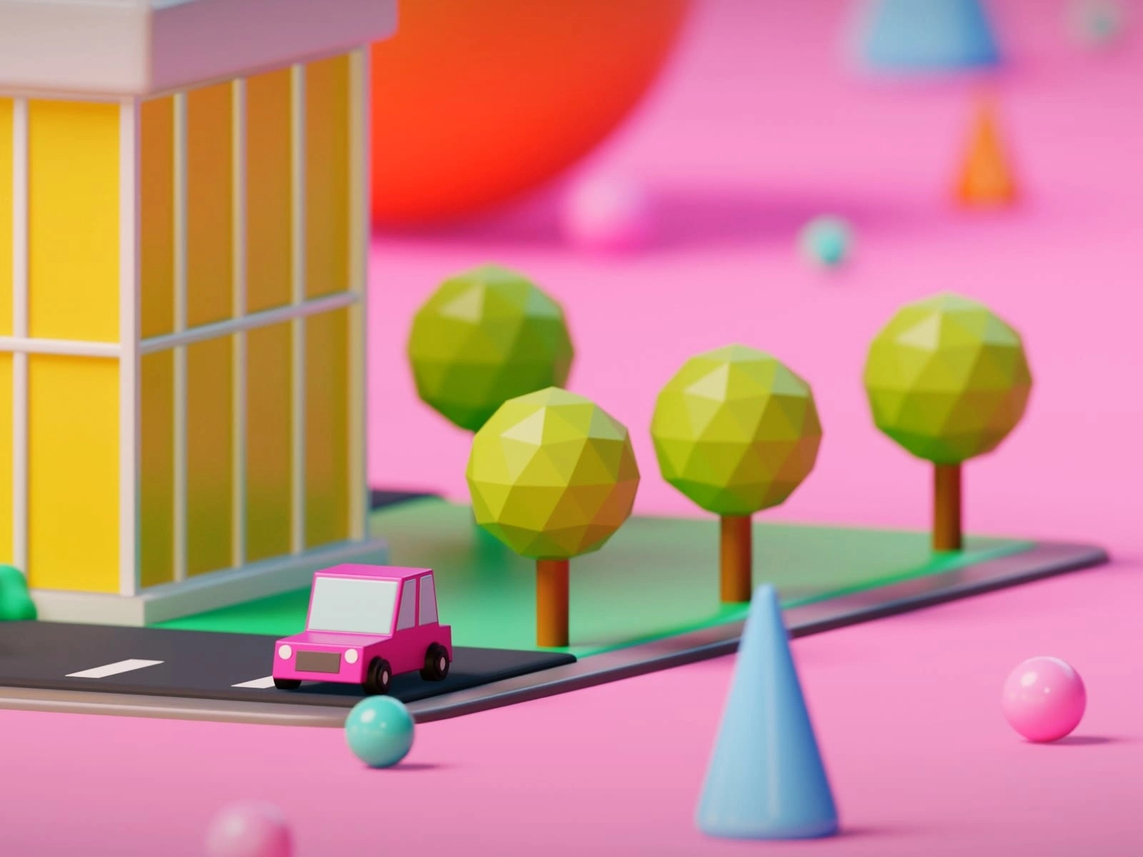A vibrant, stylized office building crafted in Blender as part of the