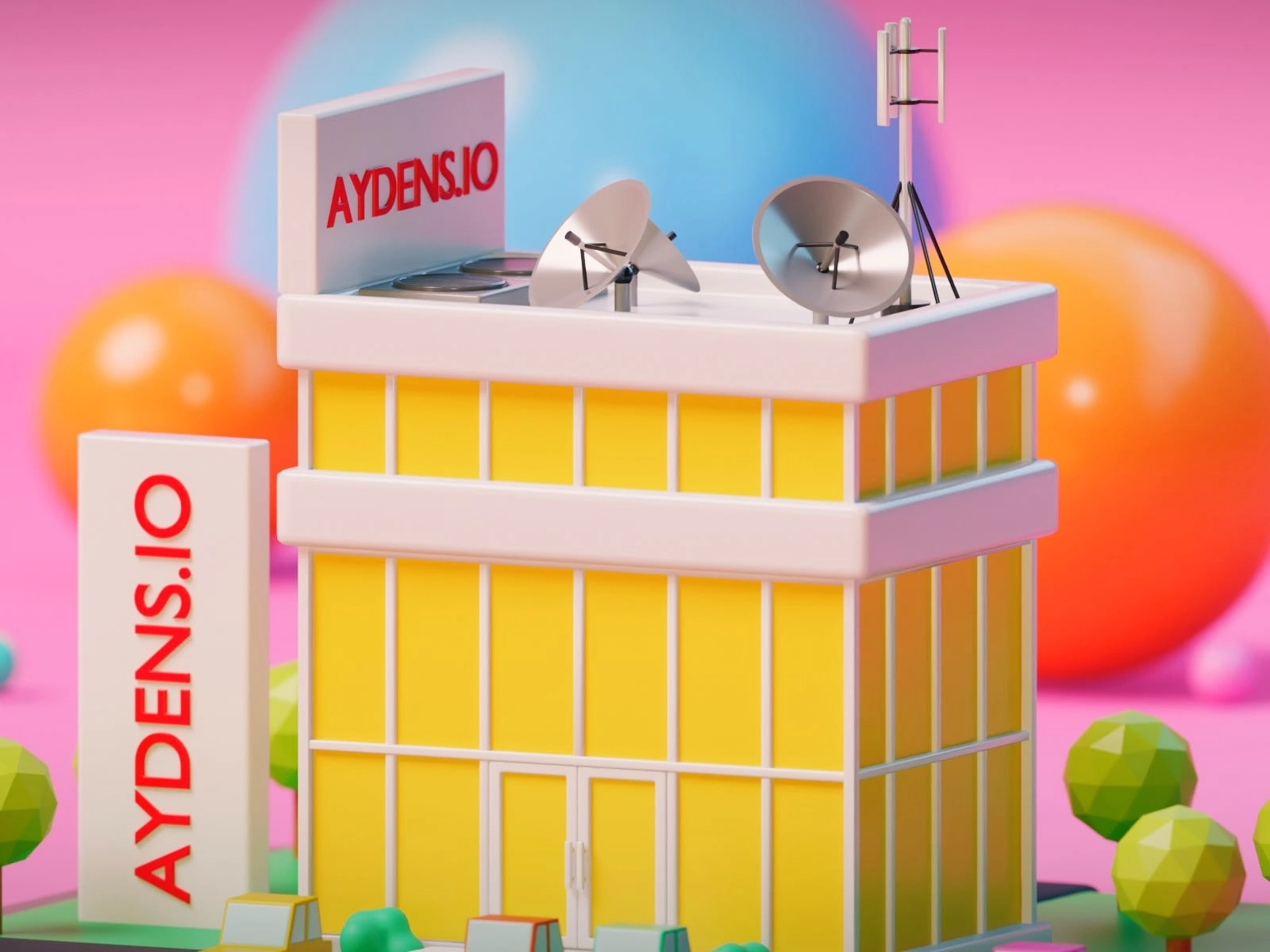 Aydens.io company, this scene captures a colorful, low-poly aesthetic with playful geometry. The bright yellow office tower is topped with satellite dishes and an antenna, signaling a tech-driven environment. The building is surrounded by charming details—miniature cars, geometric trees, and a bold
