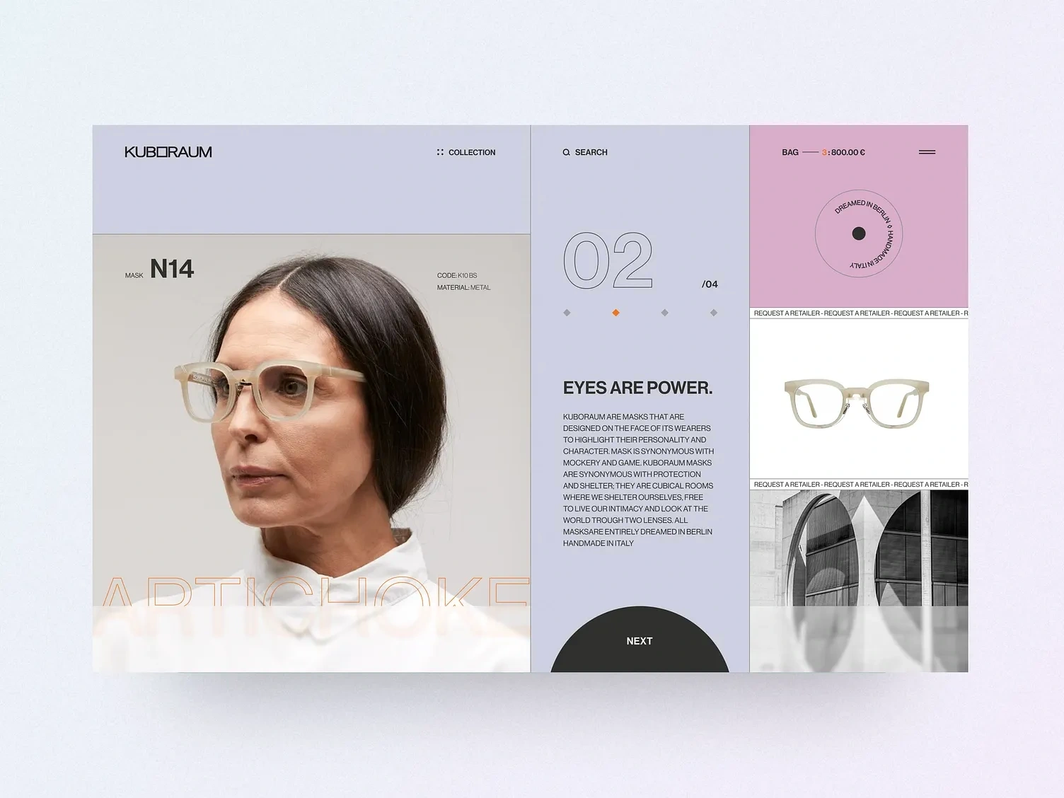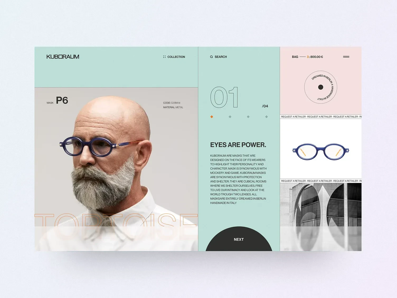 KUBORAUM — minimal, expressive concept site where glasses become masks. Clean UI, smooth animations, and a focus on character-driven design.