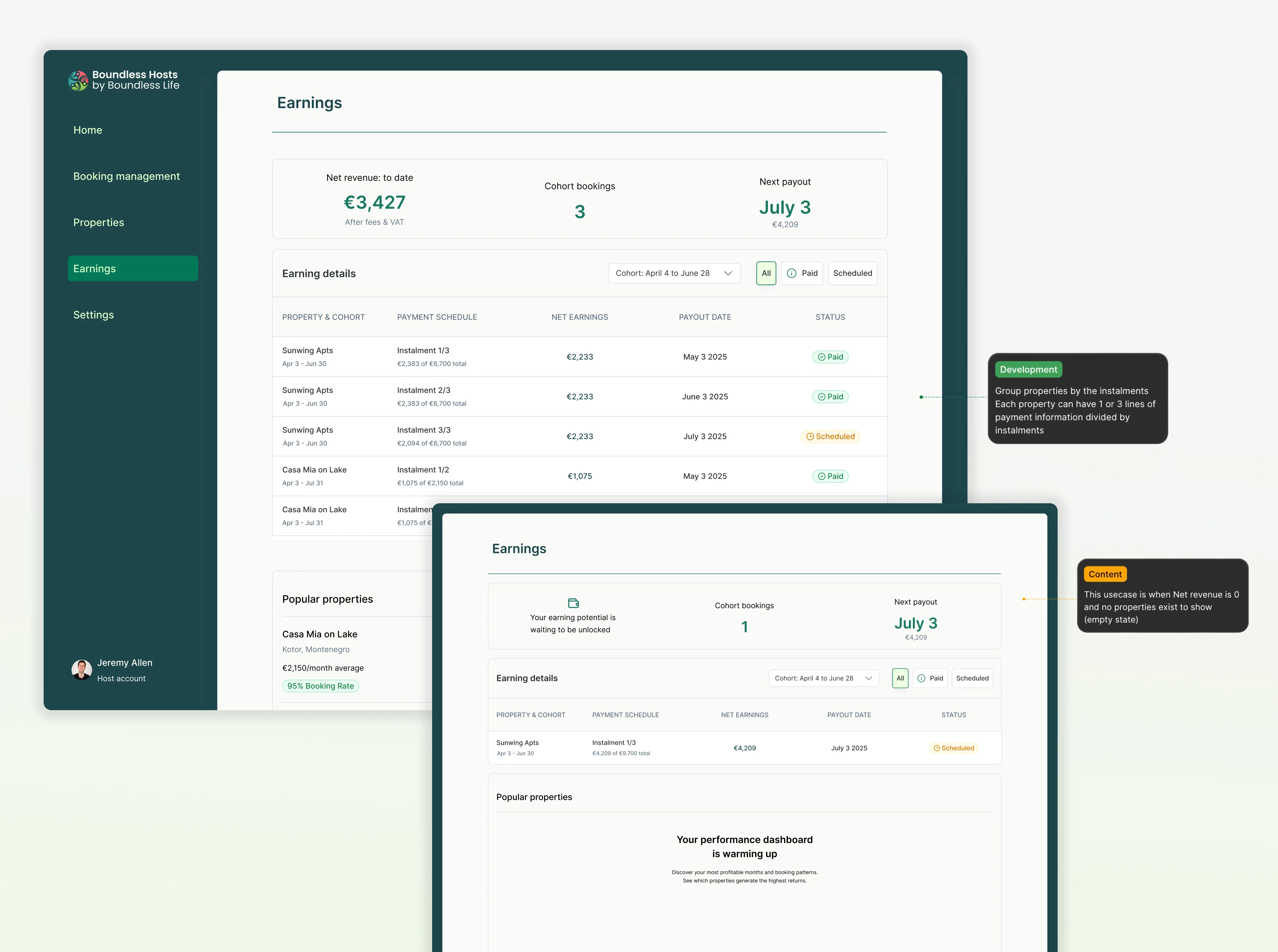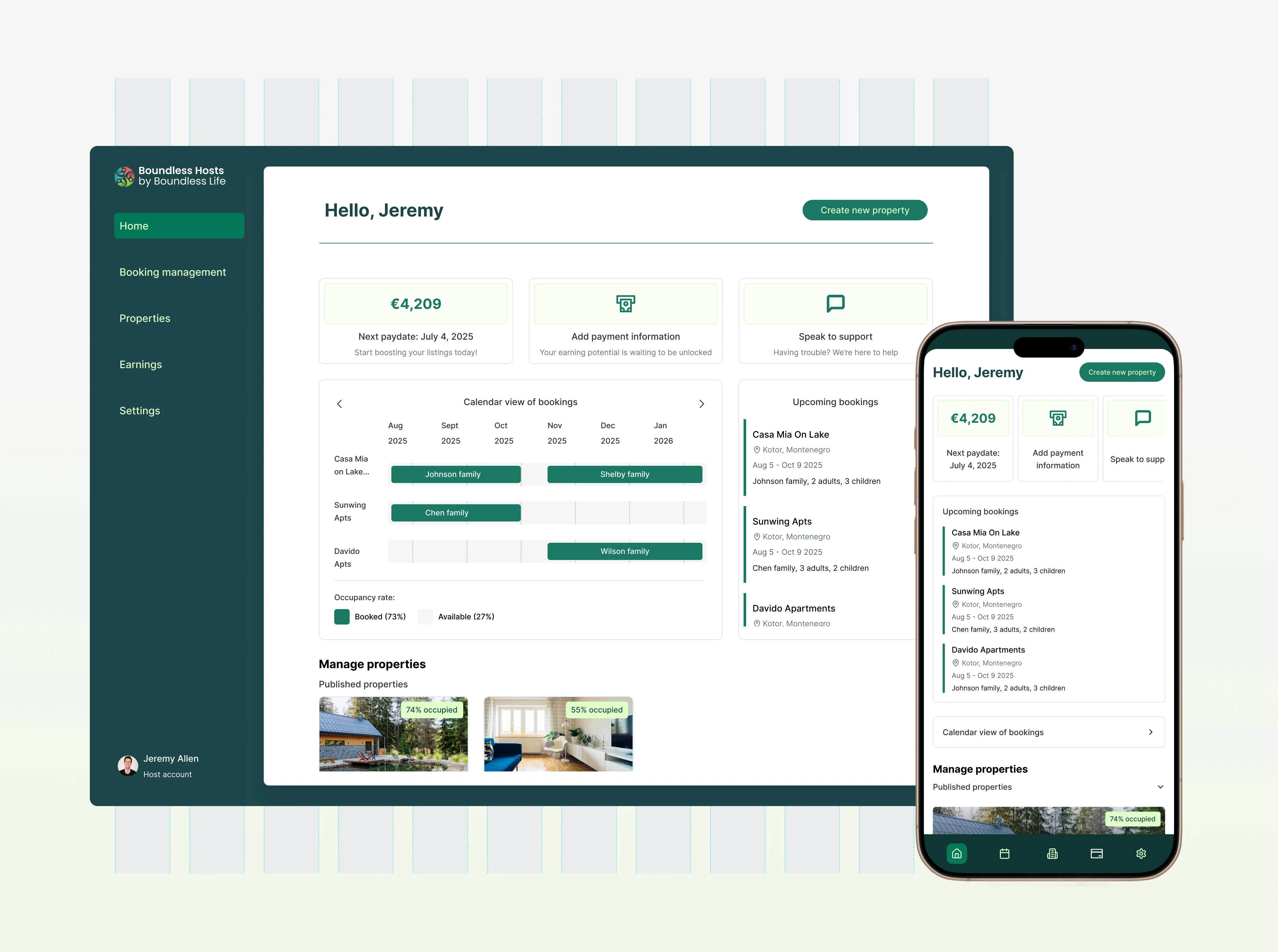 Designed closed to 20 unique screens which included a main dashboard, property creation, property management, availability management, booking management and an earnings dashboard