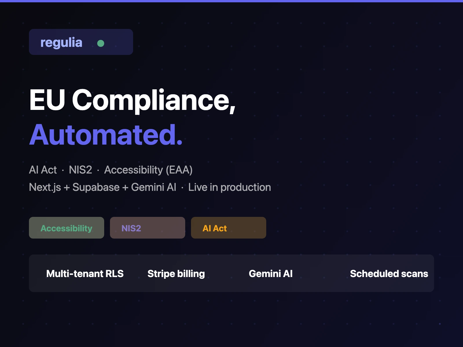 EU compliance SaaS: AI Act, NIS2, Accessibility (EAA). Multi-tenant RLS, automated scanning, Gemini AI docs, Stripe billing. Next.js + Vercel.