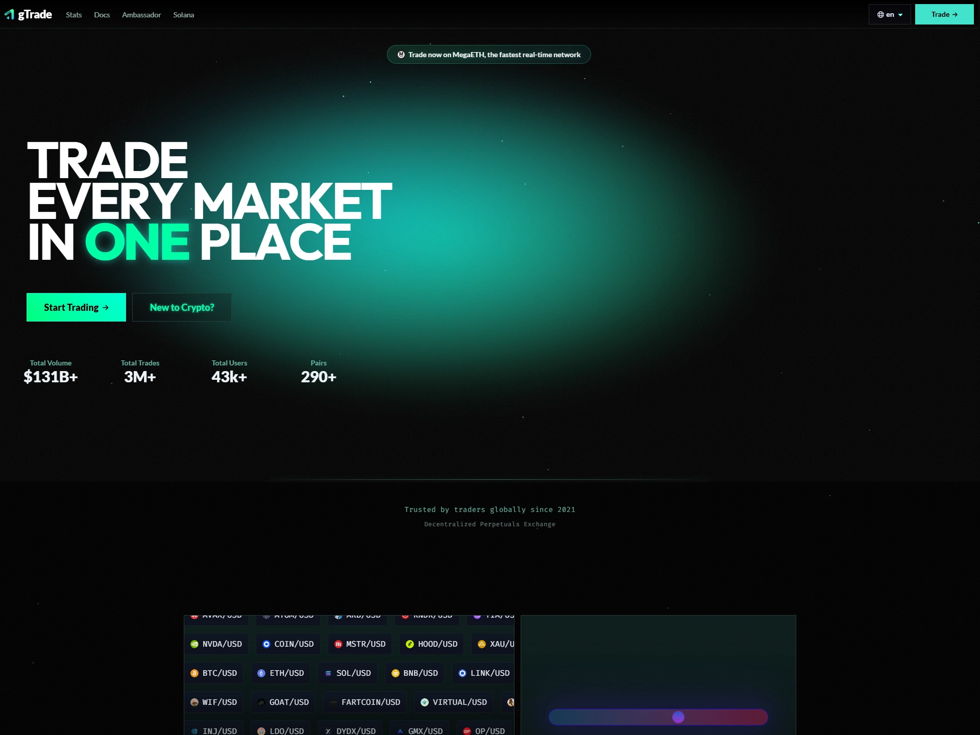 View real-time market stats, leverage options, and trading pairs