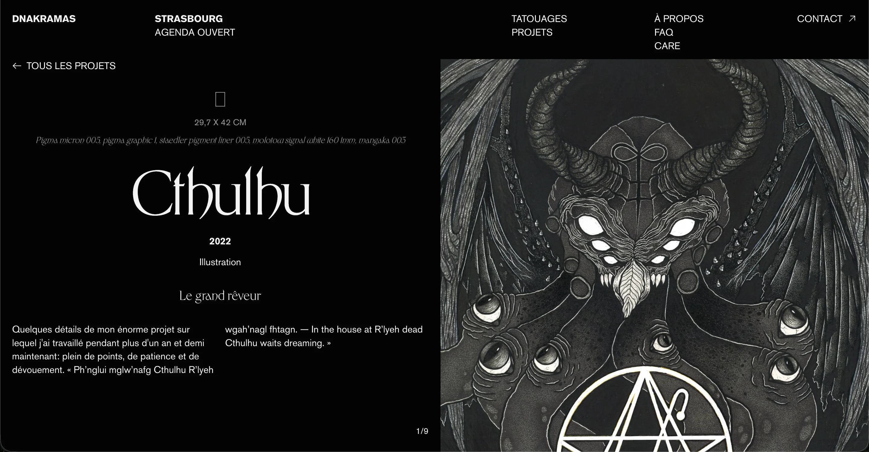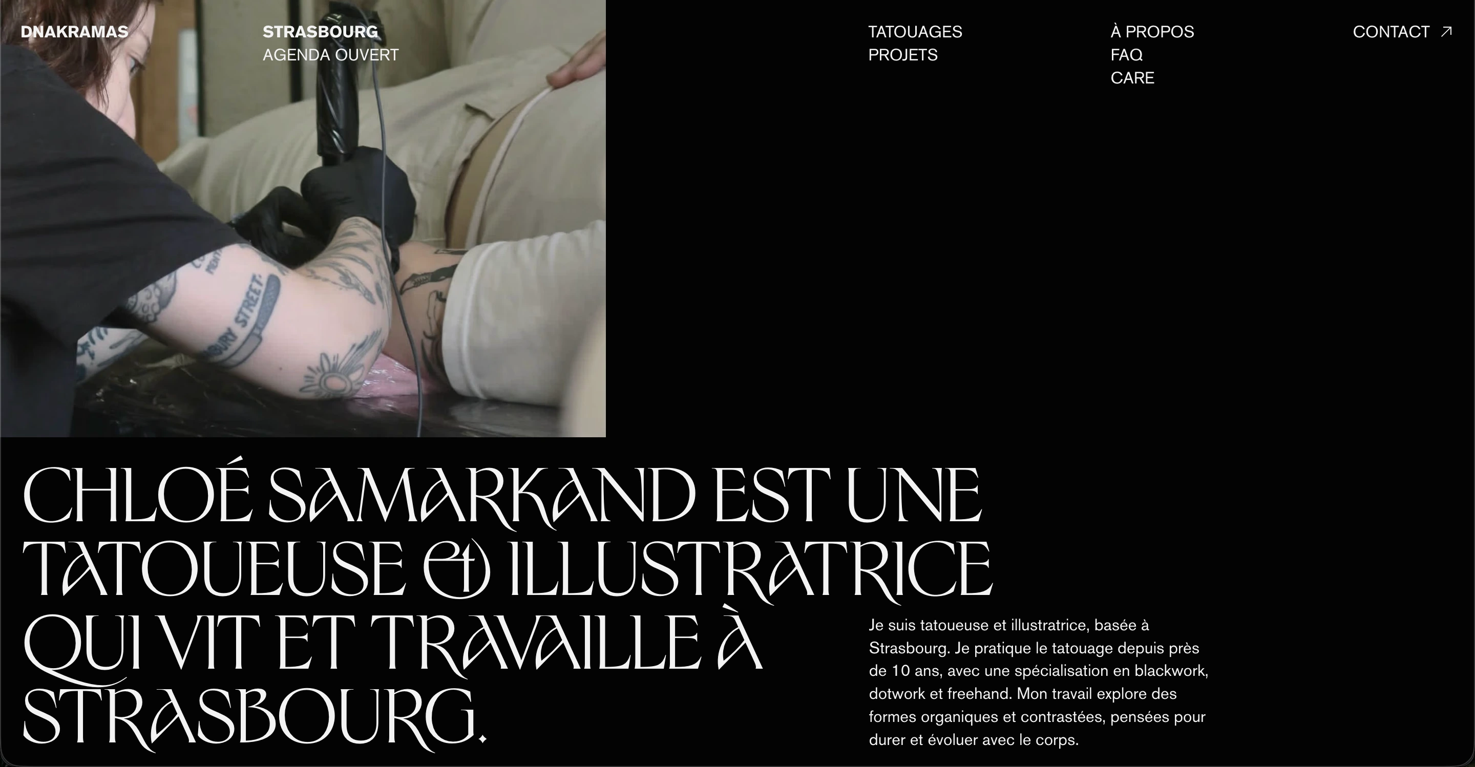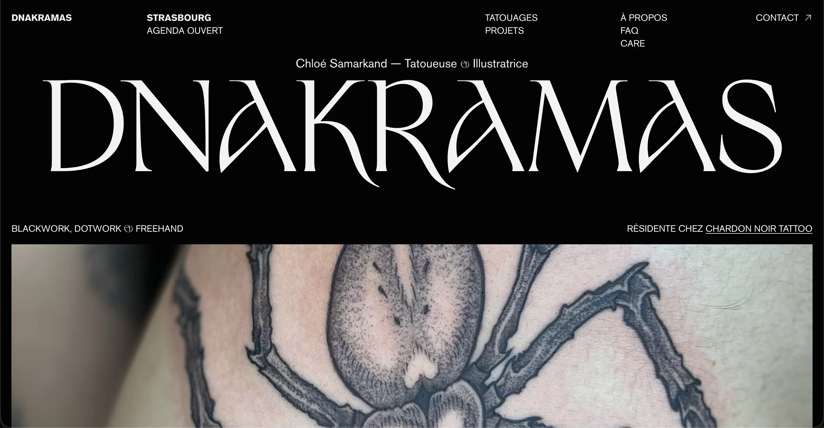 Chloé “Dnakramas” Samarkand is a French tattoo artist and illustrator from Strasbourg, France, she needed a website that felt as creative and immersive as the work she deliver, which delves into the realms of dark fantasy and cosmic horror.